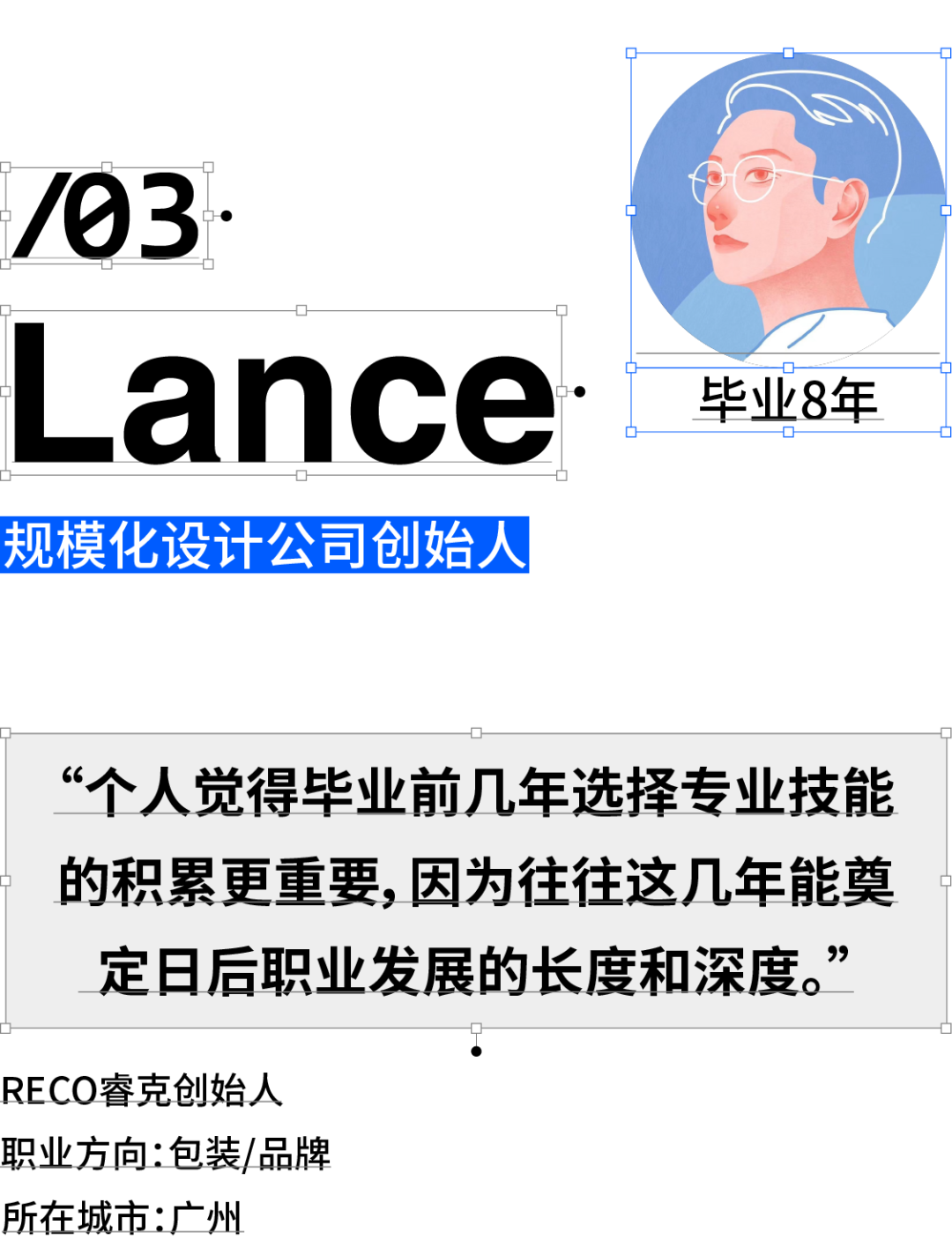 现居广州,已毕业9年。管理学跨专业设计师,RECO睿克创始人/创意总监,目前主要做新消费品视觉形象设计、产品包装设计,近期涉猎产品造型设计。