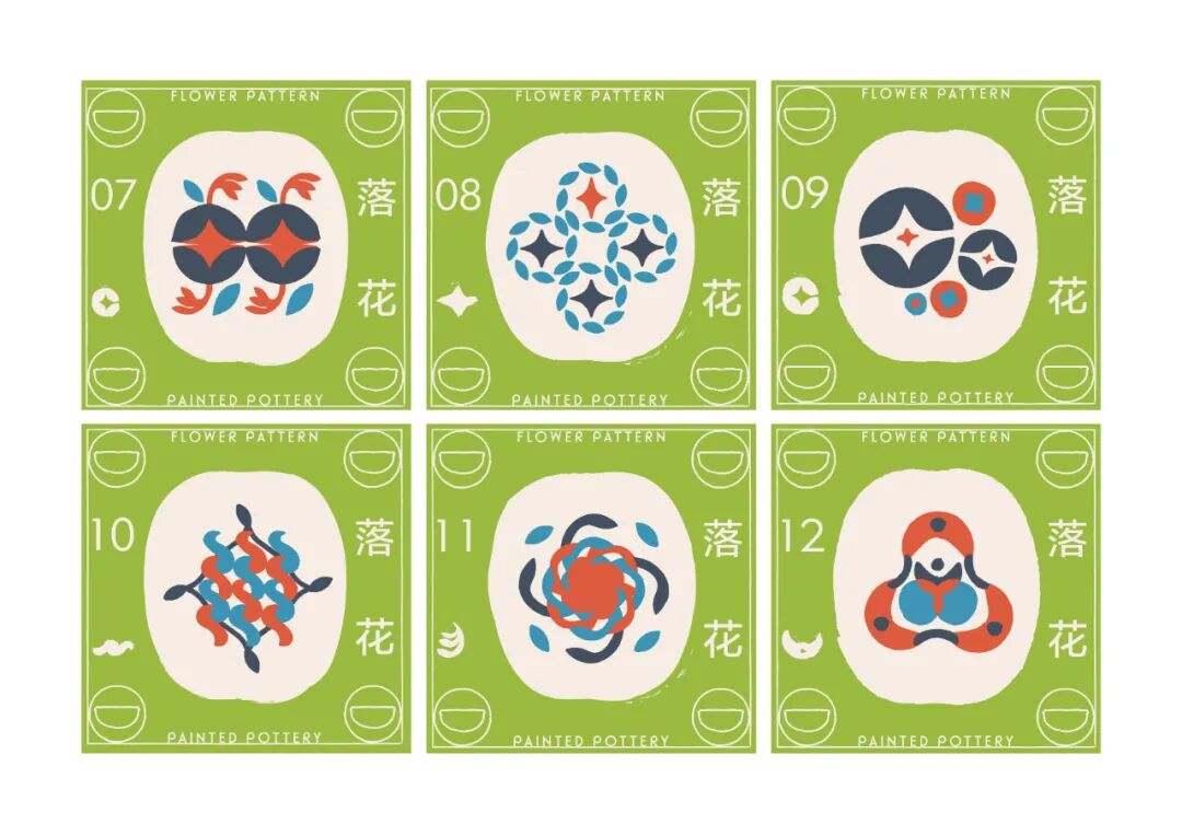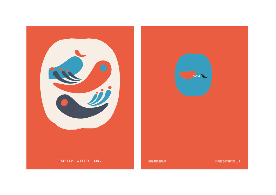 设计说明:“陶生万物”,意指万物生长。游鱼、飞鸟、落花无一不是远古人类的自然观察对象。古人将对美的观察融入进艺术的创作当中,彩陶纹饰的造型特征、造型原理中蕴含的本质规律如今仍然可以被现代审美装饰所借鉴及广泛应用。本次课题选取仰韶时期的鱼纹、鸟纹、花叶纹三类代表性纹饰进行再创作,将其提炼、打散再构组成新图形,希望以这种方式赋予传统纹饰更多的可能性,将这份来自远古的自然趣味赋予新生机。