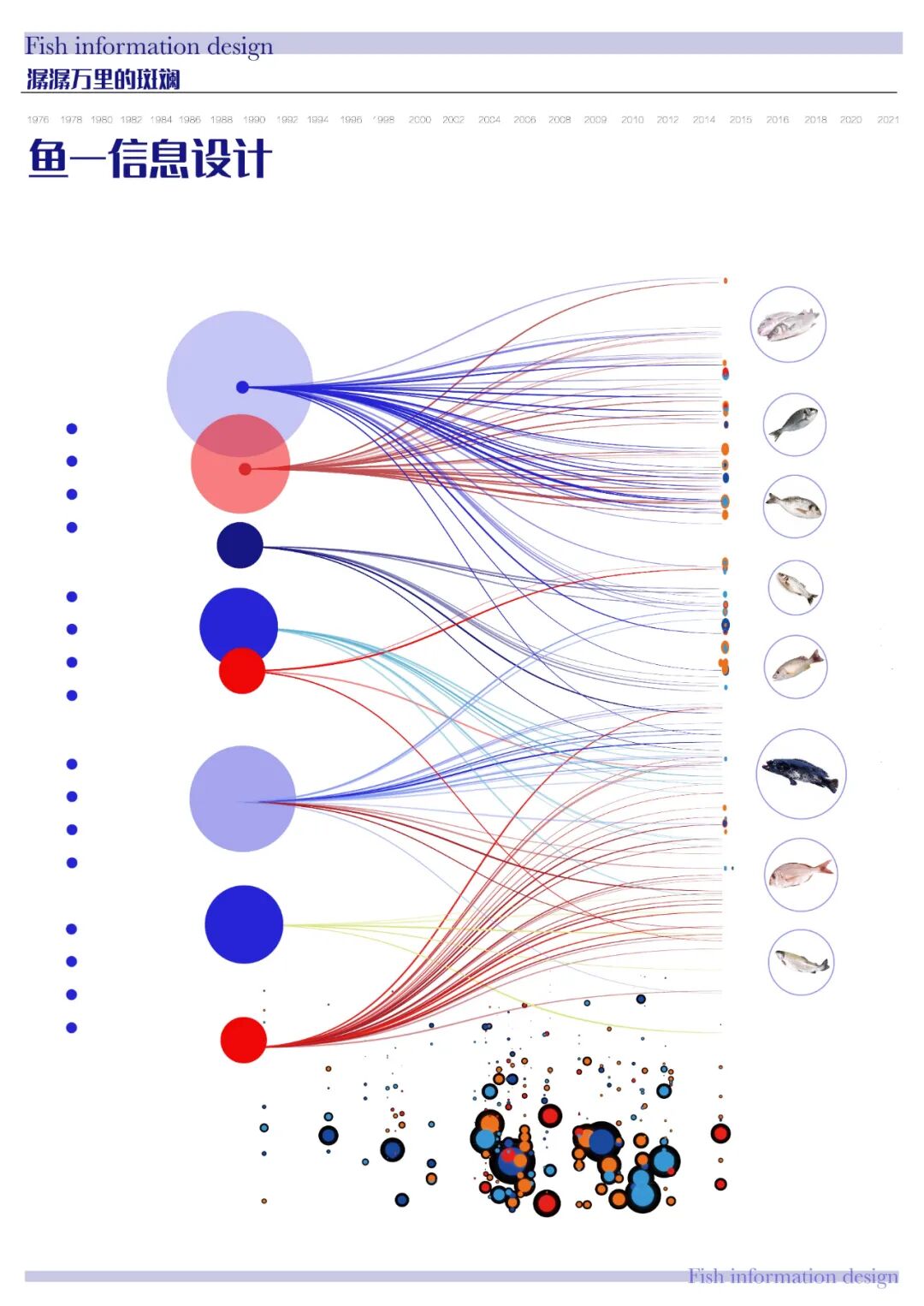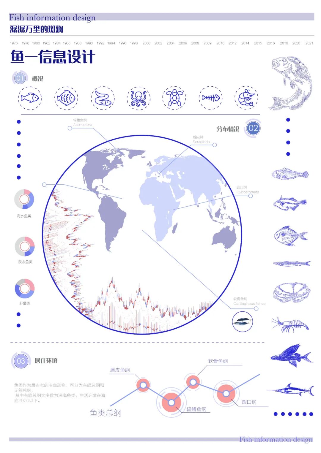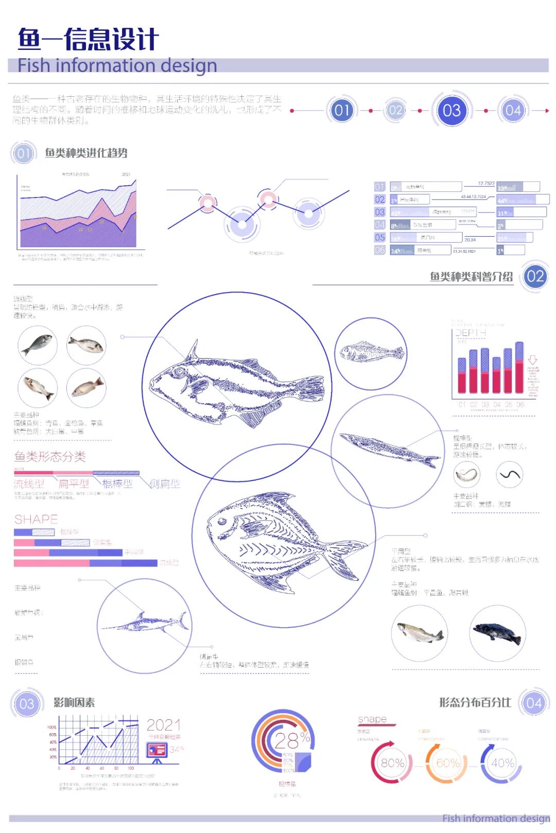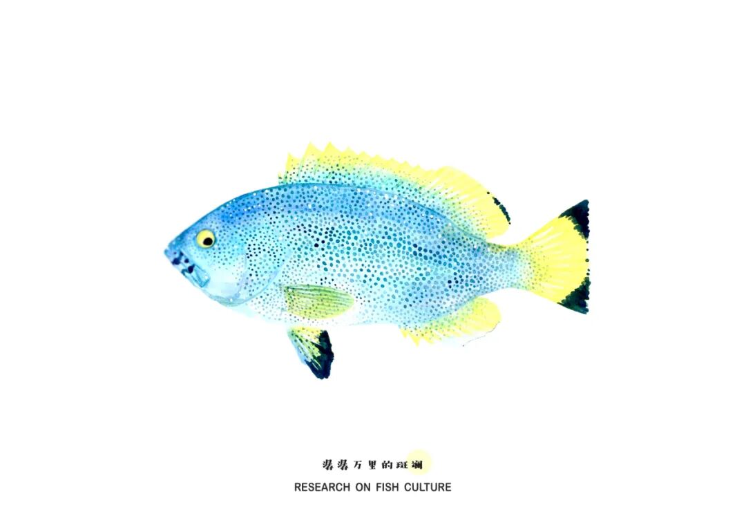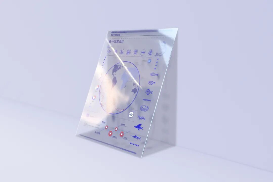 设计说明:最古老的生物——鱼,伴随着潺潺万里的海底,流淌在水域里流动且灵性的美丽,以鱼各种形态种类的美进行信息设计,通过透明的亚克力材料和水彩的质感,表达其独特的美。