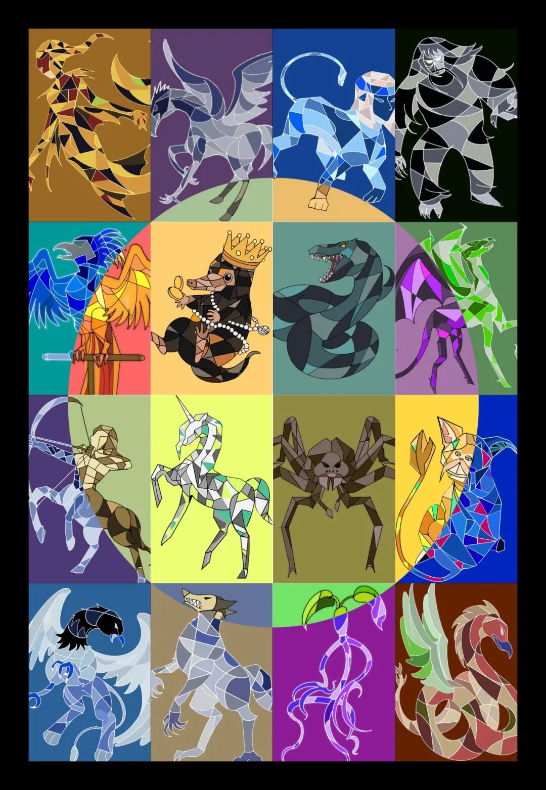 设计说明:本课题的灵感来源为《哈利波特》与《神奇动物在哪里》世界观下存在的稀奇古怪的神奇动物们。这些神奇动物大多也是以我们现实中并不存在的,世界各地幻想中的生物为背景的,非常有趣。我主要采用彩窗玻璃的样式,将神奇生物的形象融入其中,并在神态和色彩上增添各自不同的特点,让这些生物们更显生动。
