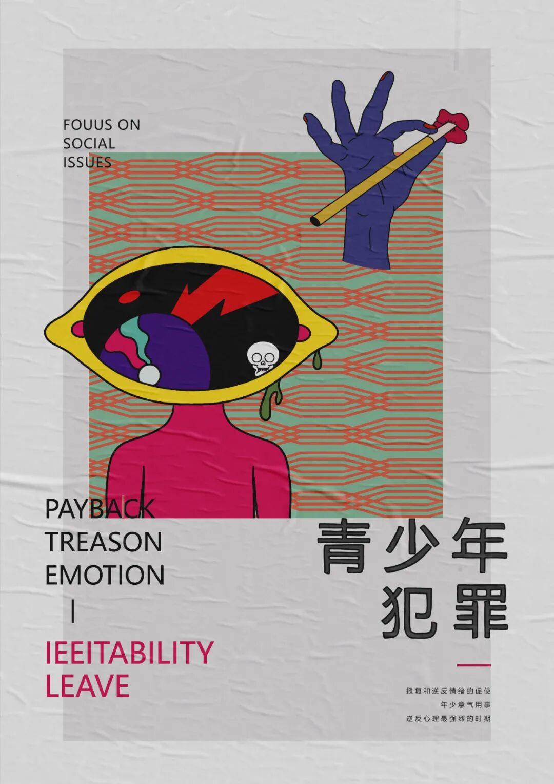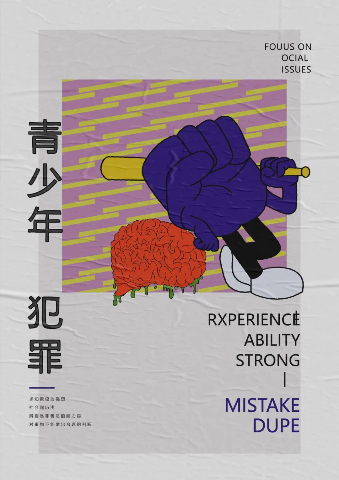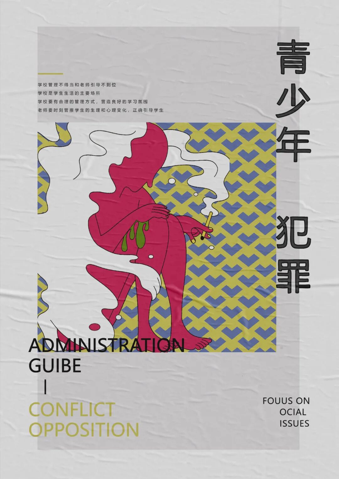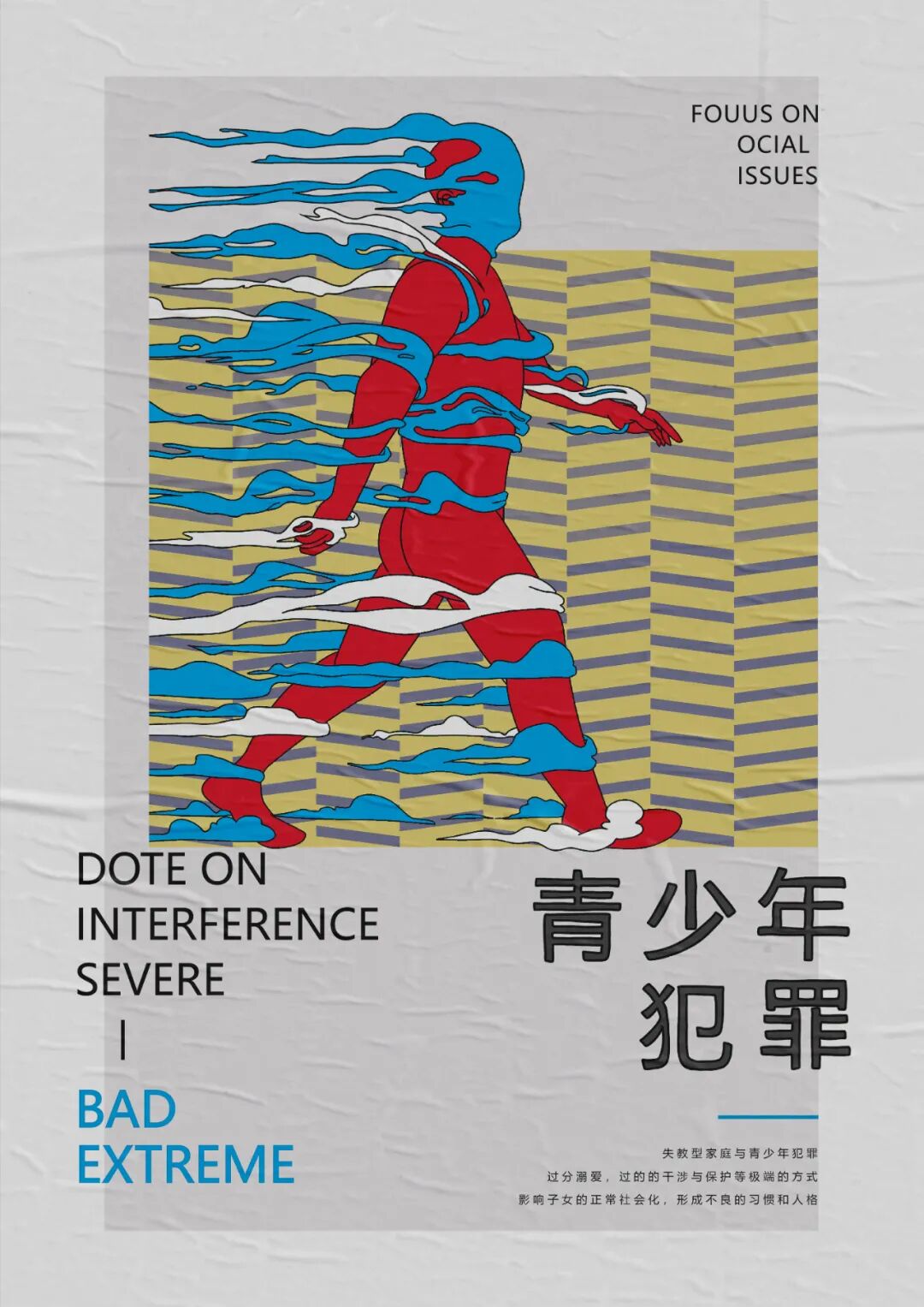 设计说明:在我国社会犯罪中,青少年犯罪已成为一个令人关注的社会问题。通过图像的运用,以艺术的方式,阐述所要表达的,使更多的人关注到青少年犯罪这一社会问题。我将抽象的绘画方式运用到海报设计当中,在创作的过程中,进行创新,进而得以发展,具有一定的创作理念,使海报的内容更加丰富有趣。