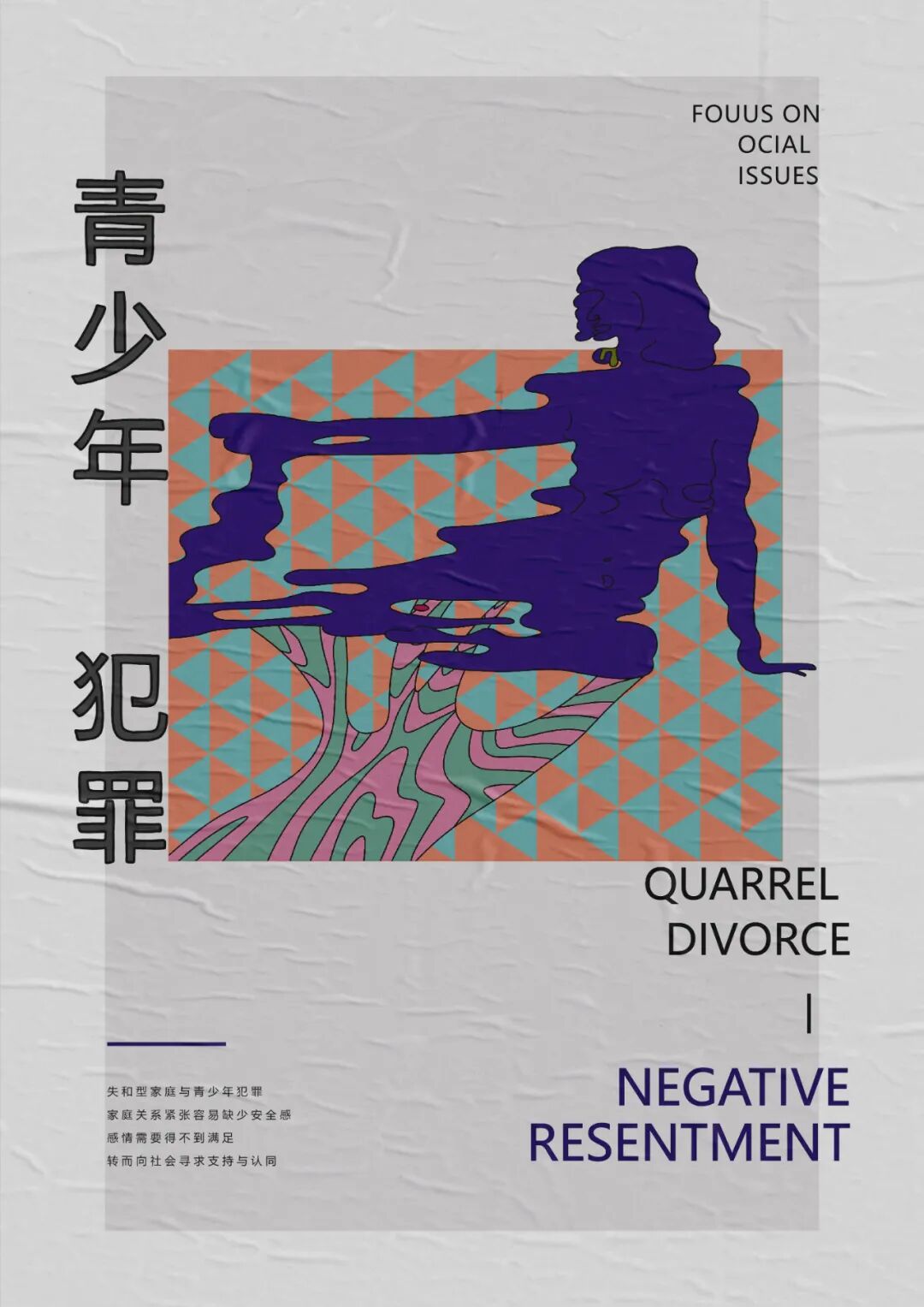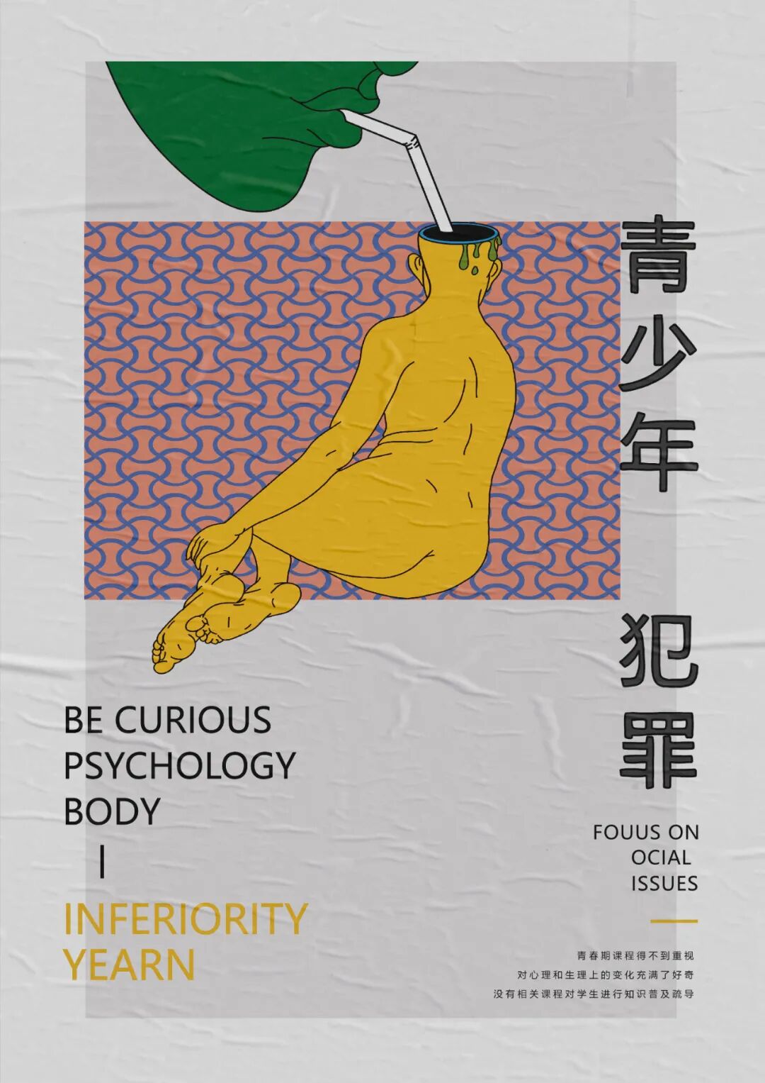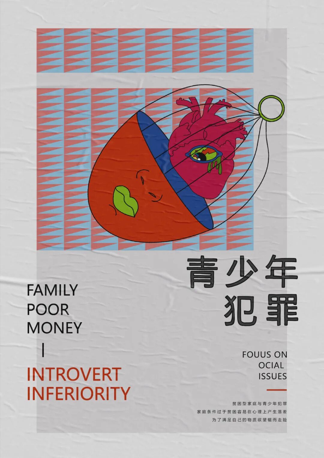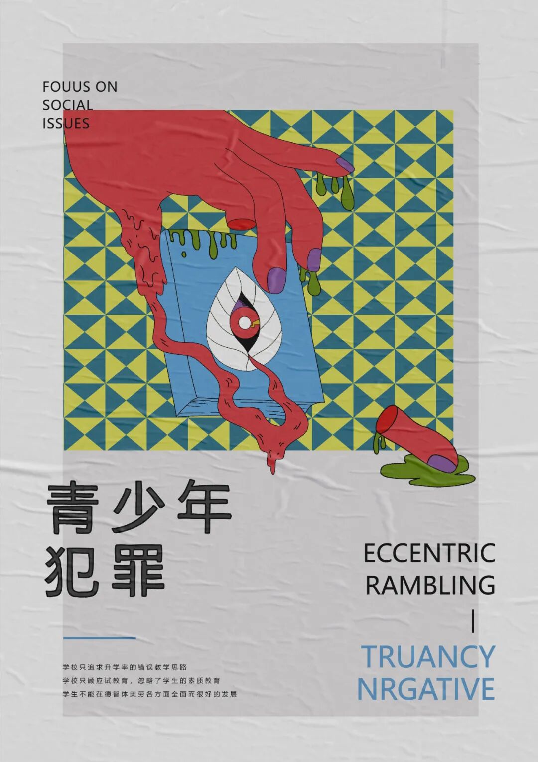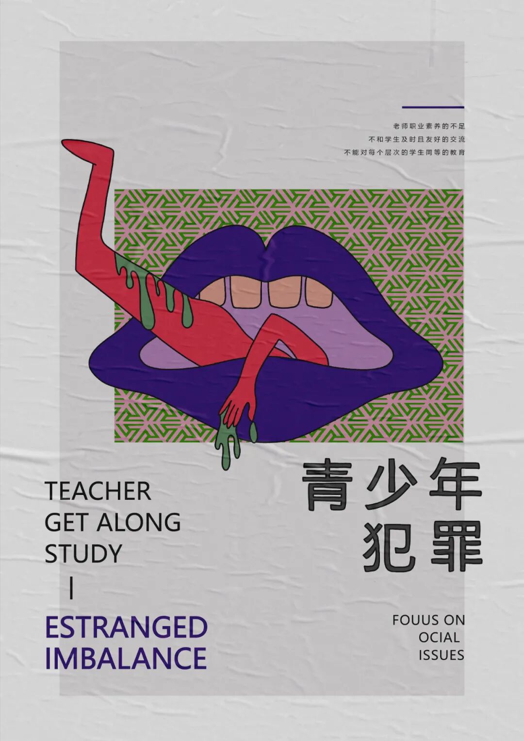 设计说明:在我国社会犯罪中,青少年犯罪已成为一个令人关注的社会问题。通过图像的运用,以艺术的方式,阐述所要表达的,使更多的人关注到青少年犯罪这一社会问题。我将抽象的绘画方式运用到海报设计当中,在创作的过程中,进行创新,进而得以发展,具有一定的创作理念,使海报的内容更加丰富有趣。