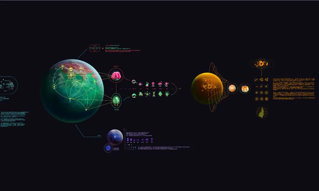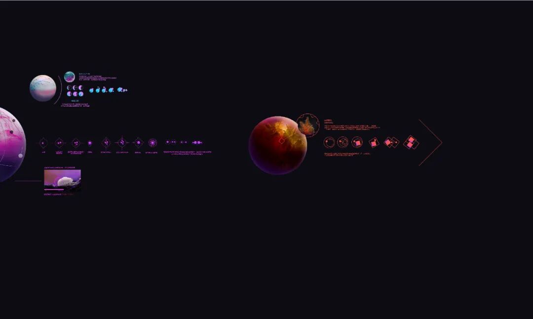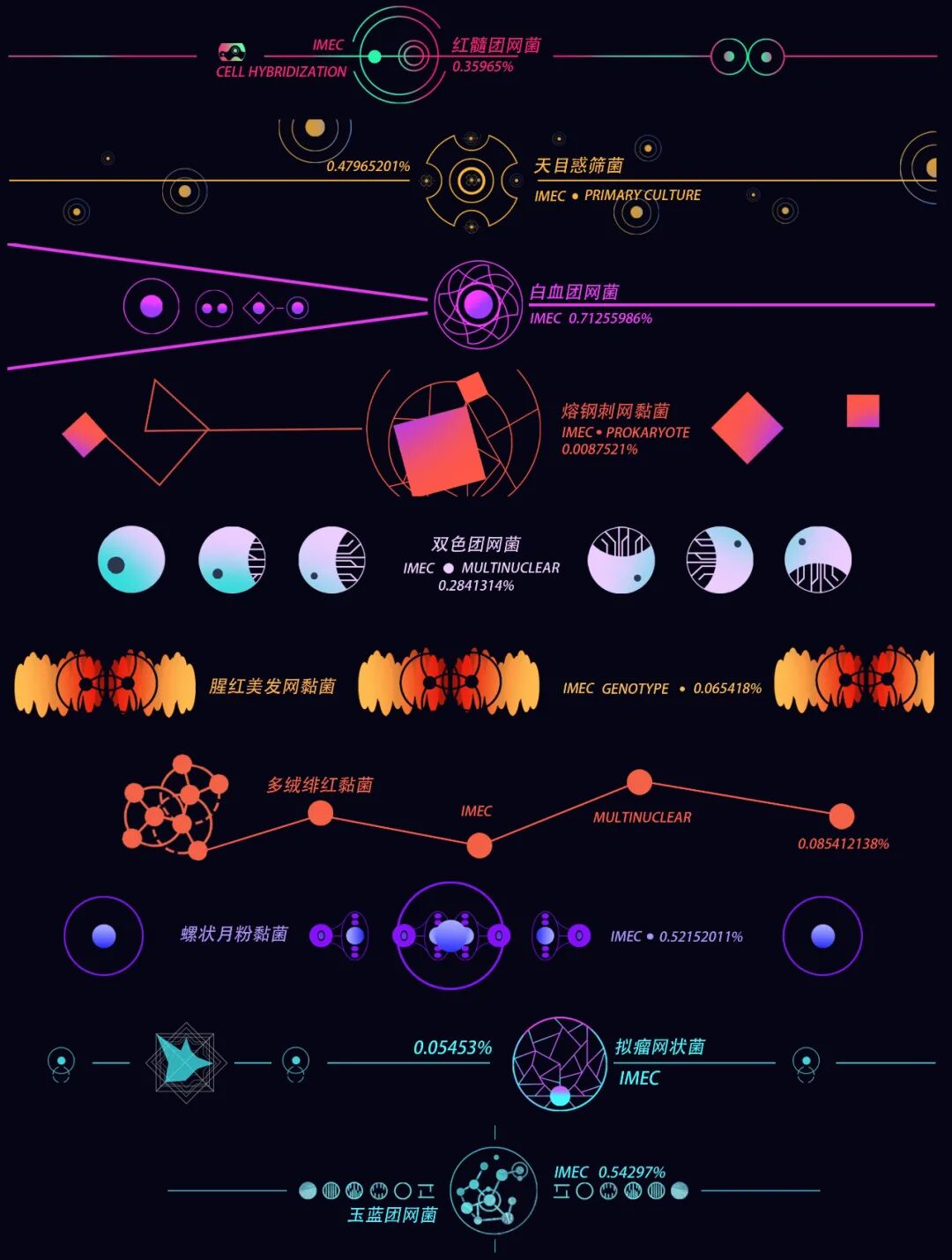 设计说明:本课题围绕着“Slime”展开,以电影《异星觉醒》研究黏菌生物的片段和世界符号大全《零ZEЯRO》中对暗号文字的解读为灵感,创造出一个由黏菌组成的宇宙观,从黏菌的生长过程和黏菌种类中提取元素进行设计,构造出系列作品。设计的主要内容就是黏菌生长过程进行抽象符号暗号的设计以及关于黏菌的信息可视化设计。