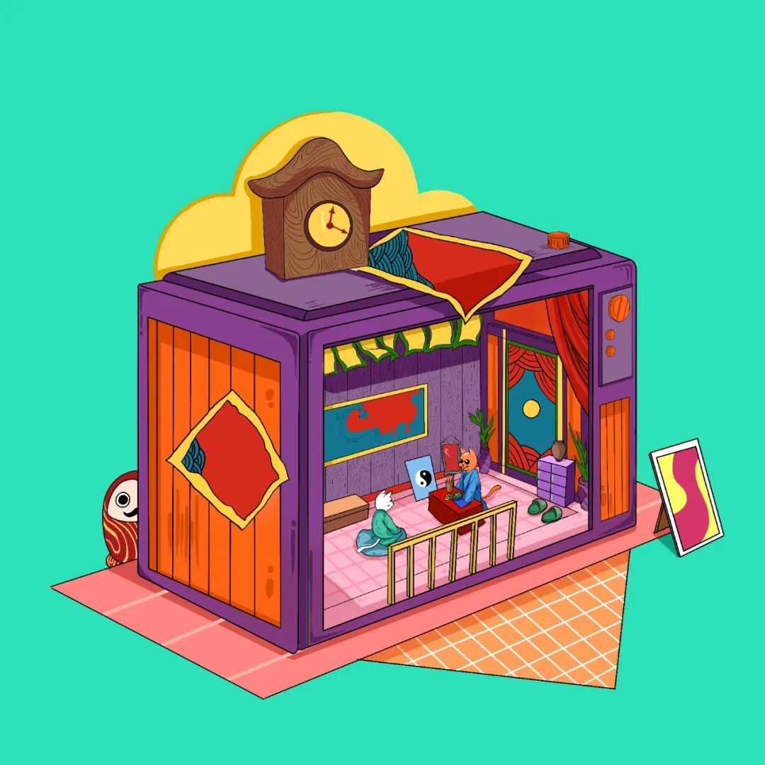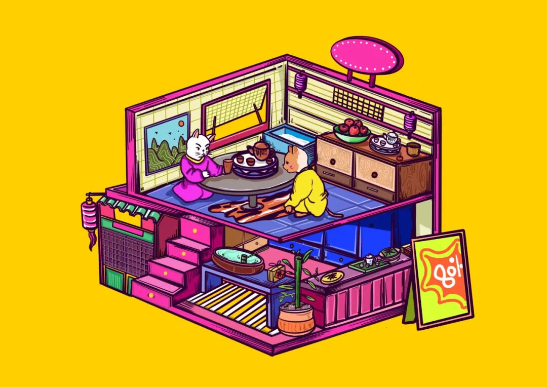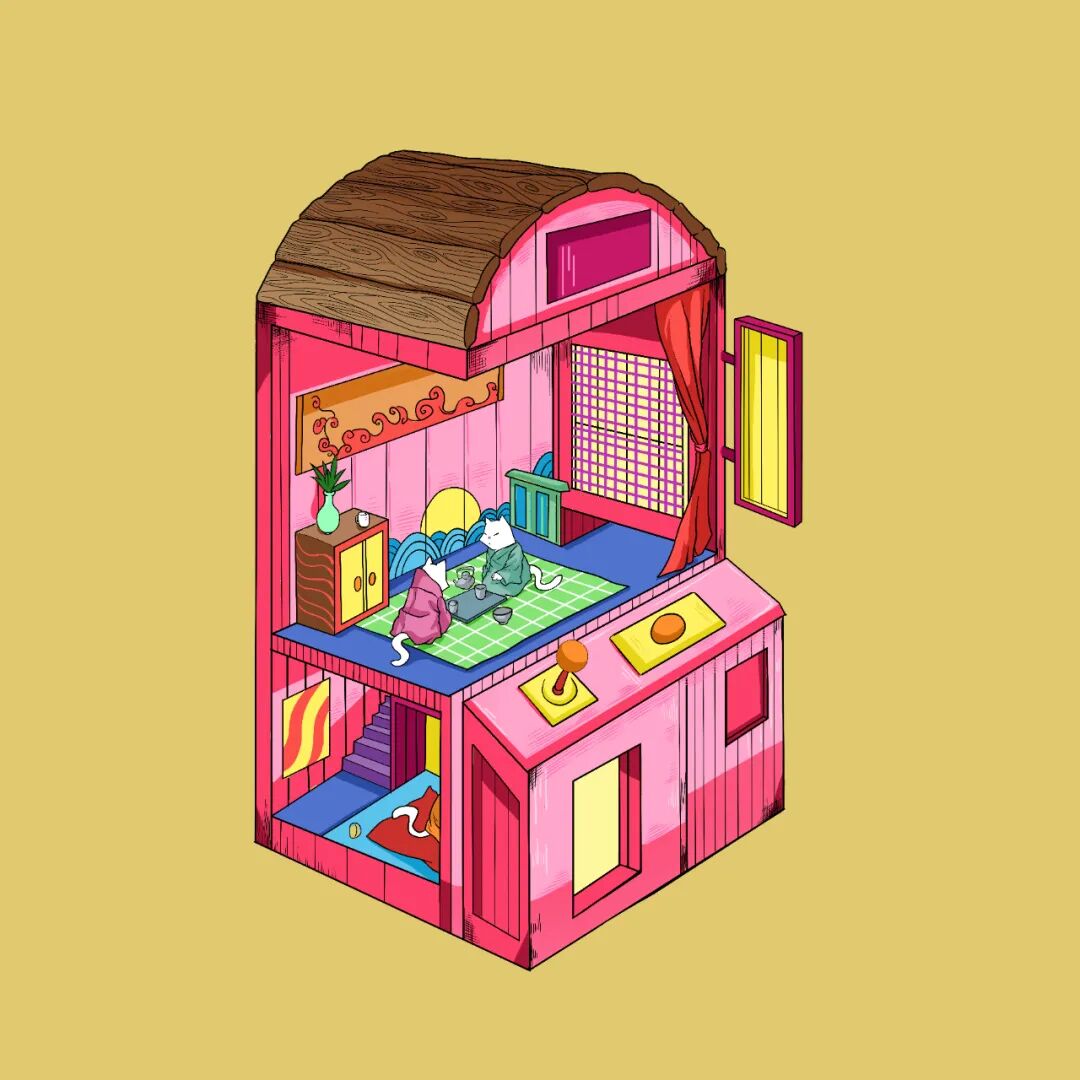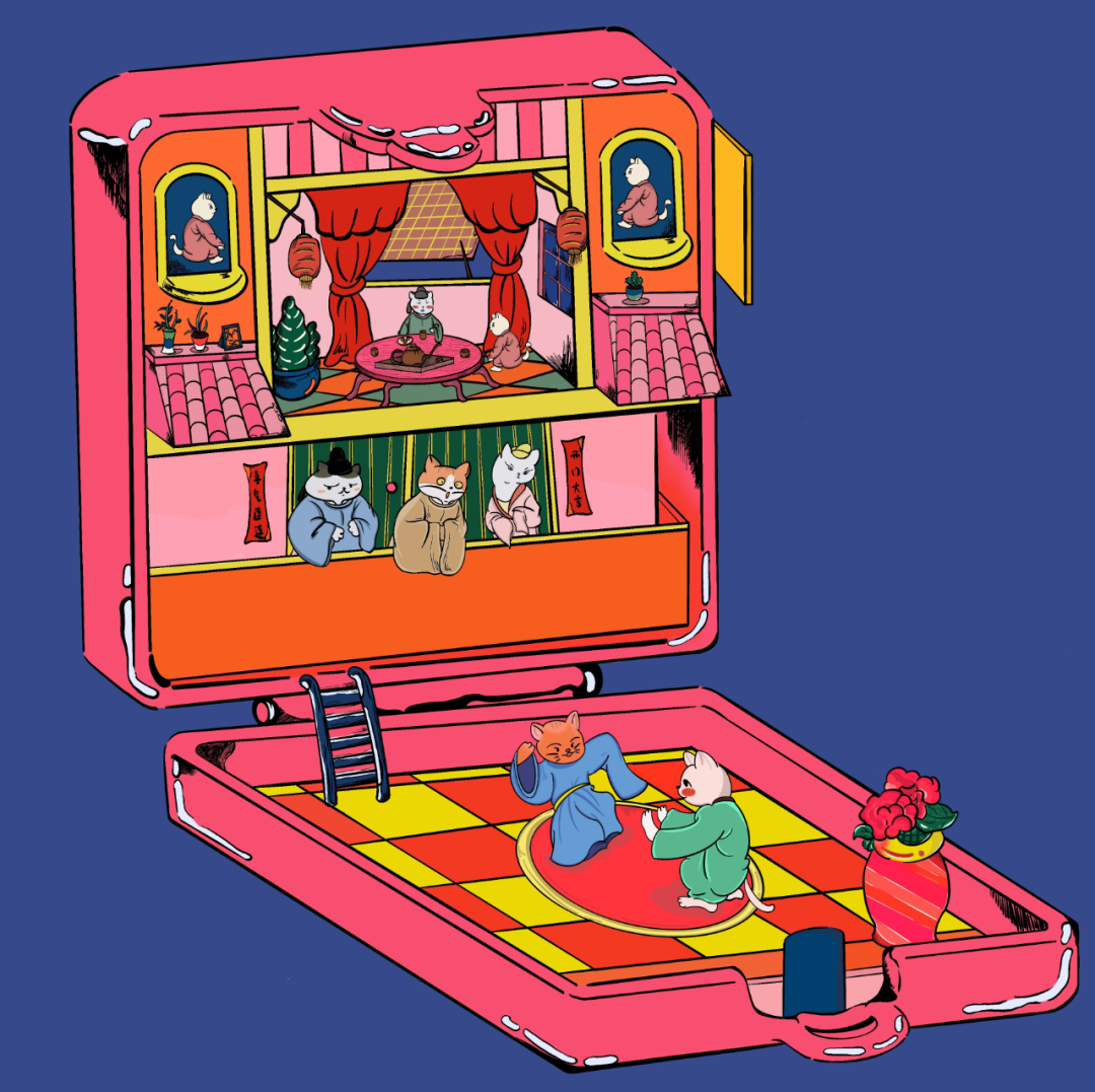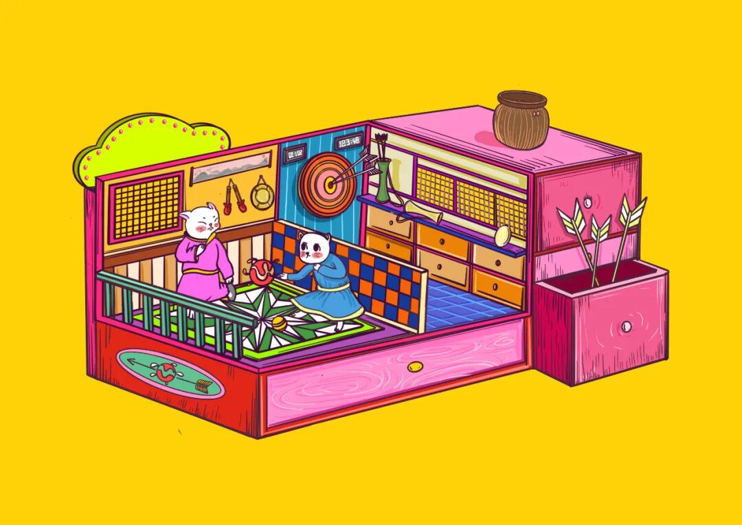 设计说明:如果有一台时光穿梭机能够让人穿越回古代,我一定会选宋朝。“趣往宋潮”也是去往宋朝,利用猫咪的形象代入进宋朝的生活,去看宋朝当时人们的市井娱乐活动,在图形和绘画手法上,力图通过新的表现形式传达新观点,吸引年轻人的注意,更多的了解到“宋潮”文化。