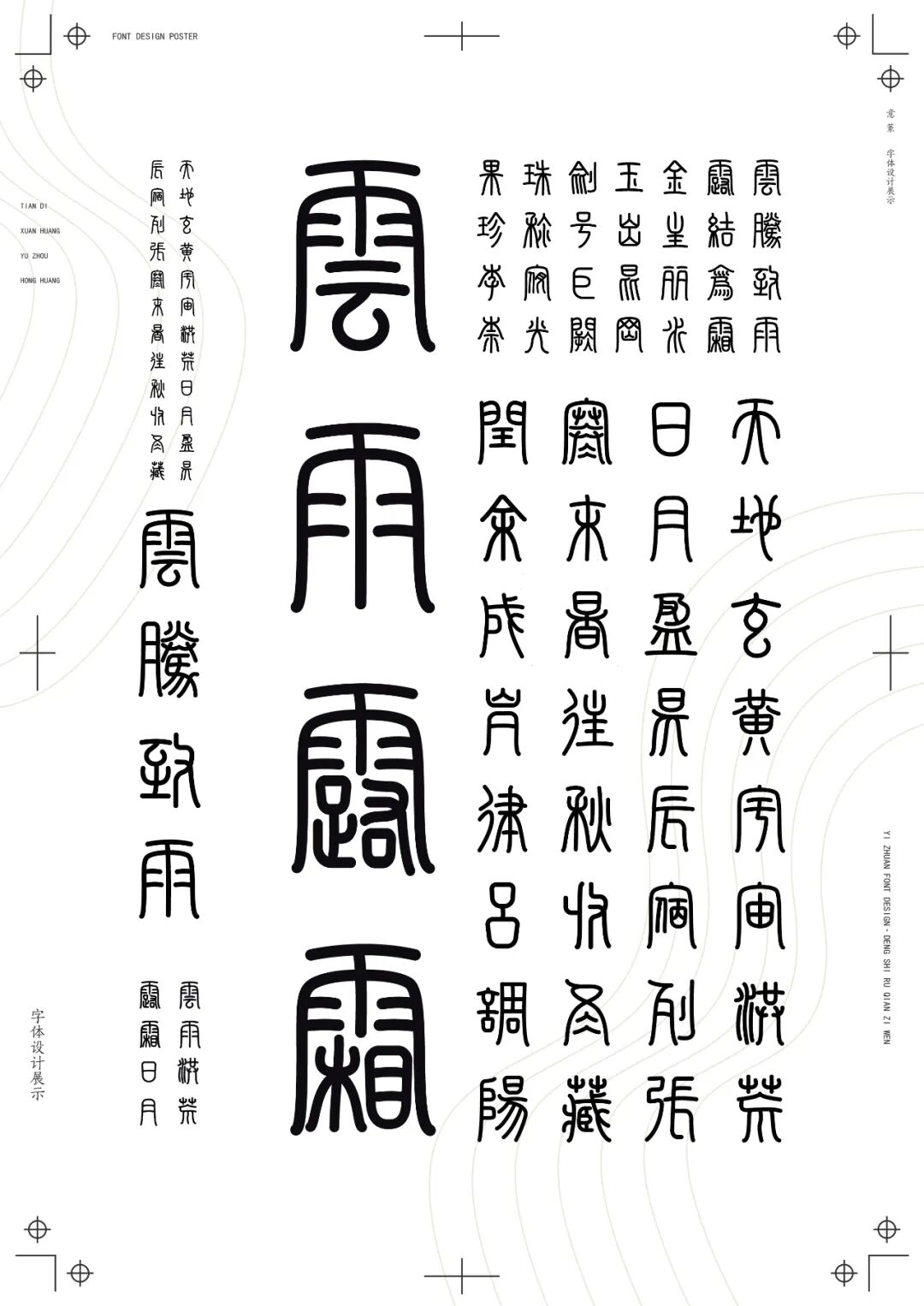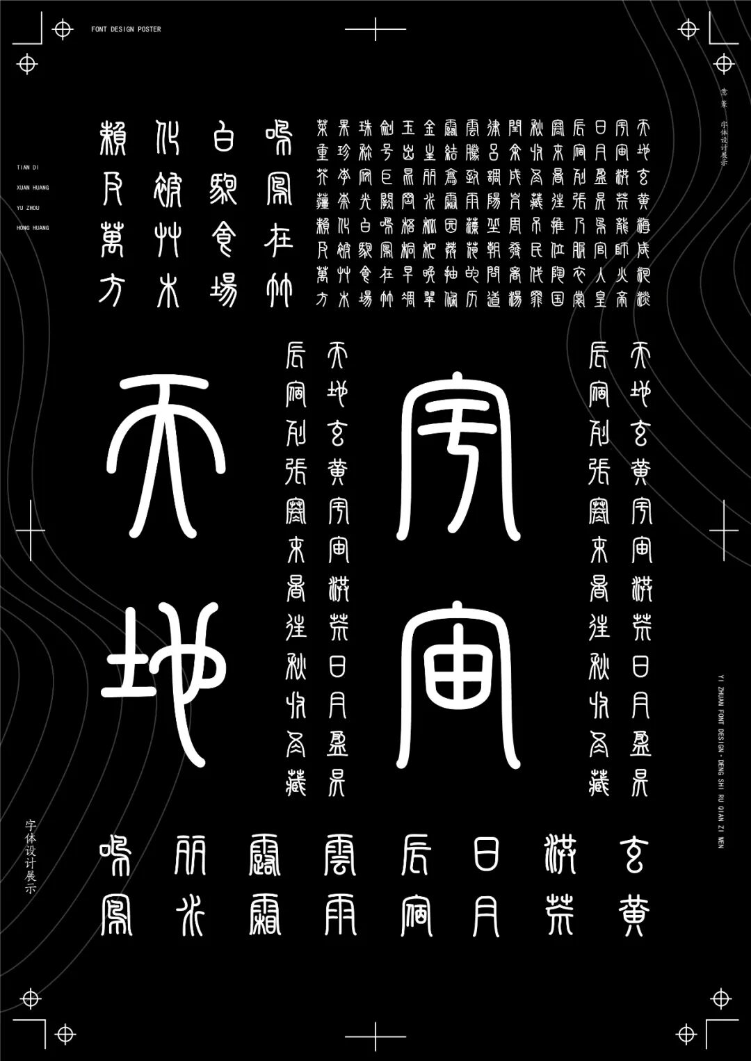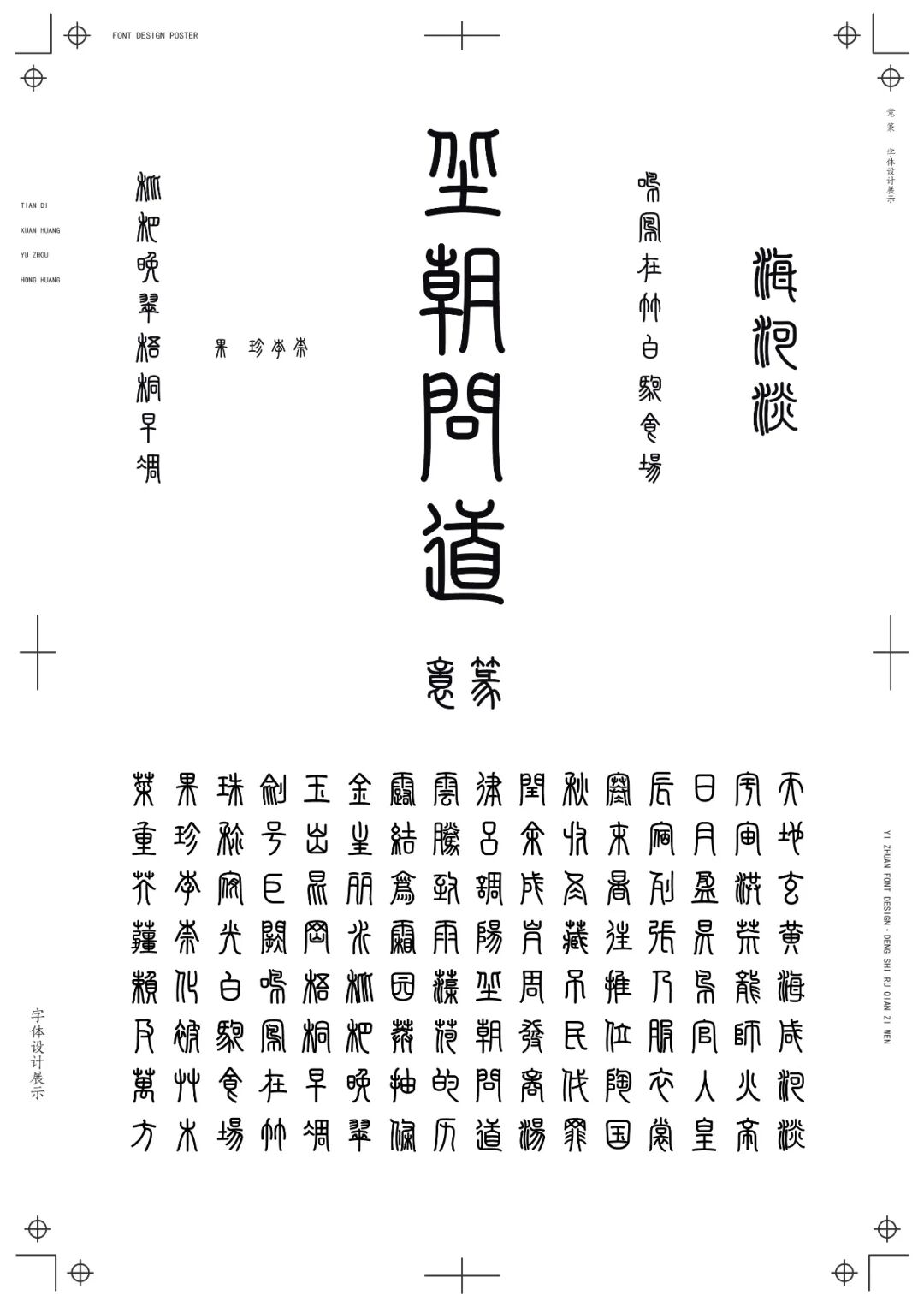 设计说明:篆书在书法创作中的意义在于传达一种原始而神秘的美,启迪人们思索一些非常本源的问题,但是对于现代人来说,小篆存在着过于繁琐及难以辨识的缺点。 意篆字体设计主要增加它的可识别性,字体笔画修长、齐整圆润,减少小篆的繁杂笔画,最大程度还原篆体的典雅美感。