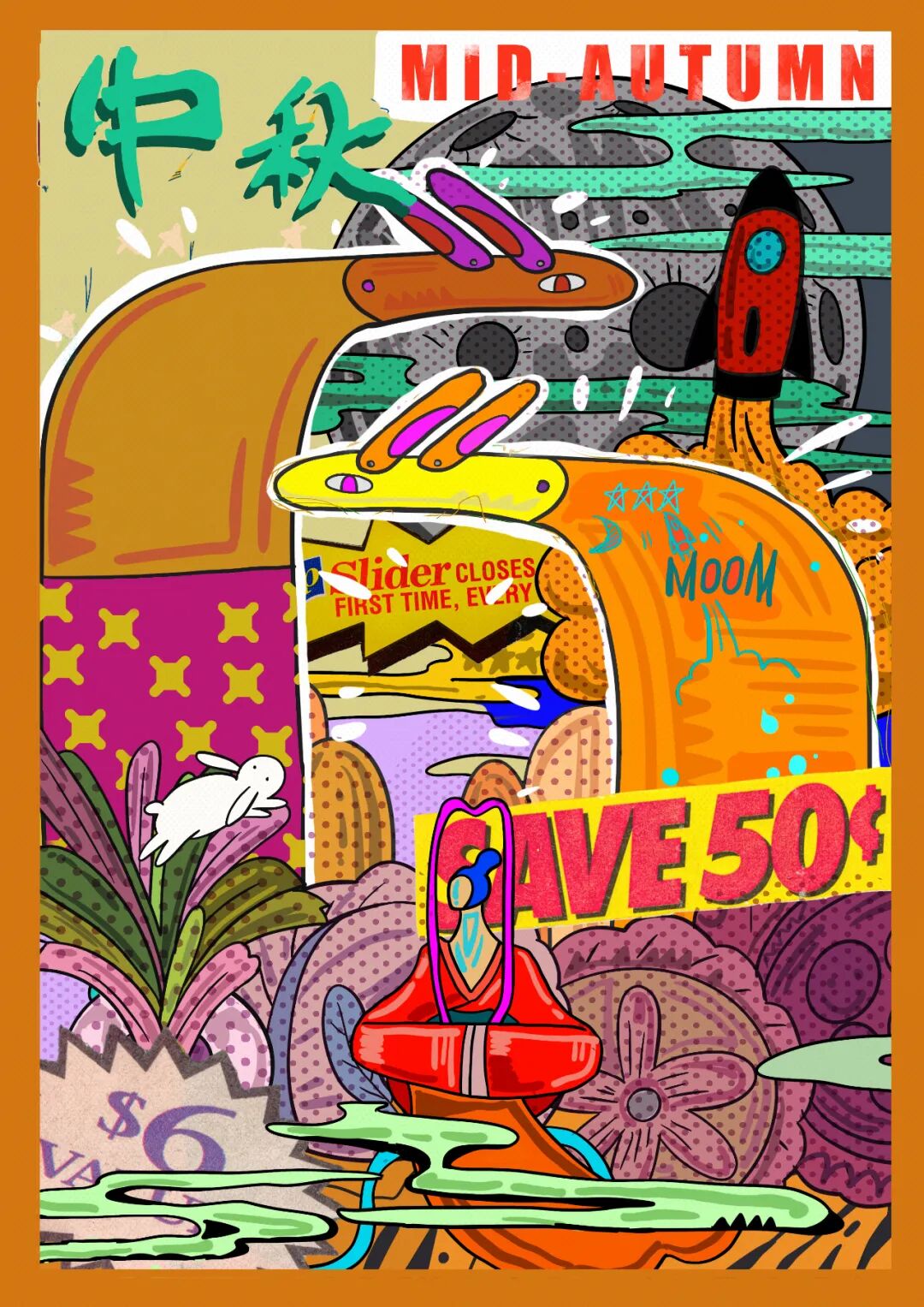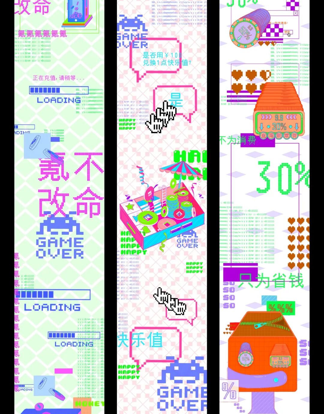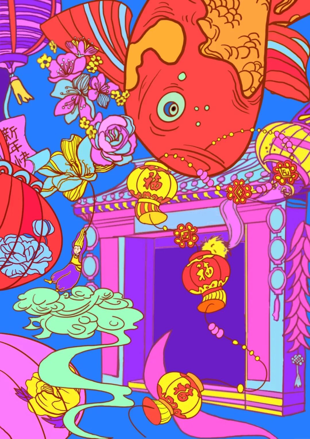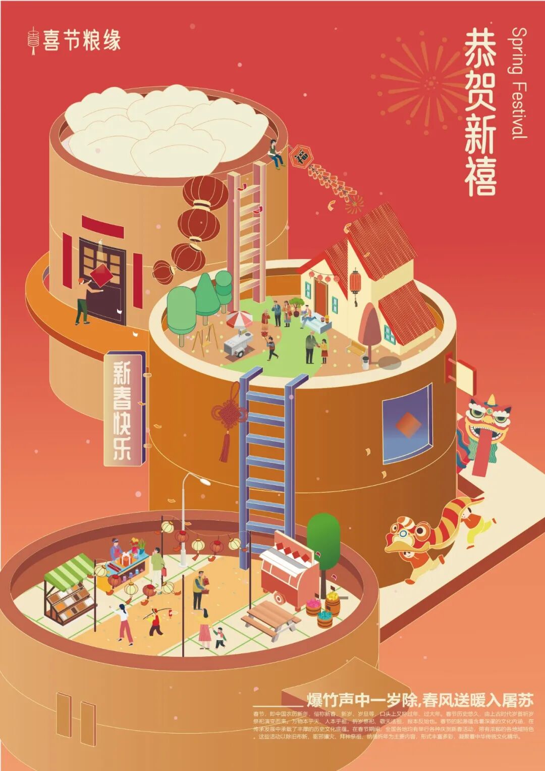 设计说明:“新国潮”是以年轻人的视角去看传统事物。以波谱、复古风格对传统节日进行形态重塑,并试图通过夸张的图形和色彩,表达对传统文化的新观点,吸引年轻人的注意,关注传统节日及其文化内涵。