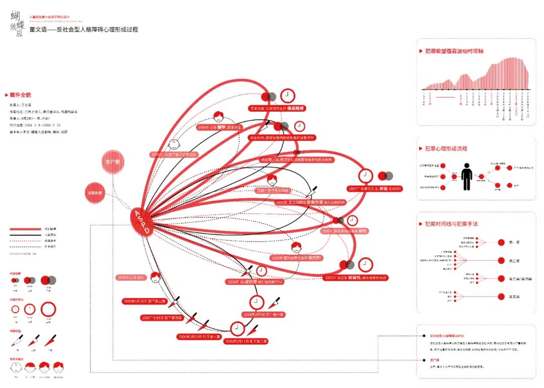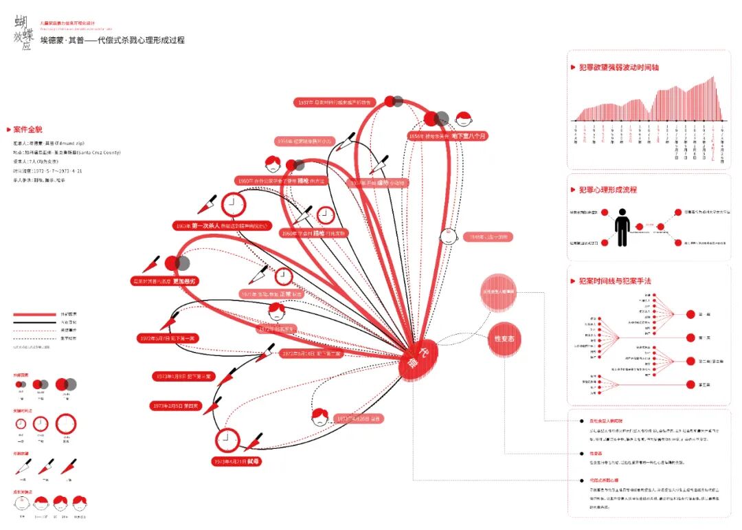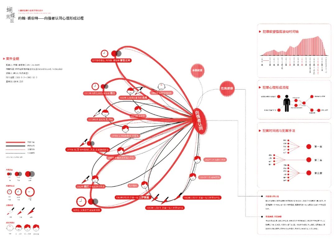 设计说明:近年来家庭暴力这一社会话题逐渐引起人们的关注。相比成年人,家庭暴力对于儿童的影响更为久远且不易被察觉。如同蝴蝶效应,一个童年时期埋在心底的“因”,经过多年积压发酵,最终引发一场巨大的“海啸”。本设计以信息可视化的形式,聚焦家庭暴力和连环杀手等相关内容,试图清晰的展现出童年遭受的家庭暴力与犯罪心理之间的影响关系。以此呼吁更多的人关注儿童家庭暴力,重视其心理问题,一起携手为儿童构建和谐健康的成长环境。