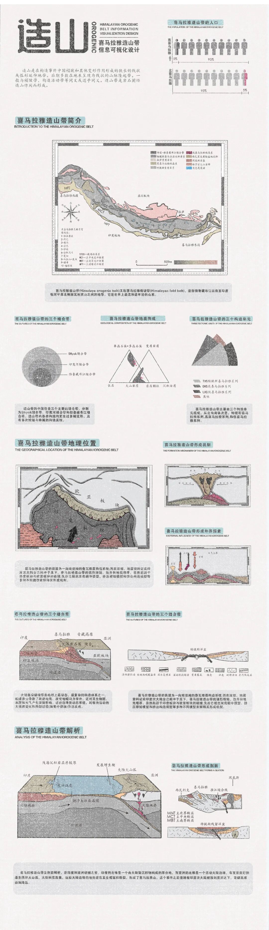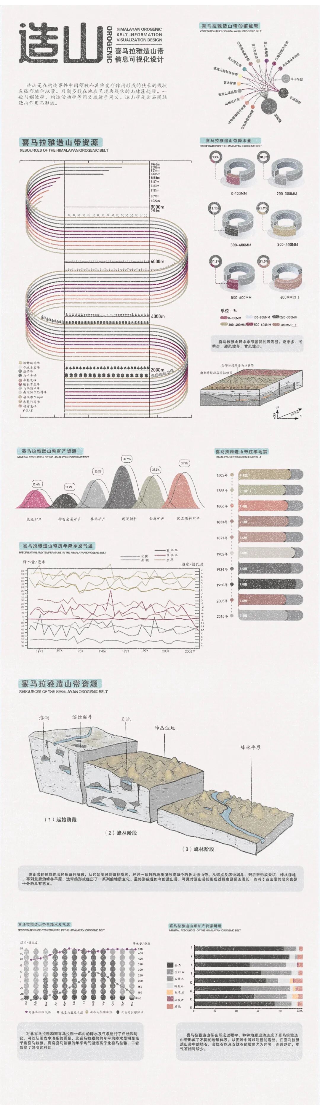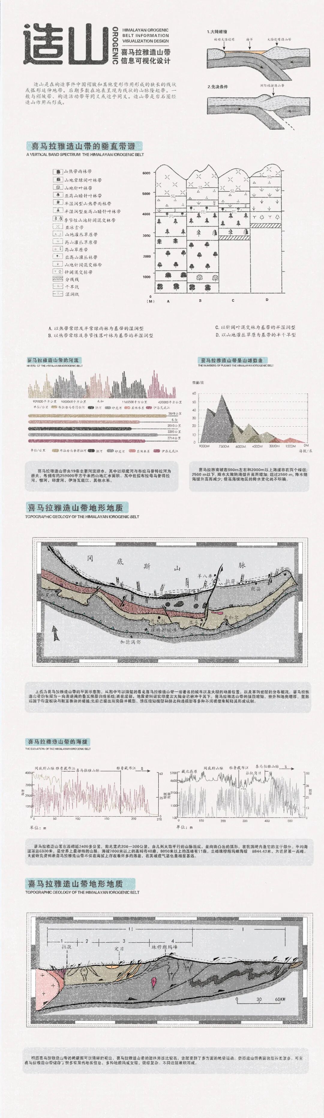 设计说明:造山运动给地球形态和人类生活带来了许多的影响。而喜马拉雅造山带是世界上最高和最年轻的山系,特以此作为研究造山运动的对象。采用信息可视化设计的方式来呈现,对喜马拉雅造山带的地理位置,形成机制,气候条件,降水条件,植被条件,自然资源,岩层构造,地震运动等方面进行大量研究并以图表的方式表现出来。通过对喜马拉雅造山带的研究与演化,深刻认识造山运动的形成机制以及造山运动对地球形态和人类生活带来的系列影响。