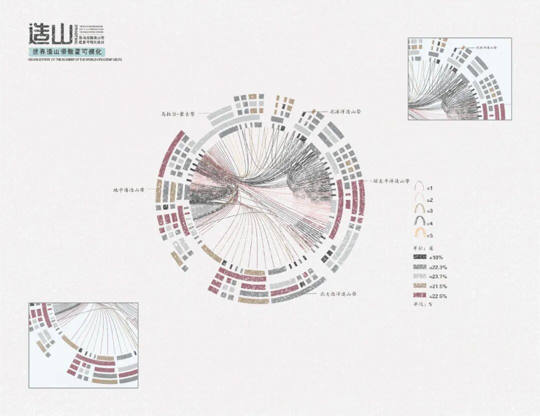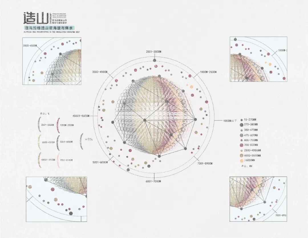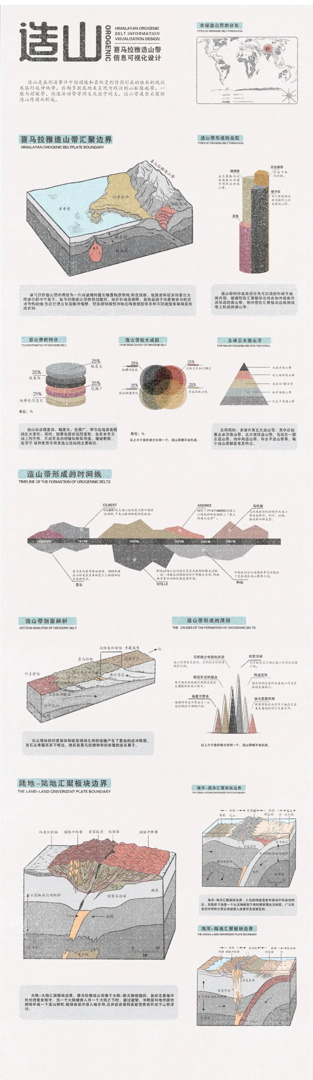 设计说明:造山运动给地球形态和人类生活带来了许多的影响。而喜马拉雅造山带是世界上最高和最年轻的山系,特以此作为研究造山运动的对象。采用信息可视化设计的方式来呈现,对喜马拉雅造山带的地理位置,形成机制,气候条件,降水条件,植被条件,自然资源,岩层构造,地震运动等方面进行大量研究并以图表的方式表现出来。通过对喜马拉雅造山带的研究与演化,深刻认识造山运动的形成机制以及造山运动对地球形态和人类生活带来的系列影响。