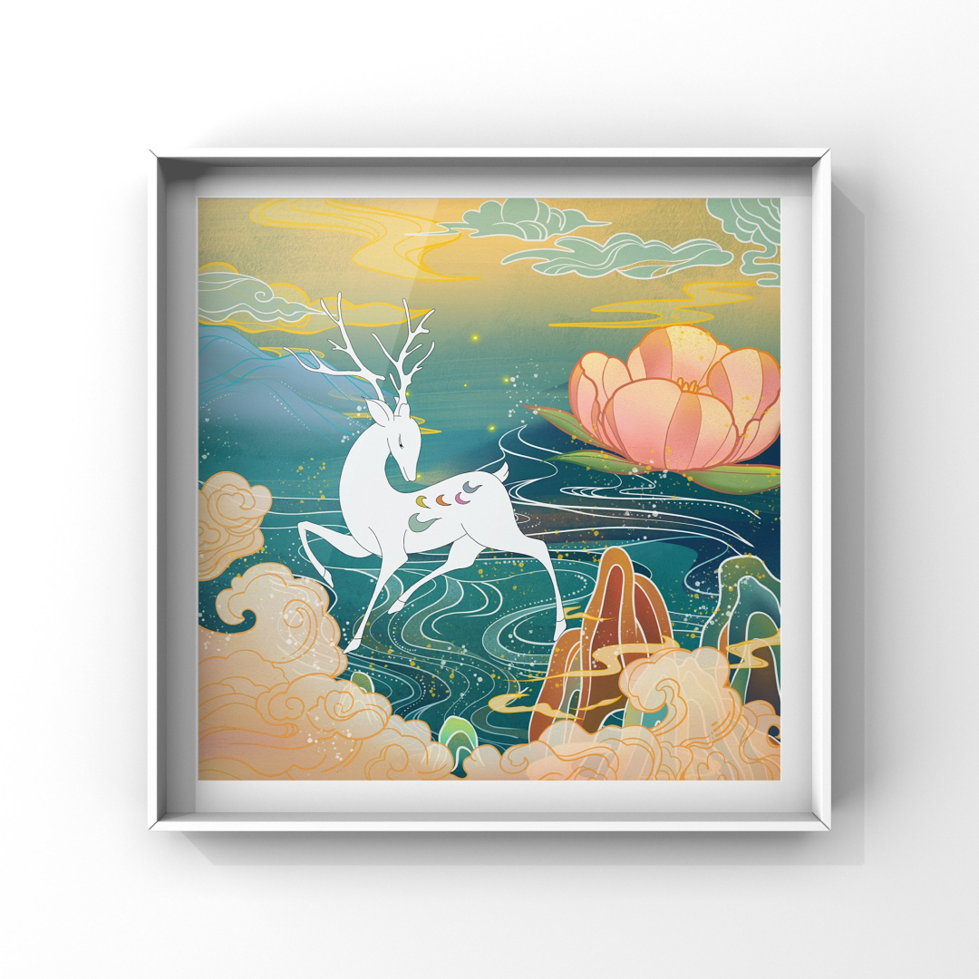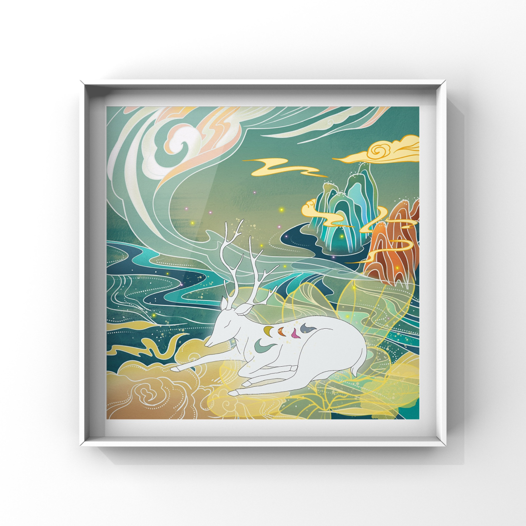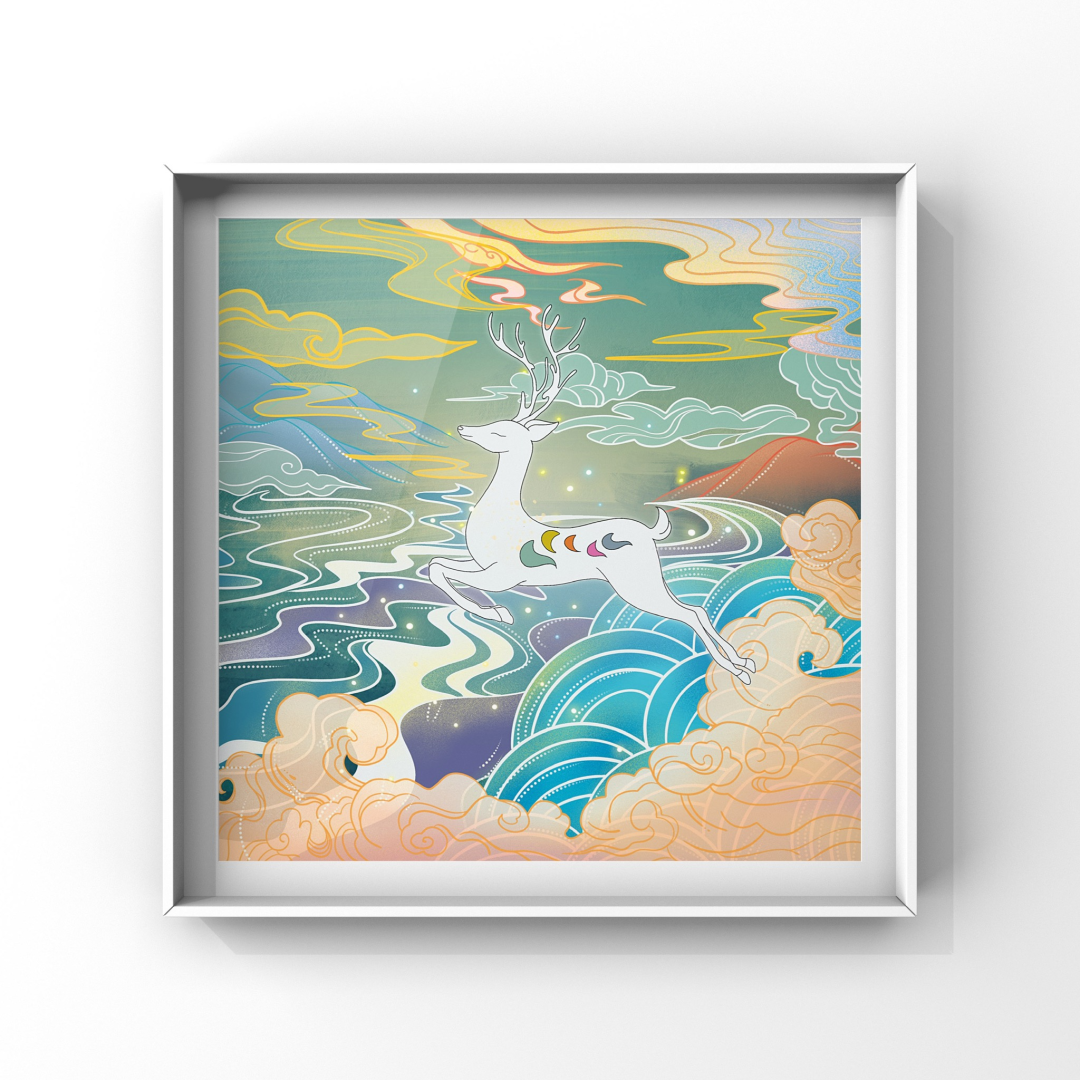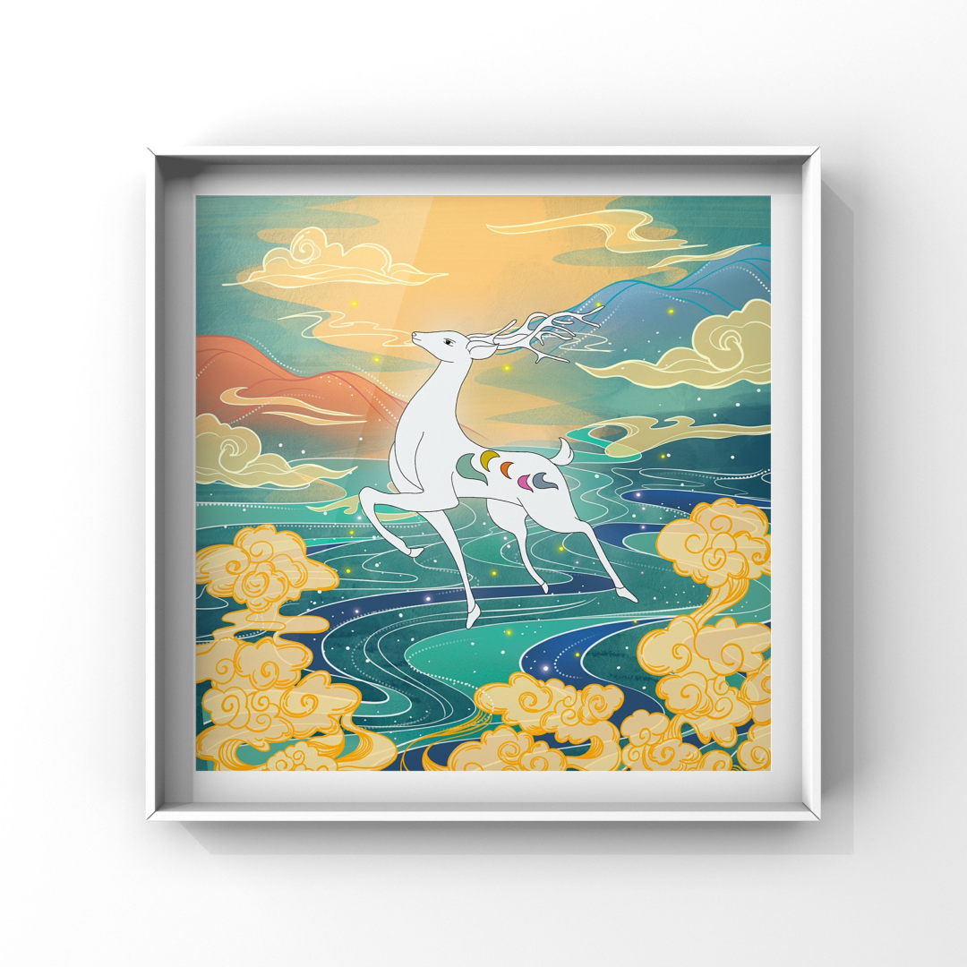 设计说明:《九色鹿经图》绘于敦煌257号洞窟的西壁中部,是敦煌北魏洞窟壁画的经典之作。这幅壁画以精湛的艺术再现了“鹿王本生”的故事。此次设计以敦煌壁画中九色鹿的形象为原型,从古老神秘的壁画中提取元素与现代插画结合,再运用文创产品进行推广。将敦煌文化更好的展示给大家。