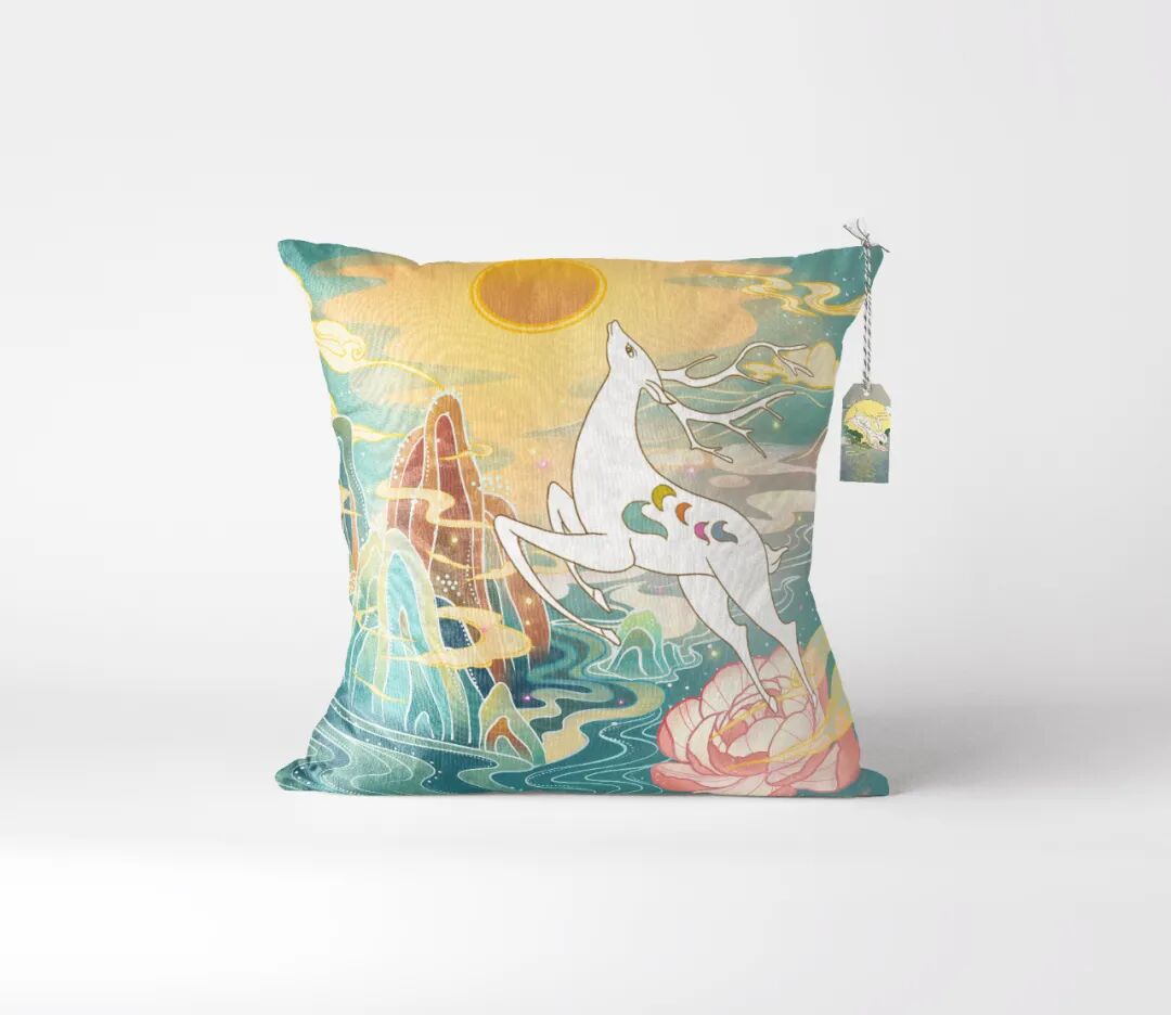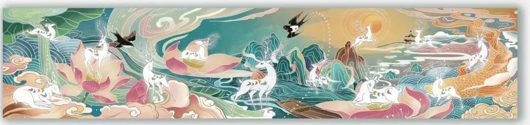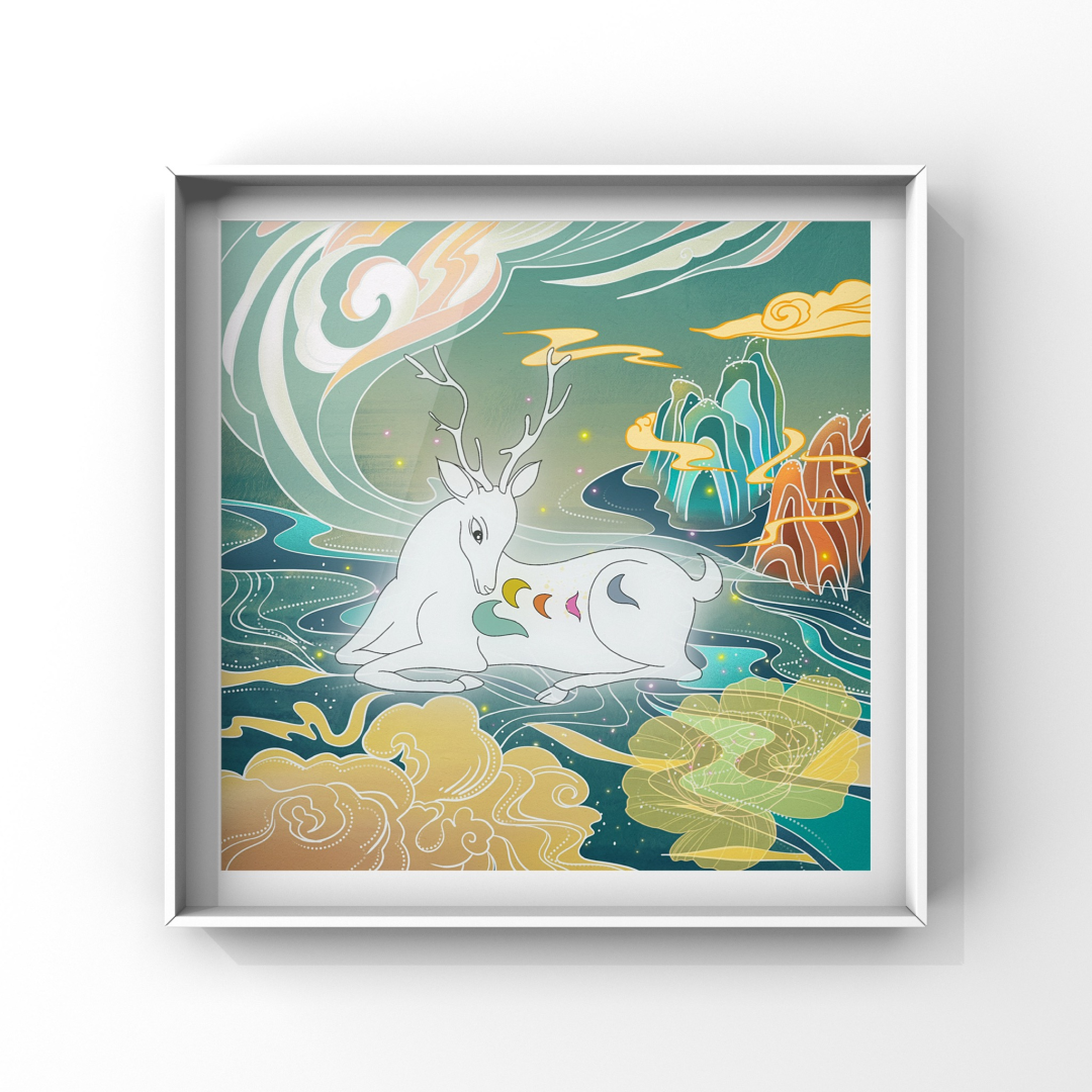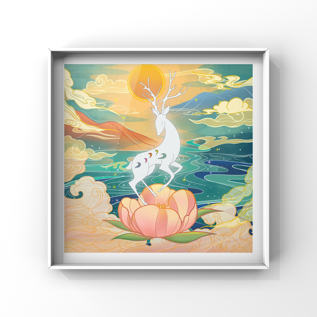 设计说明:《九色鹿经图》绘于敦煌257号洞窟的西壁中部,是敦煌北魏洞窟壁画的经典之作。这幅壁画以精湛的艺术再现了“鹿王本生”的故事。此次设计以敦煌壁画中九色鹿的形象为原型,从古老神秘的壁画中提取元素与现代插画结合,再运用文创产品进行推广。将敦煌文化更好的展示给大家。
