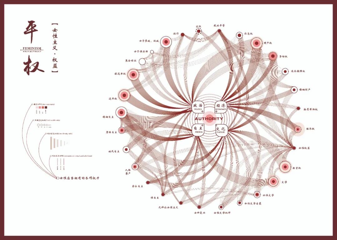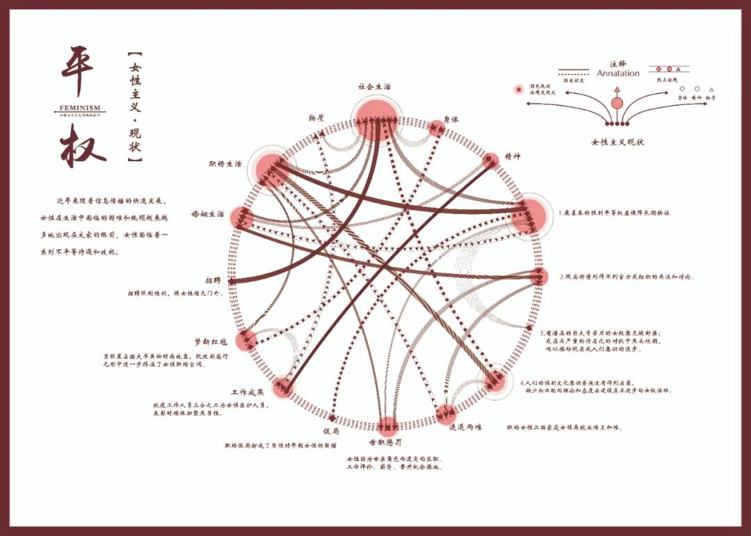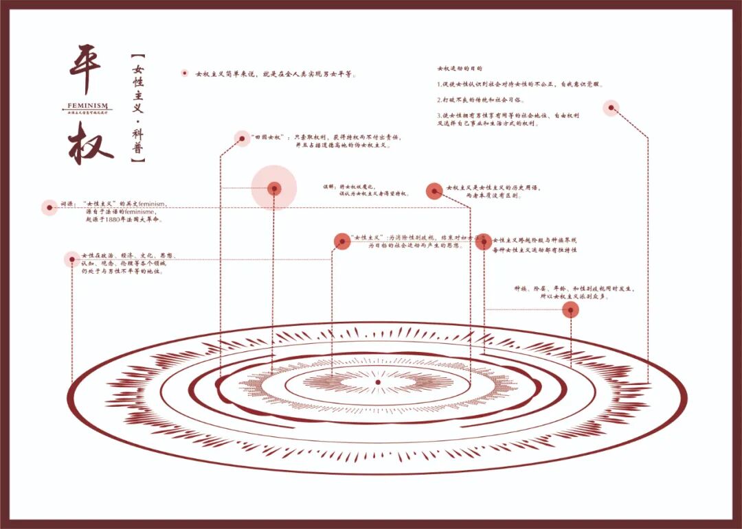 设计说明:随着女性社会地位的提高,“女权主义”这个词越来越多地出现在网络和现实生活中,不少人从性别视角批判时事,但是大部分人并不了解女权主义,以至于误解。该设计以信息可视化的形式对女权主义进行剖析,用时间线的方式,梳理出女权主义的生发和变化,并以花朵借物叙事来展现女权主义的相关内容。