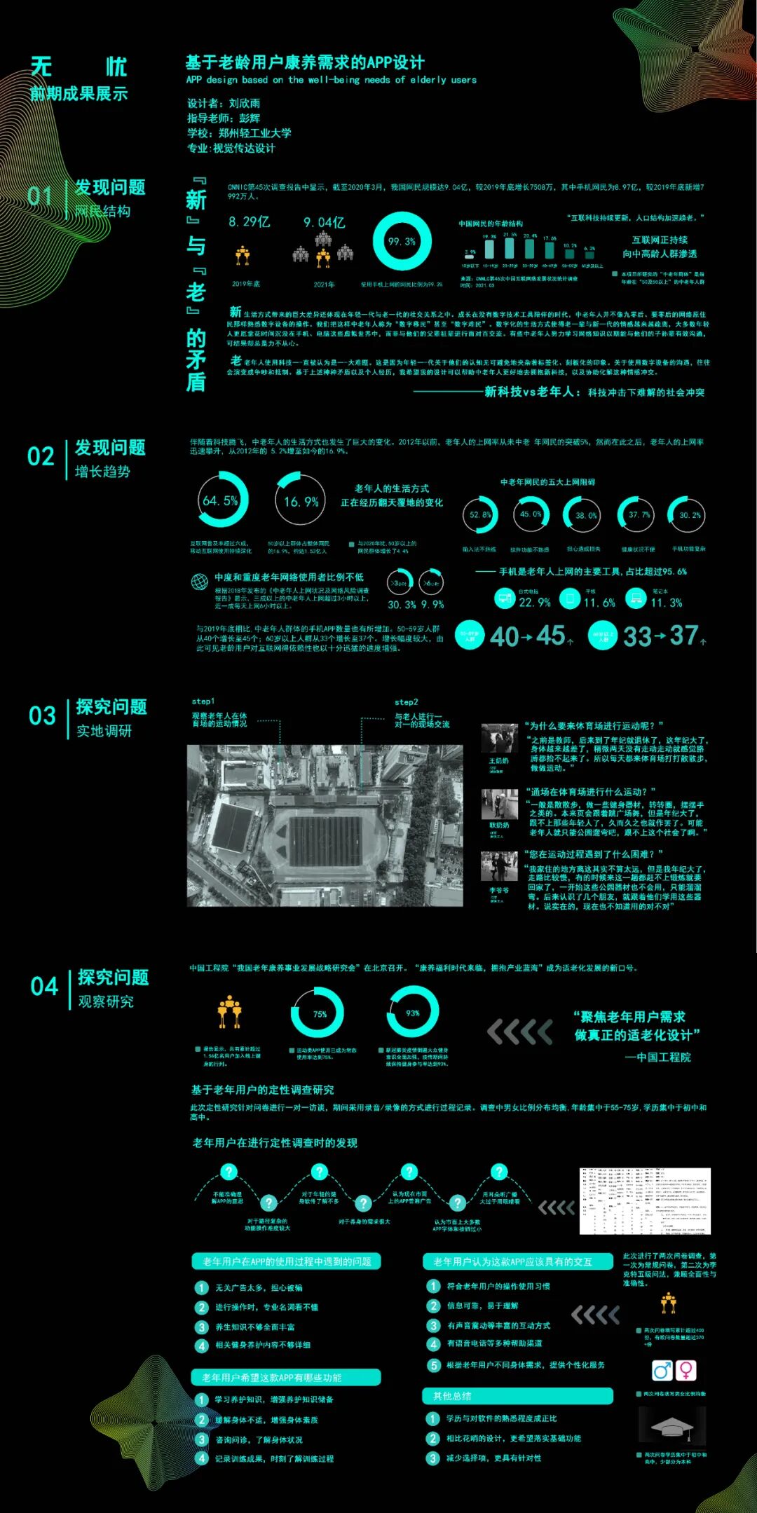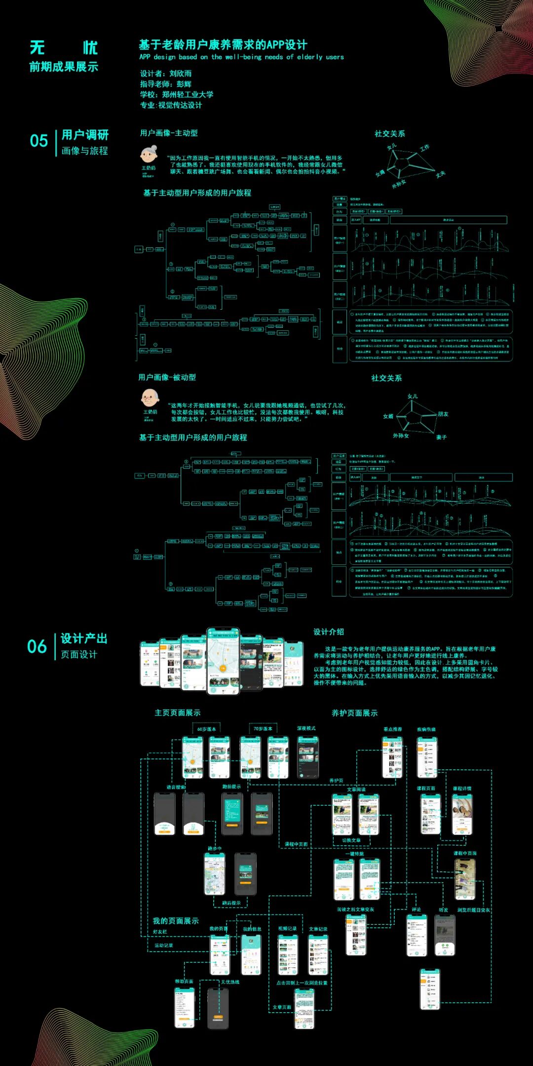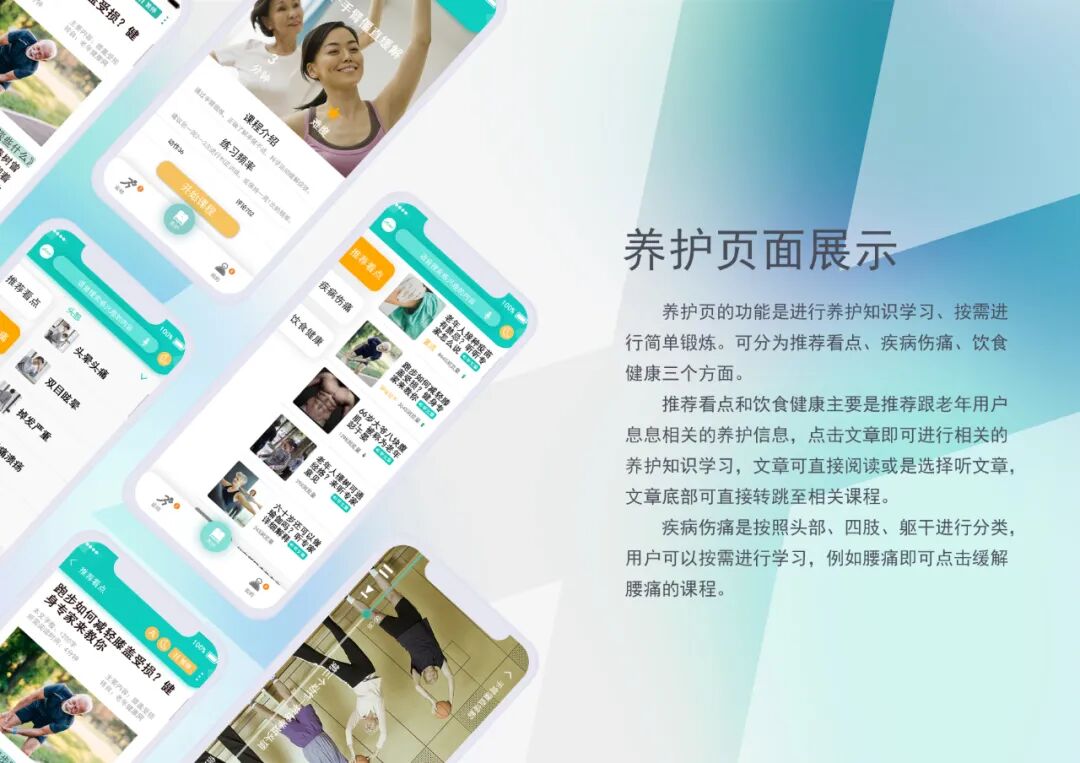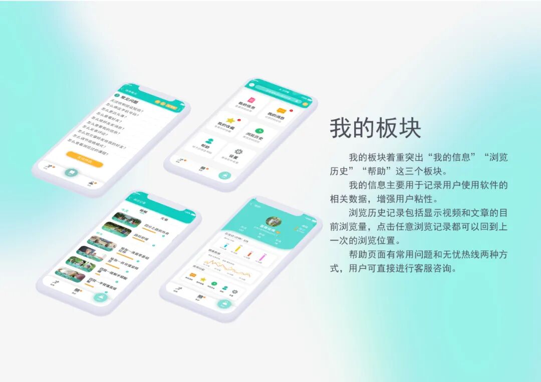 设计说明:老龄化问题逐渐成为我国经济快速发展中的重要问题。在技术迭代、学科跨界、老年用户快速成长的背景下,老龄化设计不仅关系到经济结构、人民生活,也影响着设计介入现实问题的角度和走向。该设计基于老龄用户的康养需求,从用户体验、行为策略出发,经过定量、定性用户调研,试图设计出符合其认知、感知及行为的具有良好交互效果的APP系统。