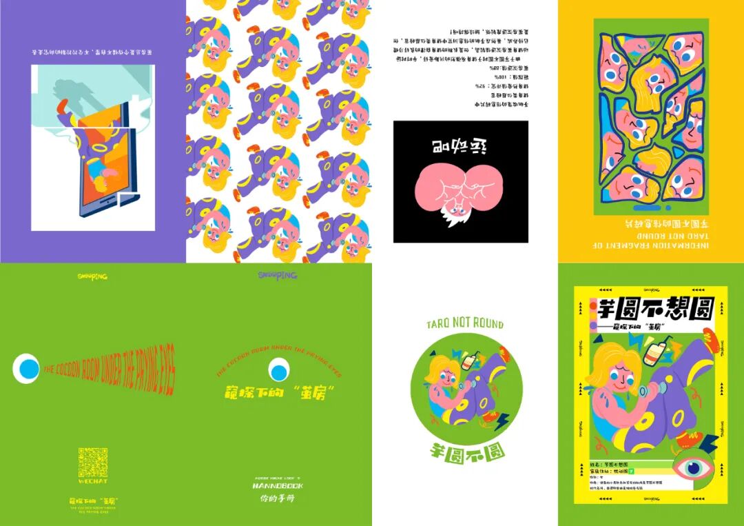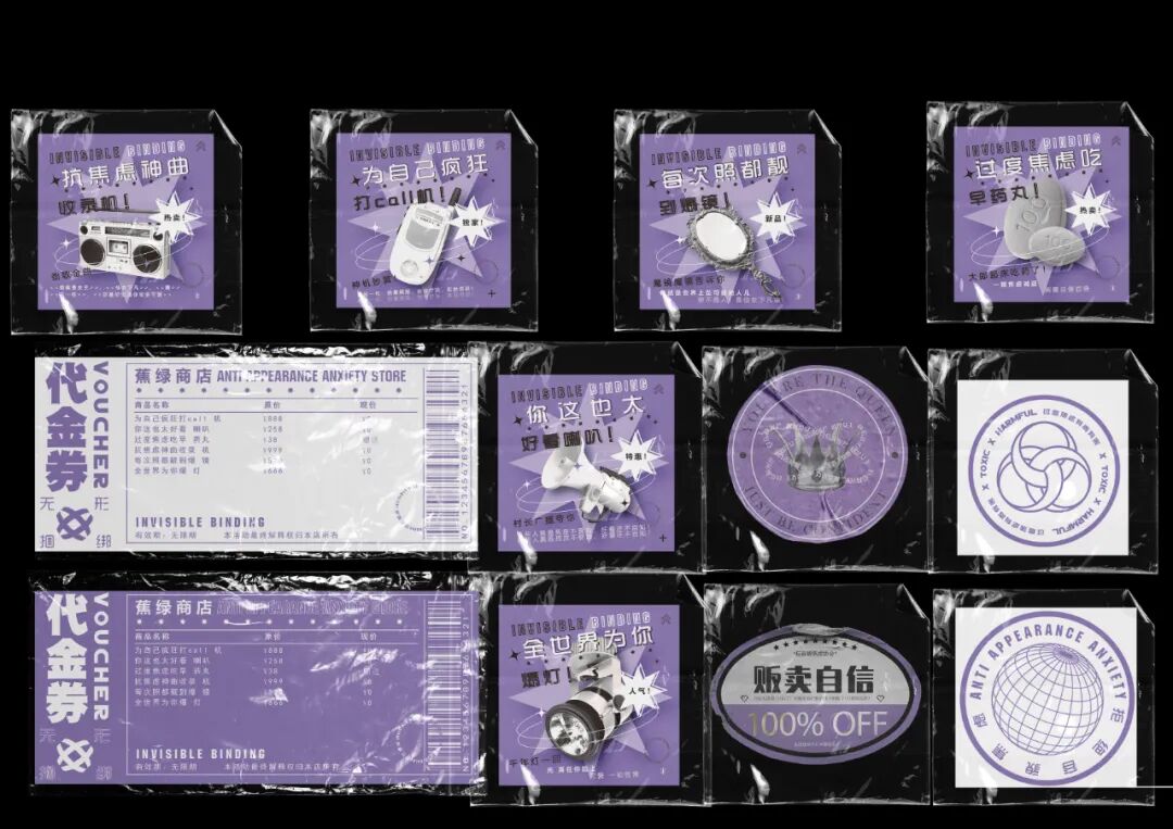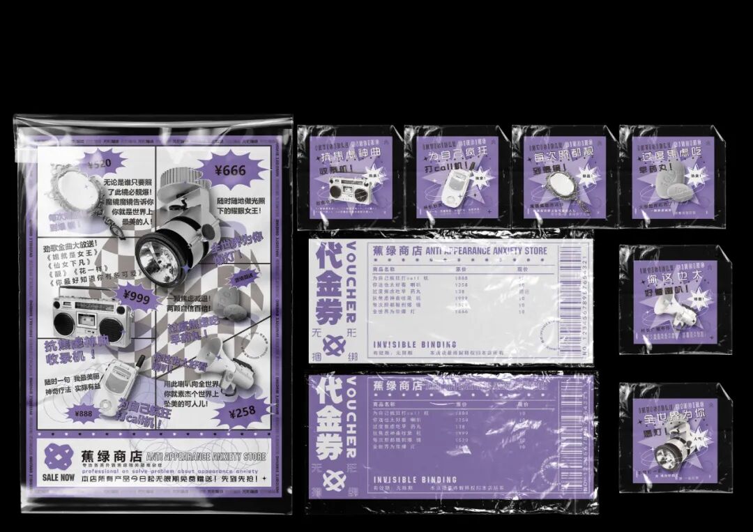 设计说明:长久以来,社会中一直存在着一种固有的模式化的审美。现今的社交网络正无限加重着人们对自己外貌的重视程度,容貌焦虑也似乎成为了网络时代中我们的“时代病症”,我们无形中都与这些审美模式捆绑束缚在了一起。本次设计通过书籍、图形设计与装置设计展示出当代社交媒体对人们容貌焦虑的影响,容貌焦虑的含义、影响,及蕉绿商店中售卖的防焦虑商品传达出鼓励大家更自信、摆脱固化审美的束缚与容貌焦虑的观念。