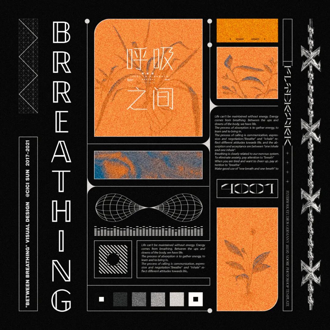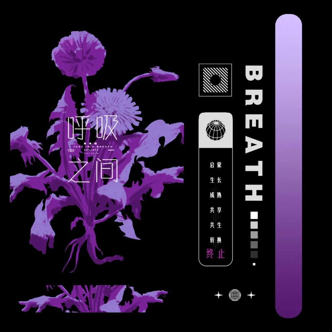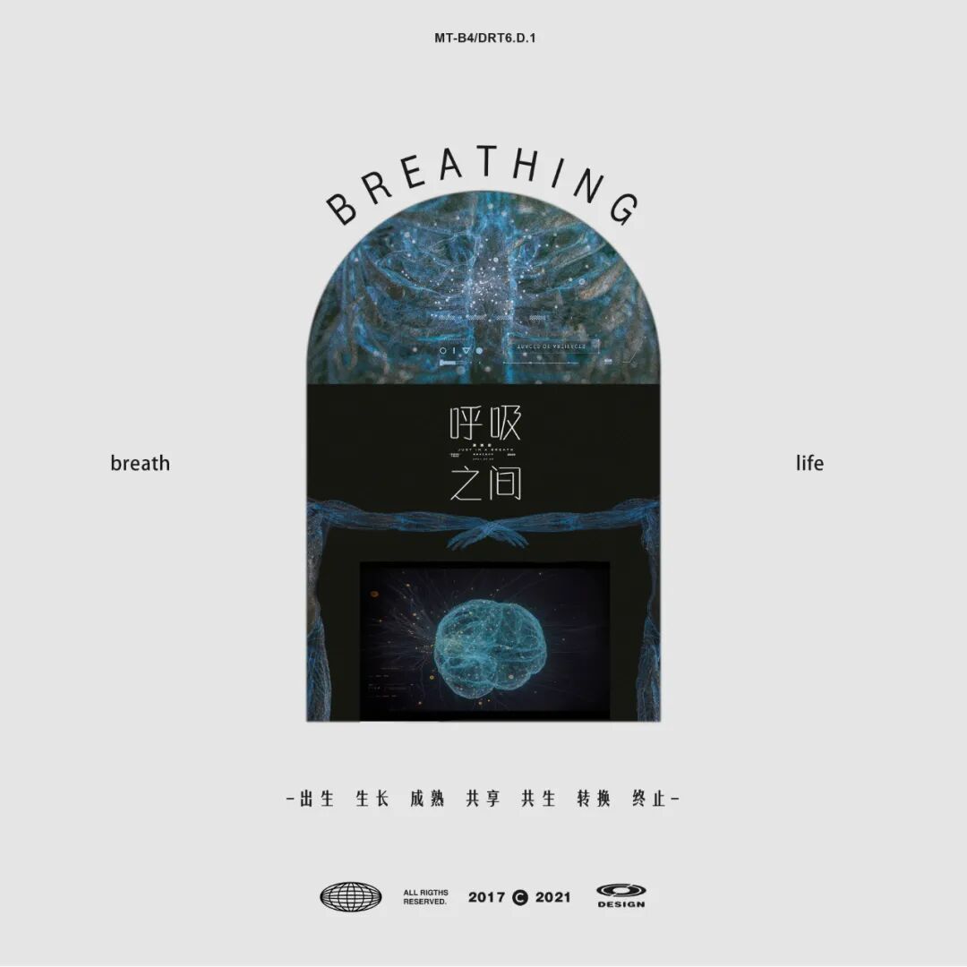 设计说明:“呼吸之间”是通过不同角度去解读呼吸,万物皆有呼吸,在身体的起伏中,我们获得了生命,但呼吸又不仅仅是生命,它是吐故纳新、是能量的转换、是生命的链接。把呼吸比喻成人生:出生、生长、成熟、共享、共生、转换、终止七个阶段,在作品中表现。