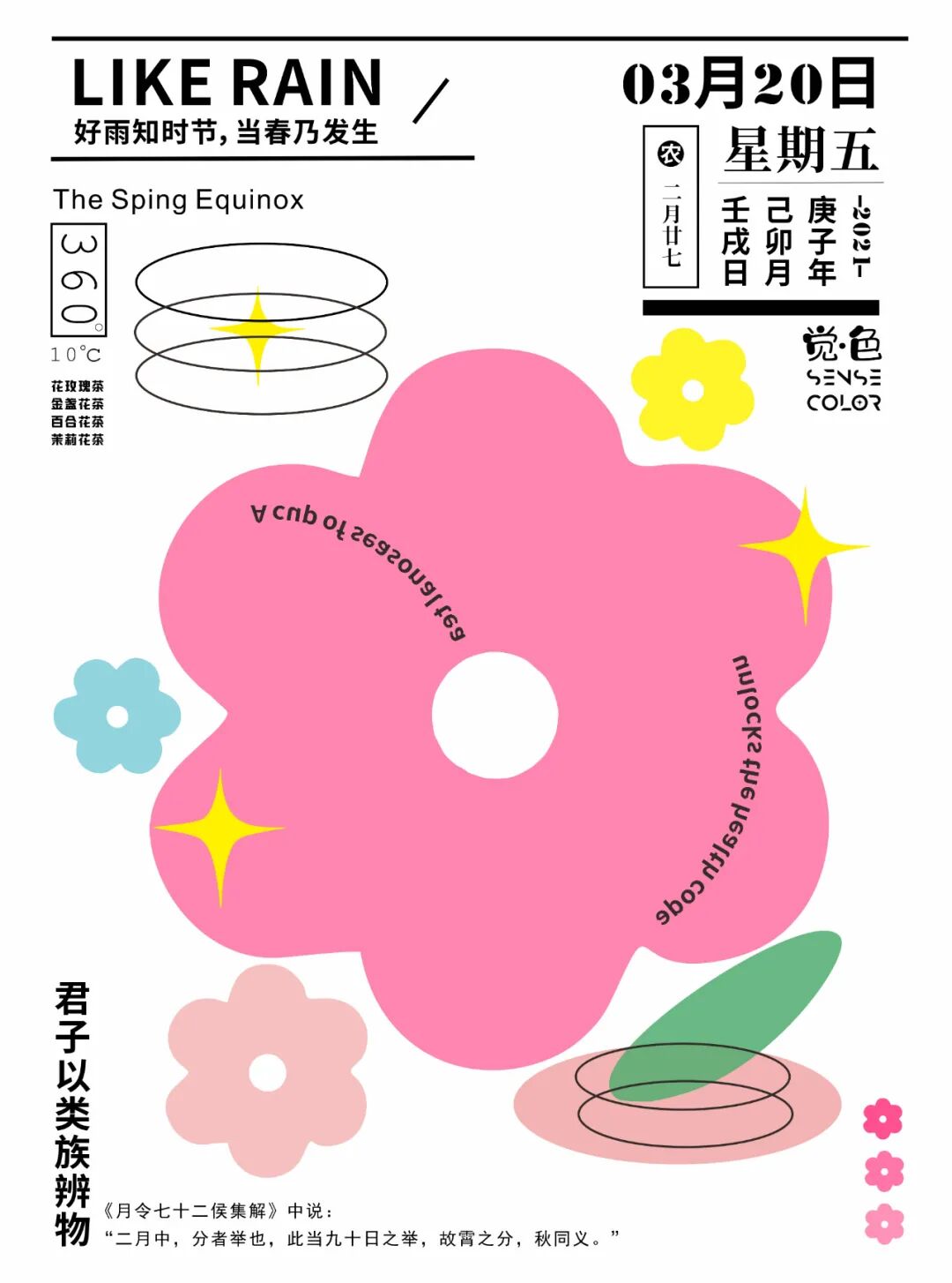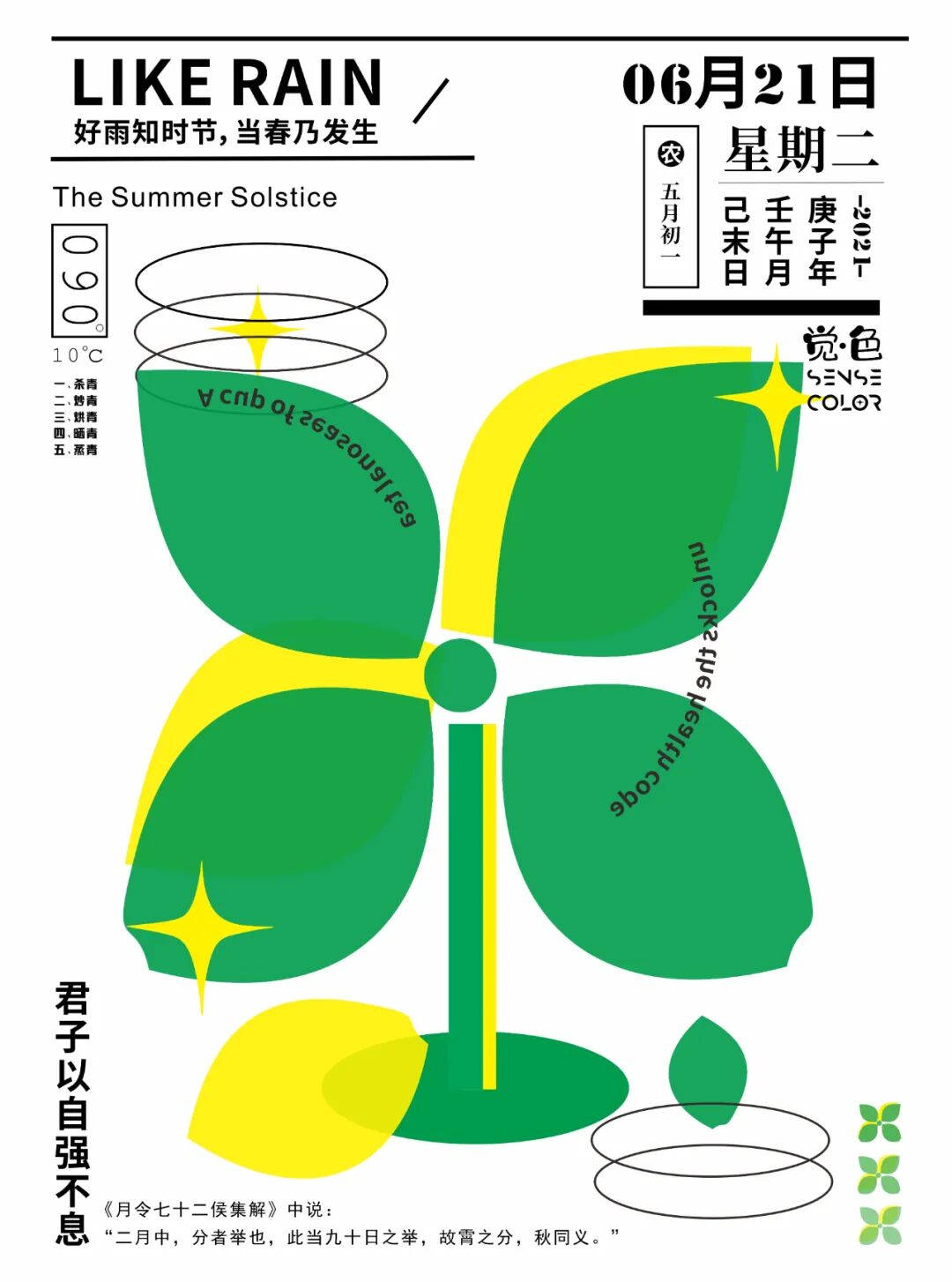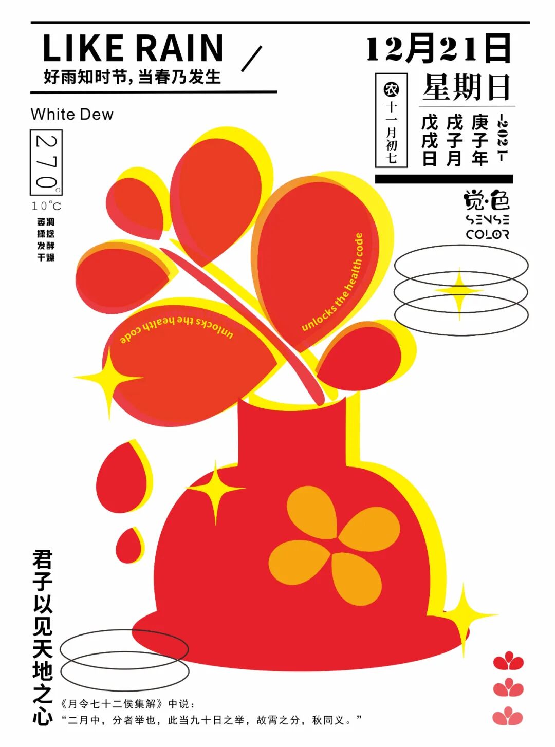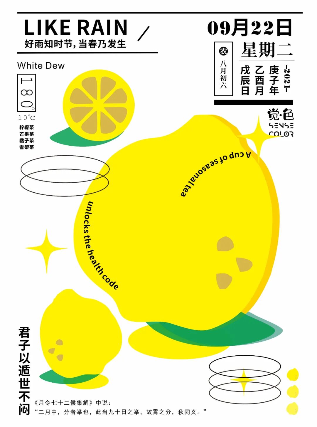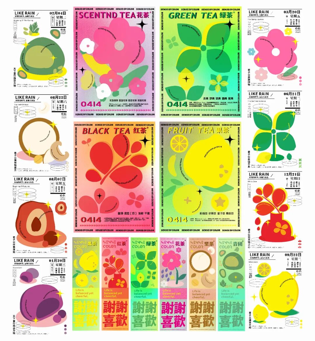 设计说明:二十四节气代表着气候的变化,影响着农事的安排,与茶饮健康也有着密切的关系。该设计以二十四节气的春分、夏至、秋分和冬至为切入点与茶点文化相结合,并以中国传统色作为品牌的辅助色,创作完成系列设计,以此唤醒人们对节气和传统色的关注。