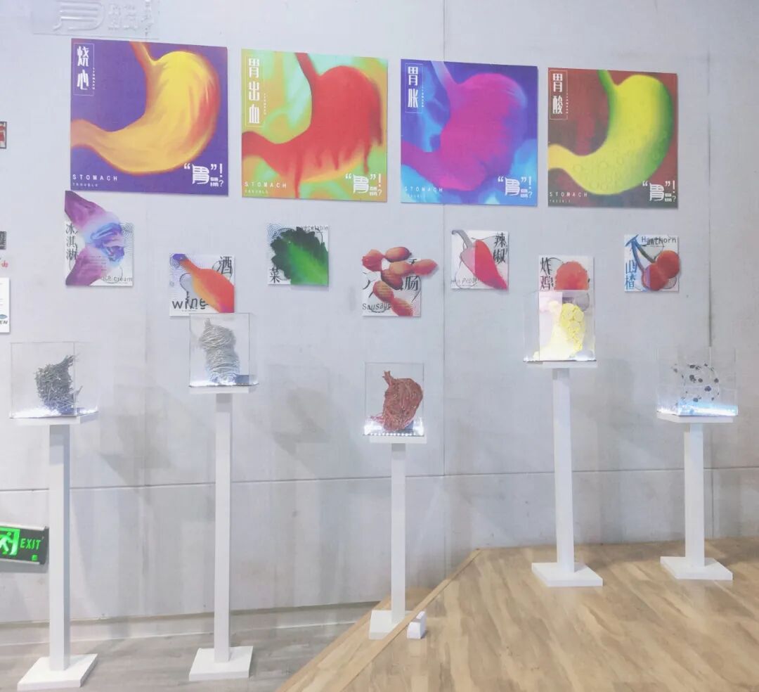 以钉子、辣椒、柠檬、铁丝等元素通过不同组合与构成方式形成装置模型,直观的表现胃痛、烧心、胃痉挛、胃酸、胃溃疡五种病症,给人以强烈的感官刺激。同时通过互动装置让大家了解到一些食物会给我们的胃带来怎样的影响。通过这次综合设计向人们普及胃病的相关知识,引起大家对胃病的重视。