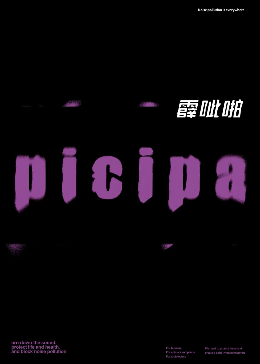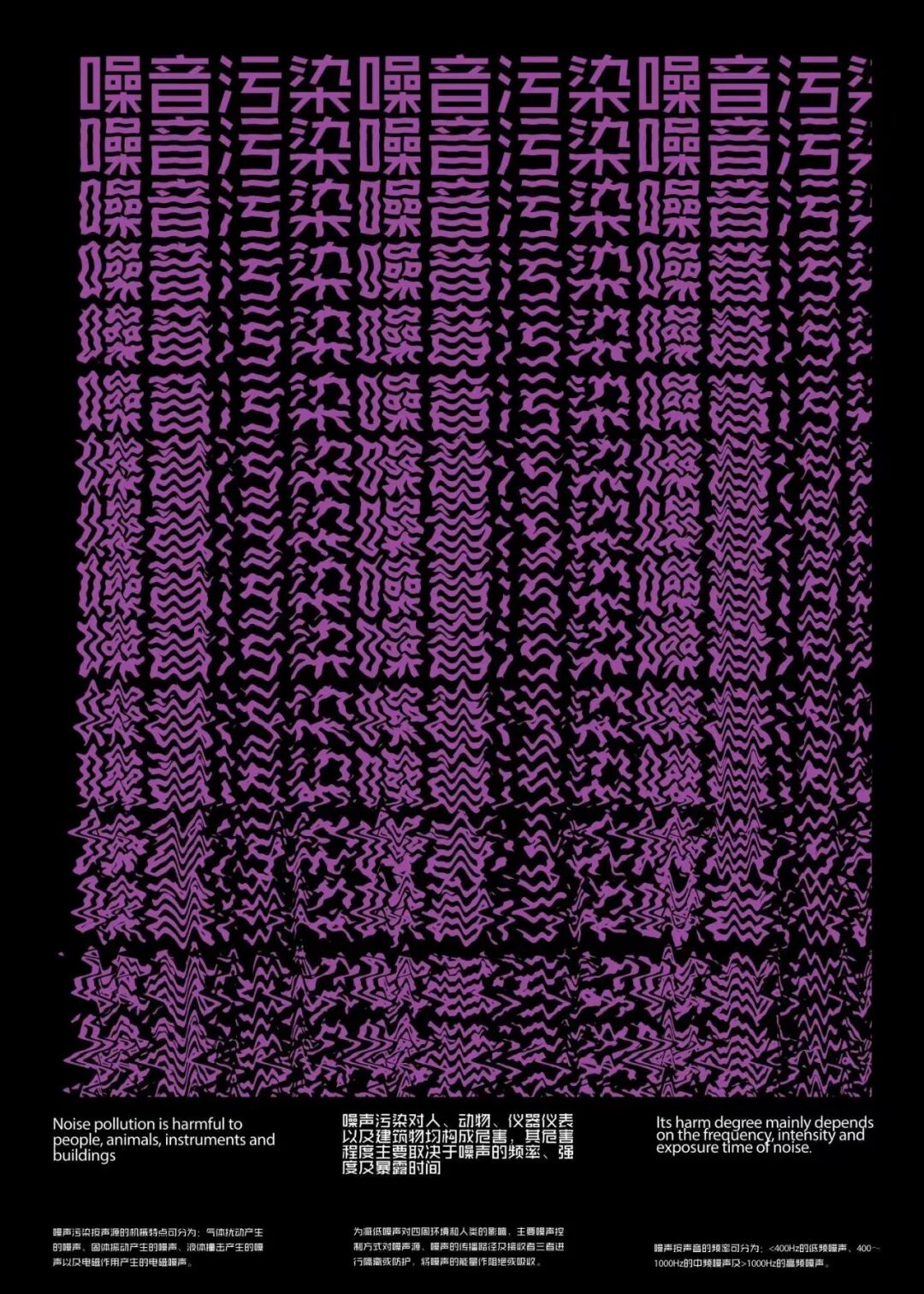 该主题分别用插画和图形设计的表现方式,从人类、动物,建筑物以及噪音的分类来设计,在噪音污染日益严重的今天,人类、动物的健康体质和建筑物的完整性面临着极大的挑战,通过用刺眼的色彩,夸张的插画和图形来表现噪音对一切生命体和非生命体造成的危害。希望我们可以减少噪音,保护环境。