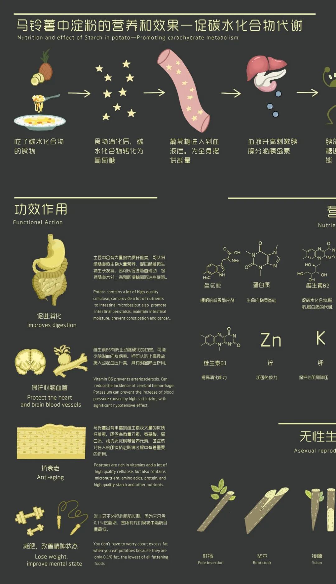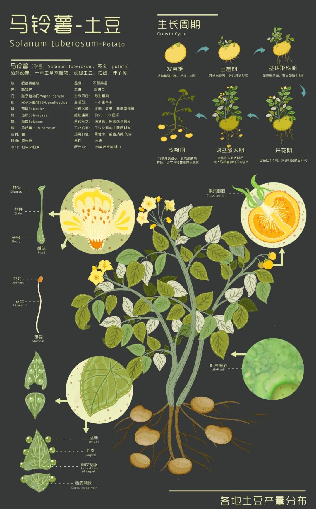 设计说明:当代人更加着重于社会发展,不免忽视了生命中的细节。比如“李子柒”的“一生系列”就是通过记录很多农作物的一生,该系列视频以作物的播种为起点,纪录其从种子到成熟收获,最后烹为佳肴的全过程,然后让我们了解到这些农作物是怎么样成长,它的果实又是怎样利用的。想透过设计去认识这个世界最本质最朴实最生活的一些东西,就植物生长过程和植物本身为例,他们在这些方面有它独特的美。通过研究土豆的成长过程以及成熟收获的土豆,以创意手法的方式再现土豆的生长过程,和土豆本身在生活中作为美食的魅力也可以有意想不到的表达。