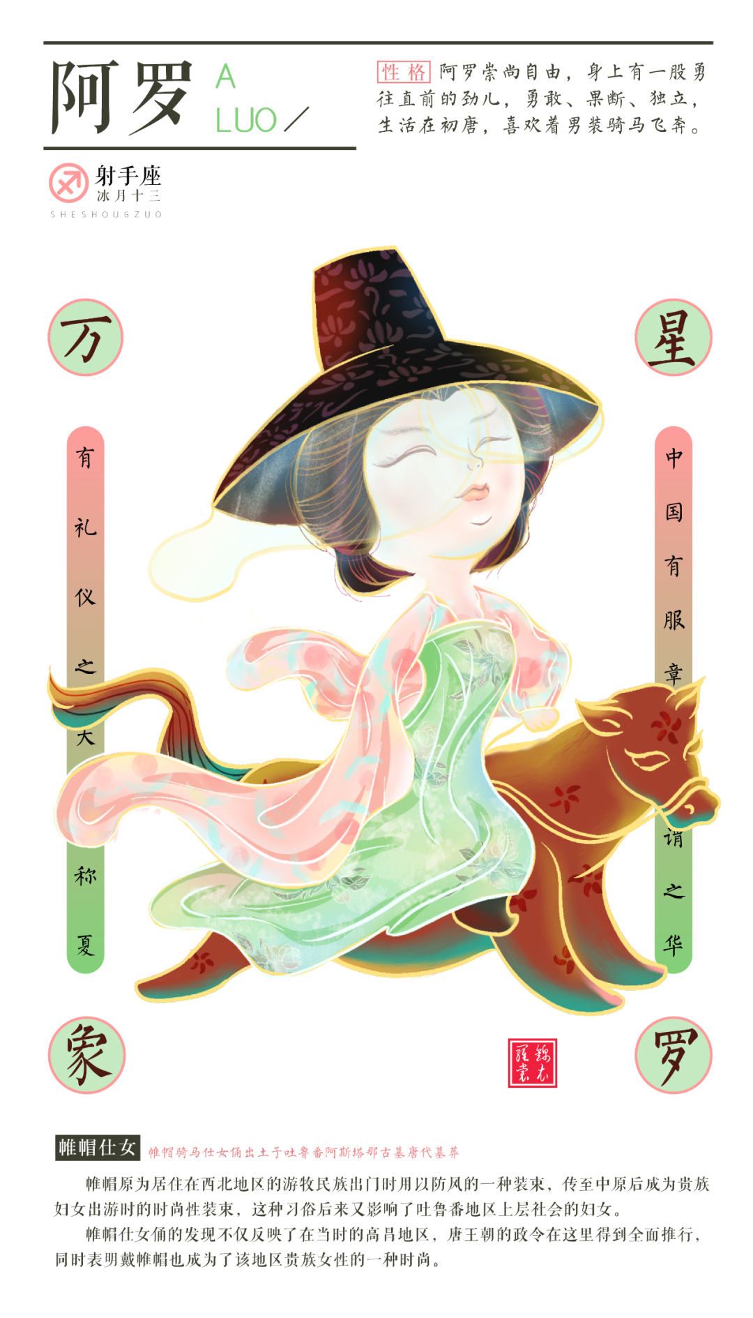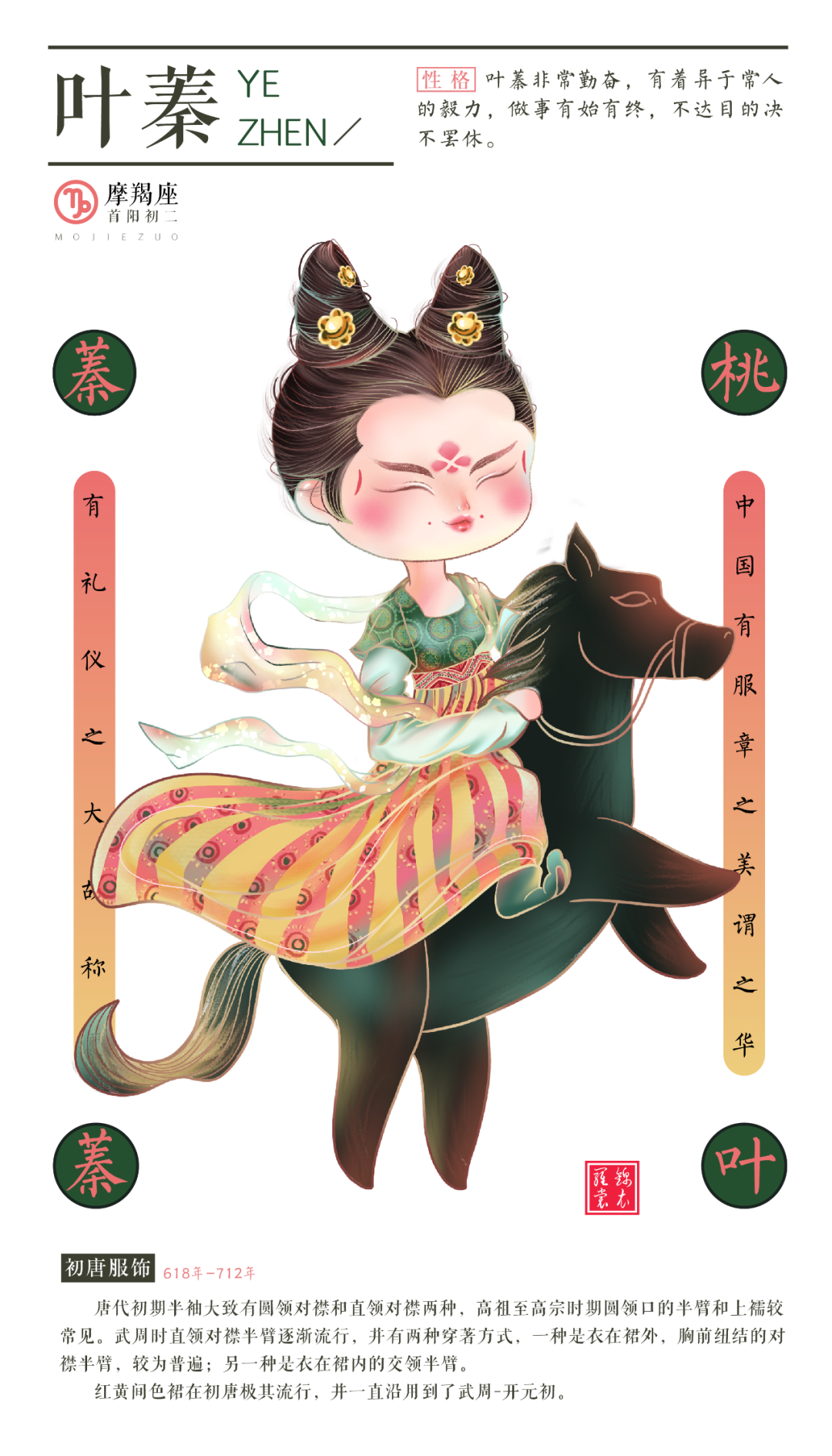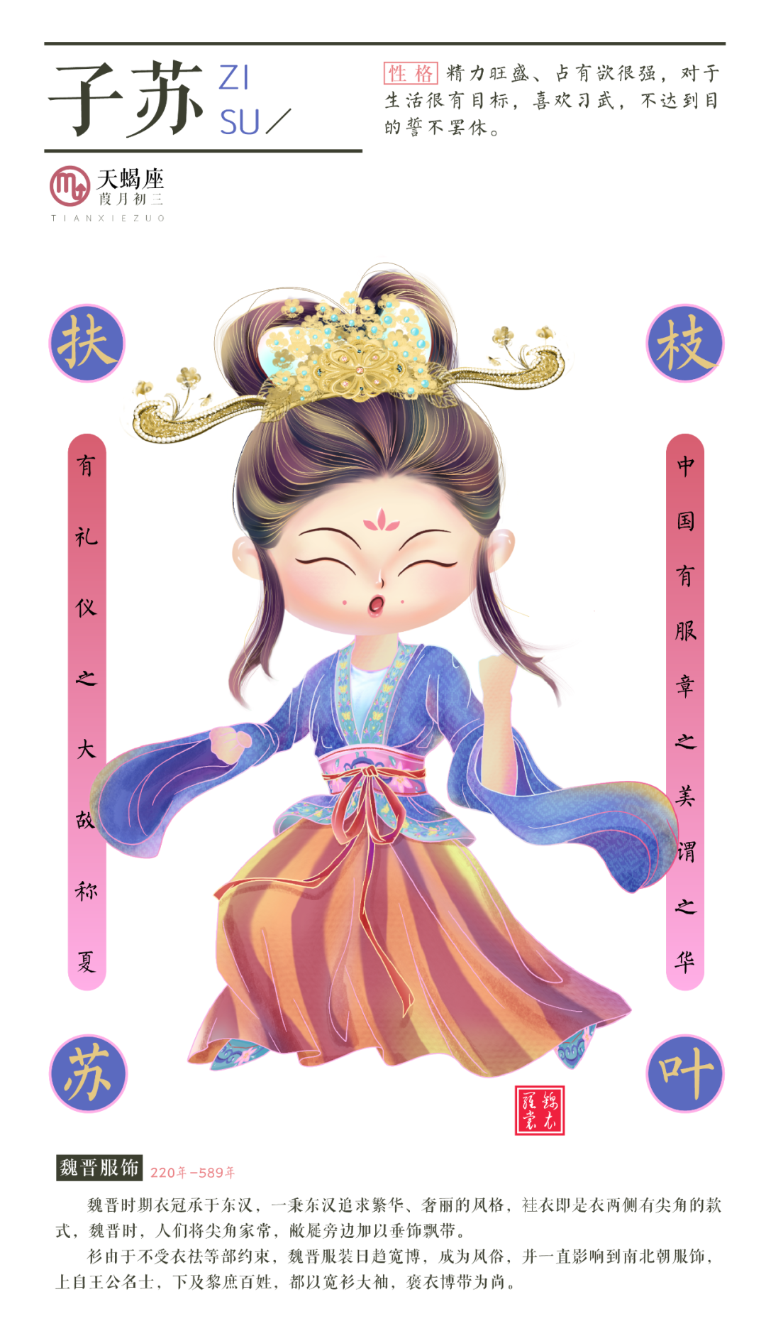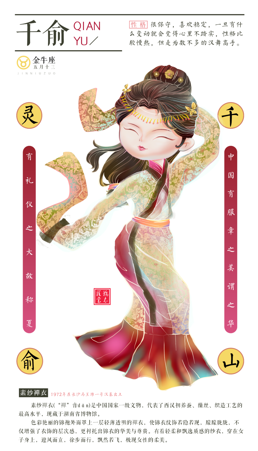 本套设计创作了十二个身着不同时代特色服饰的美人,或长袖善舞,或巾帼英雄,或骑射踏青,或端庄贤淑。并采用盲盒手办这种新潮的形式,调动人们对汉服的热情和兴趣。服饰配色方面在尊重历史的情况下选用了更容易让人接受的配色,在古典中体现现代,在现代中蕴含古典。