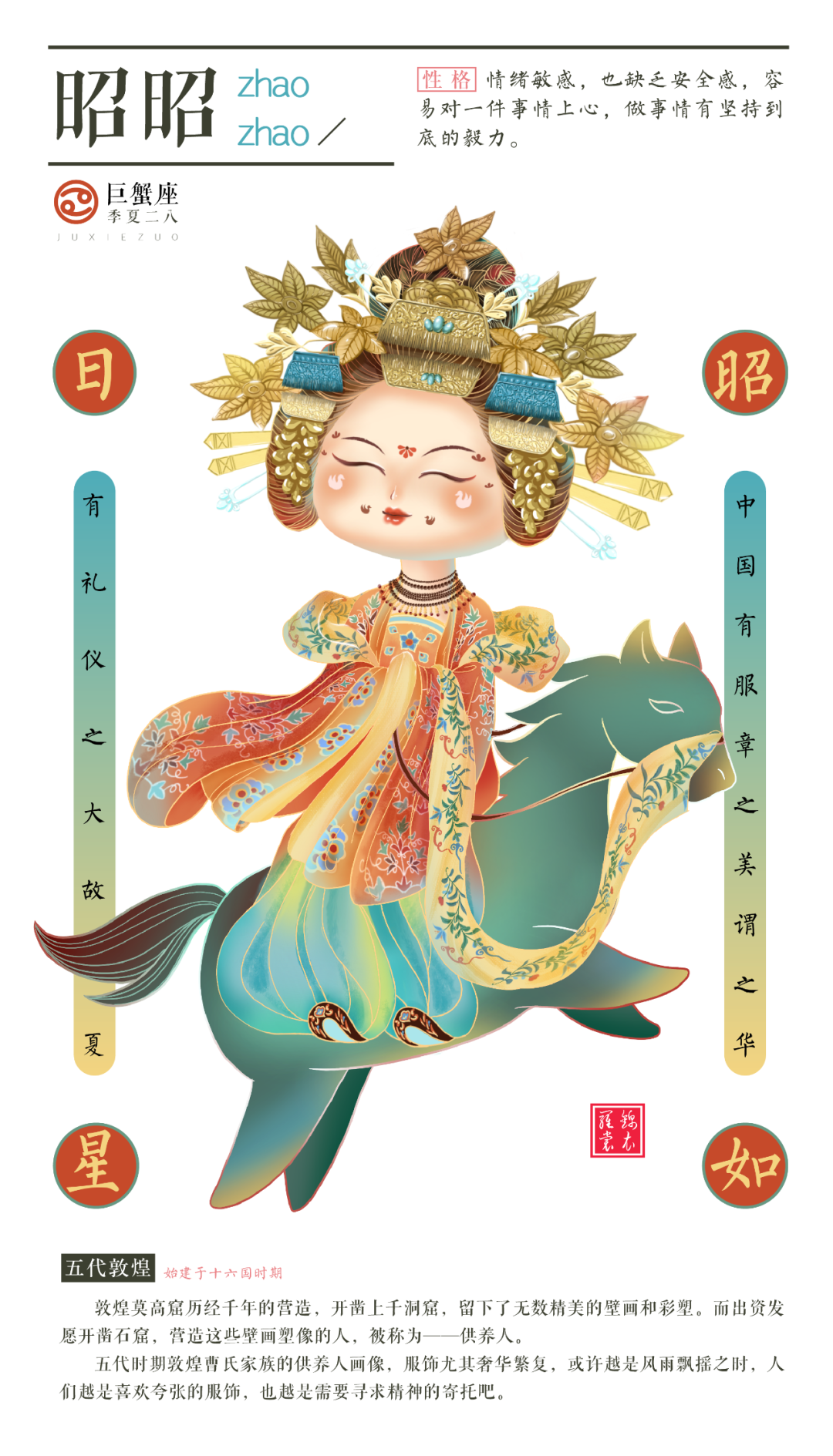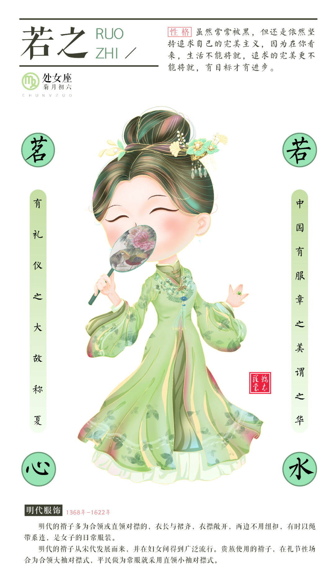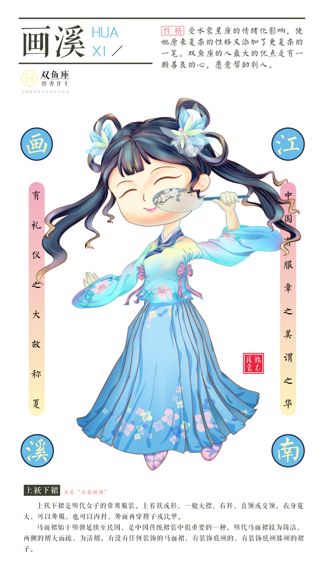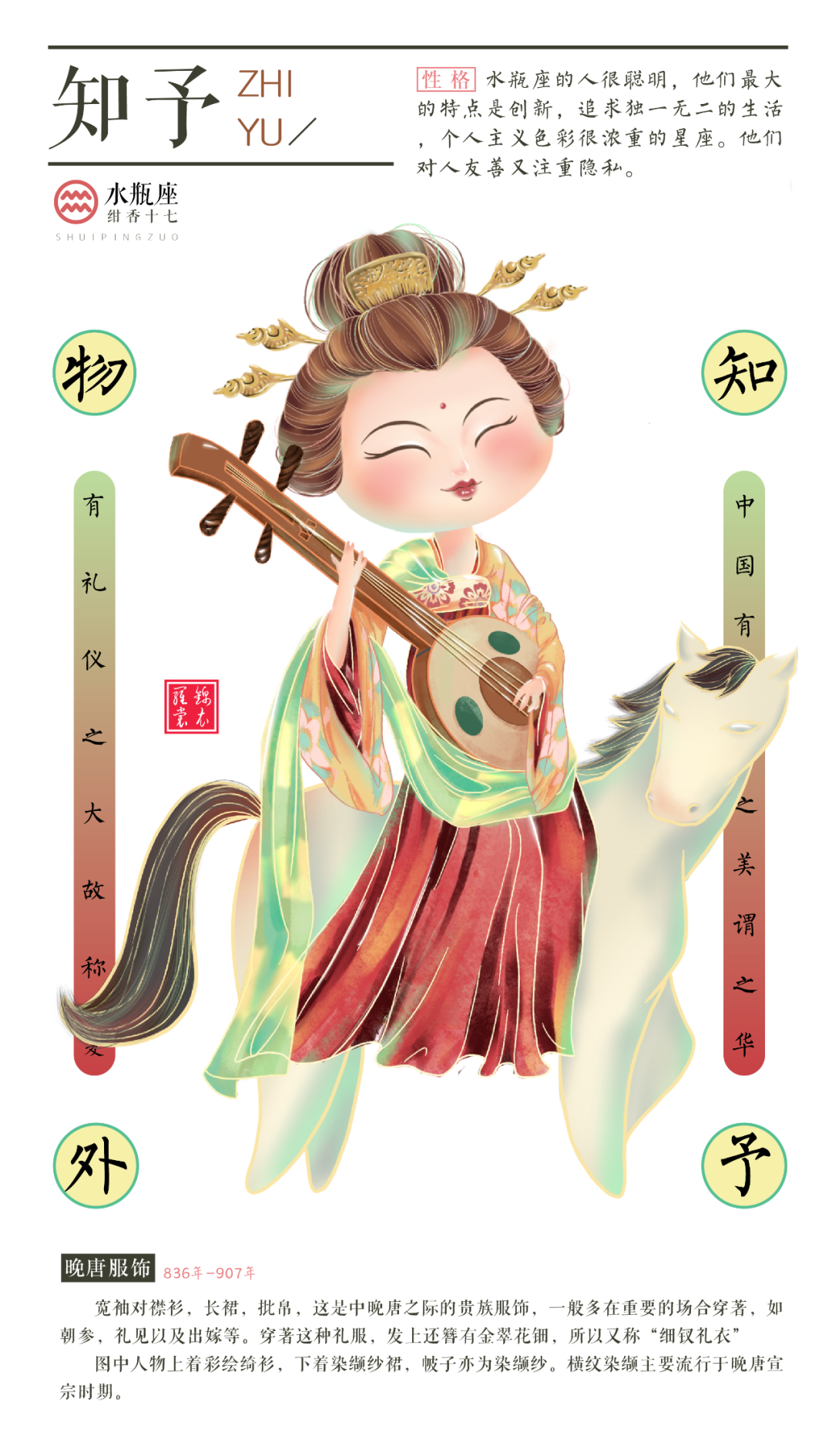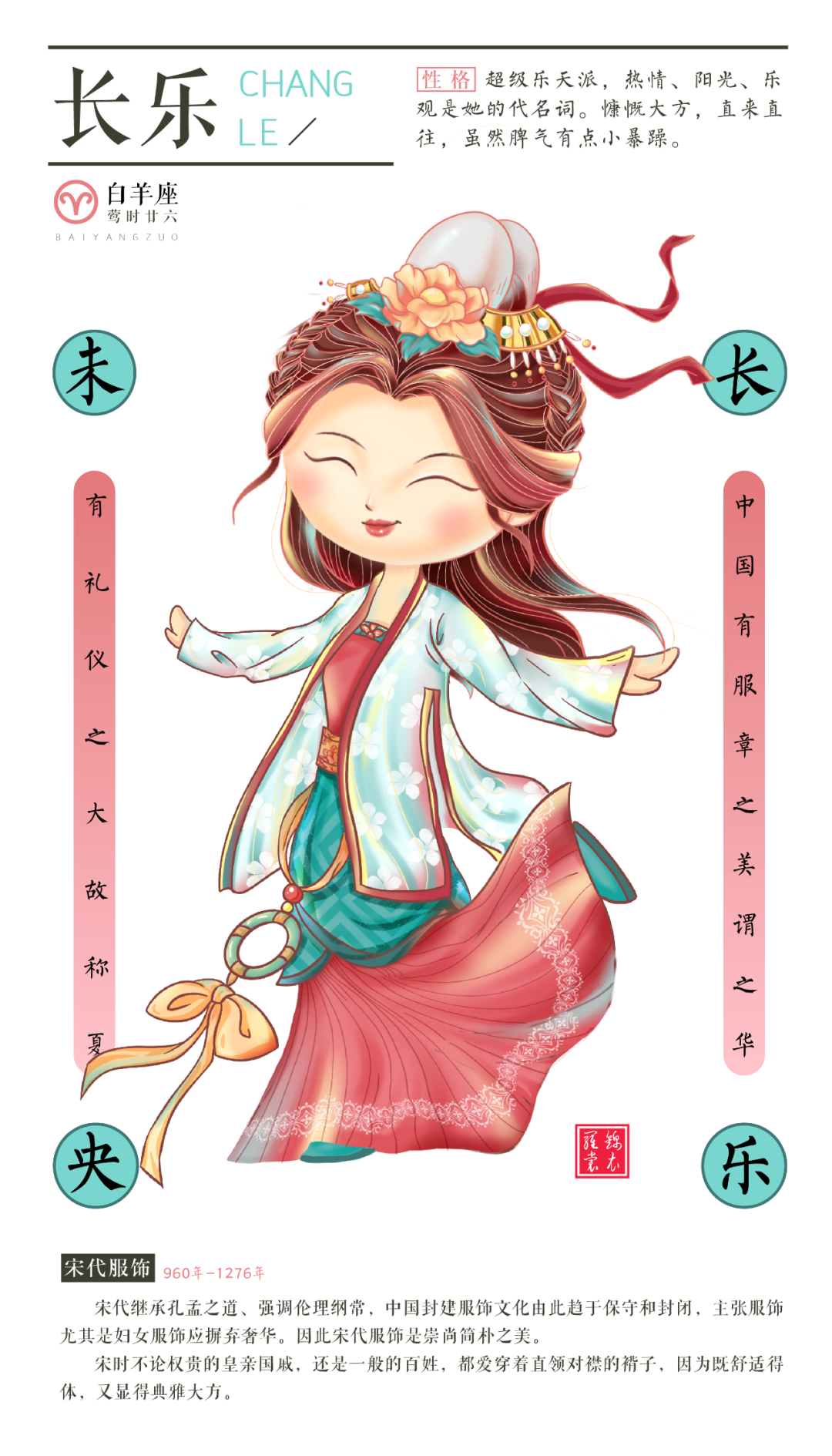 本套设计创作了十二个身着不同时代特色服饰的美人,或长袖善舞,或巾帼英雄,或骑射踏青,或端庄贤淑。并采用盲盒手办这种新潮的形式,调动人们对汉服的热情和兴趣。服饰配色方面在尊重历史的情况下选用了更容易让人接受的配色,在古典中体现现代,在现代中蕴含古典。