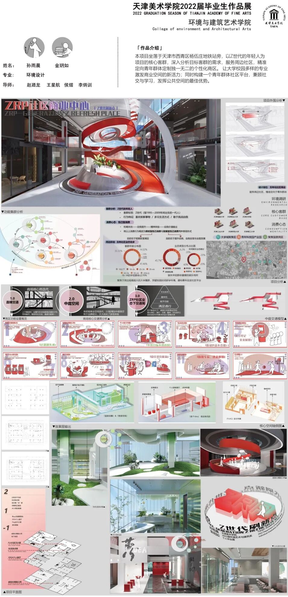 指导老师评语:本方案站在年轻人的视角,关注当下的商业空间新样态,以活力的颜色,流畅的交通动线,丰富的商业场景,增加了年轻人的参与感和互动性,达成了时尚活跃,积极向上的发展型悦已消费模式。针对地块周围的大学布局商业业态,功能包括自习室、社交空间、脱口秀、绿植种植、创新创业基地等丰富的经营形式。设计多元合理,表现出年轻人喜好的消费形式,是旧建筑更新的优秀方案。