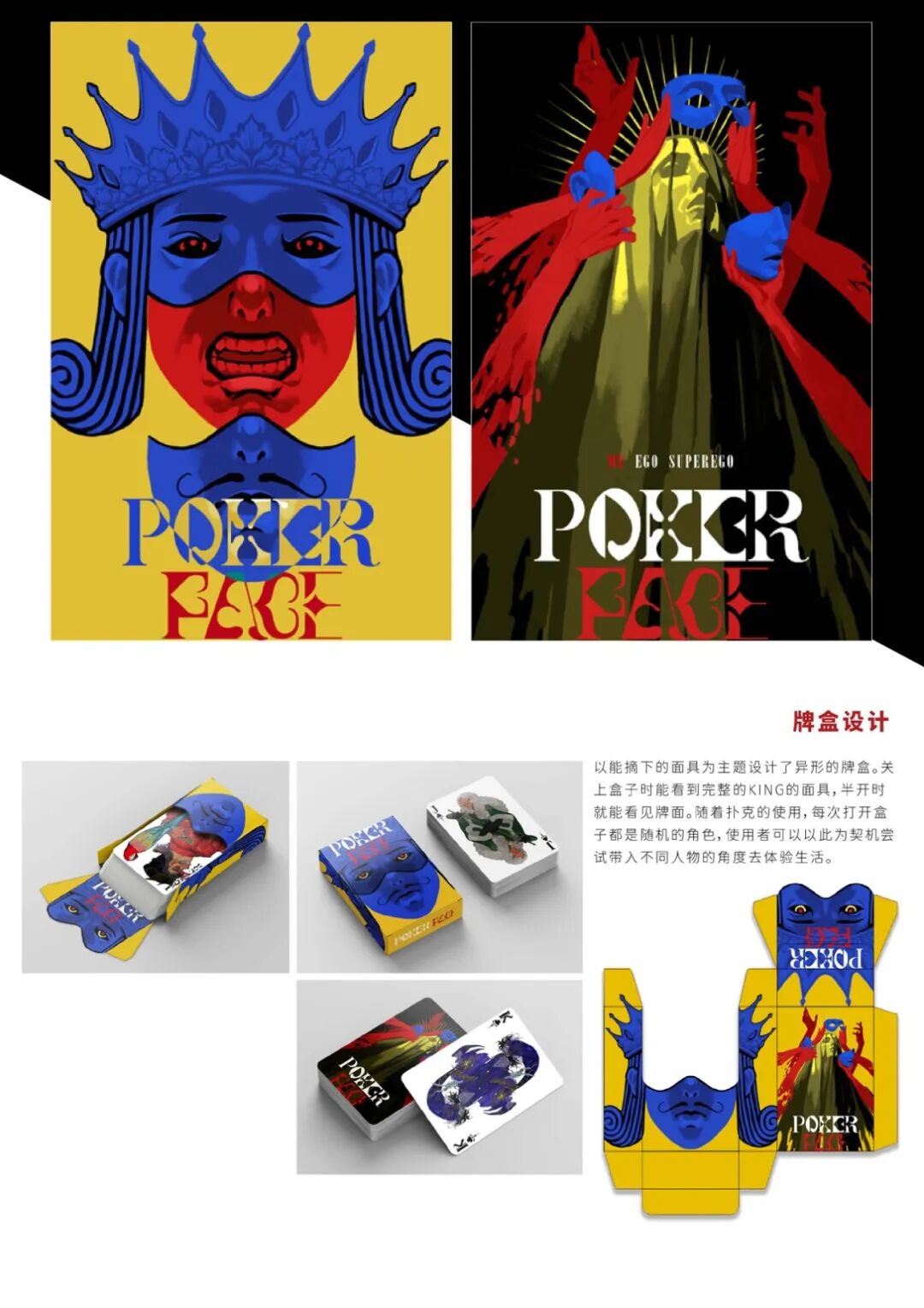 指导老师评语:《扑克脸》作品,以传统“扑克”为媒介,表达社会关注,阐明作者立意,让观者通过此媒介重新审视自我,突破交流屏障,实现真实交流,作品采用插画手法进行角色设计,造型新颖,色彩丰富,在“扑克”介质的规则上进行创新表达,具有极好的视觉冲击力。