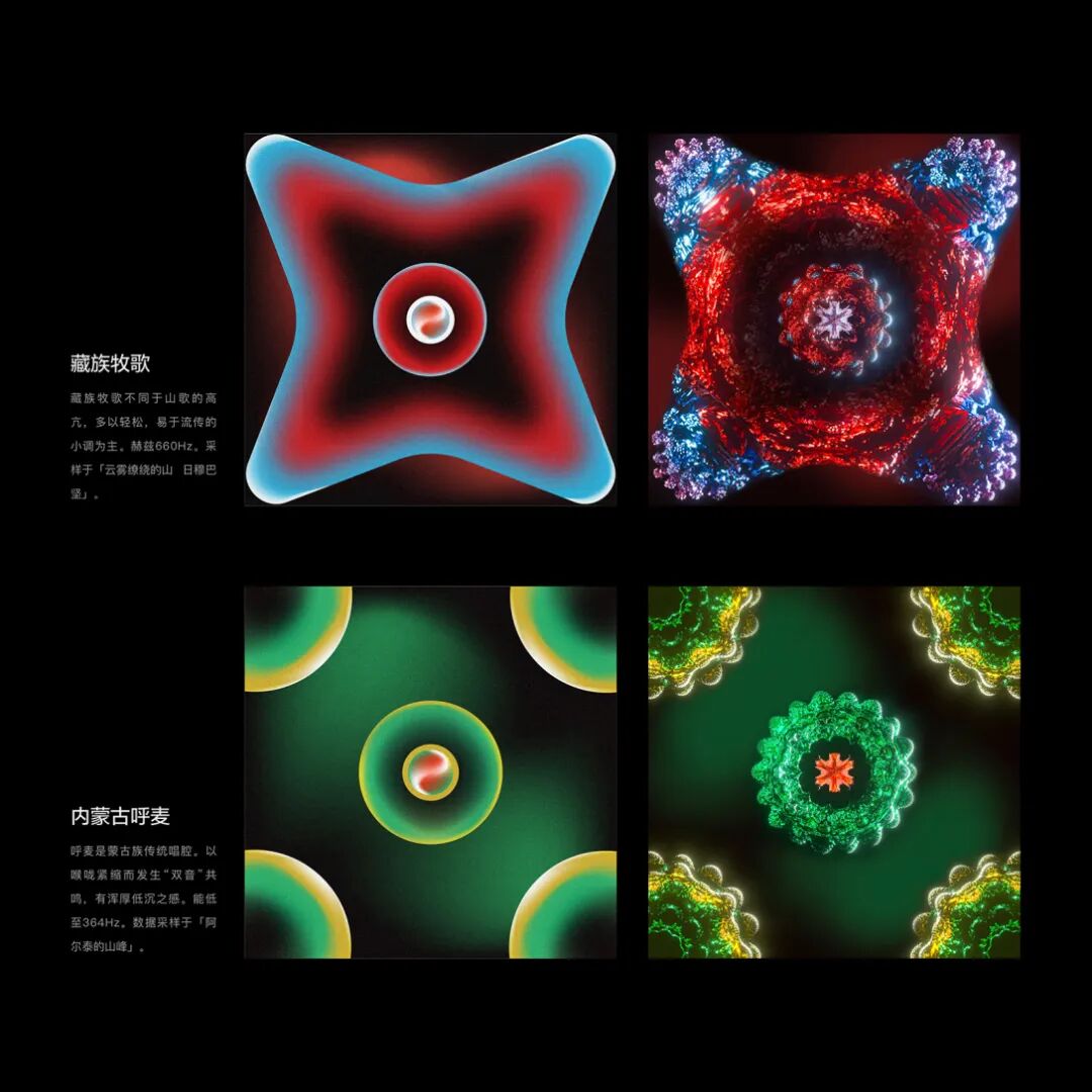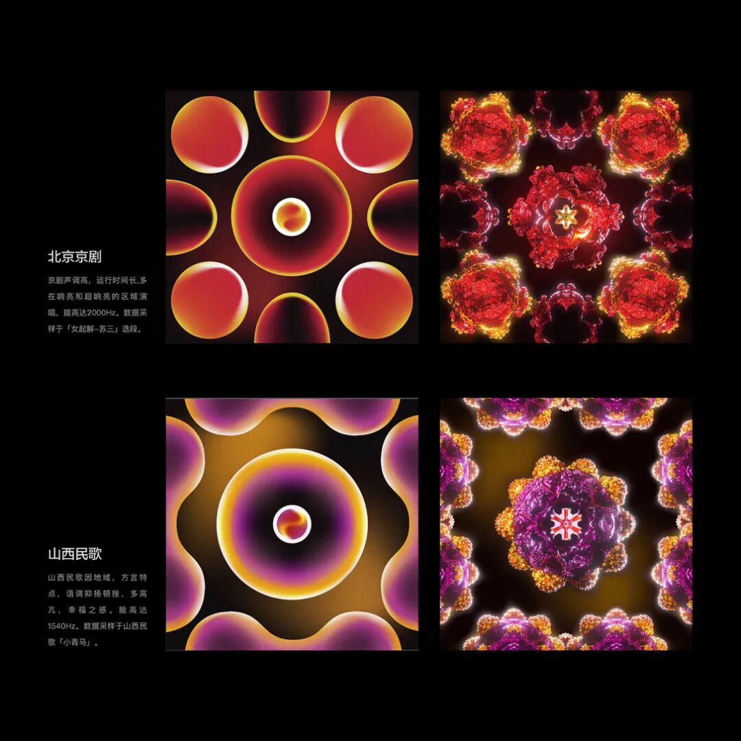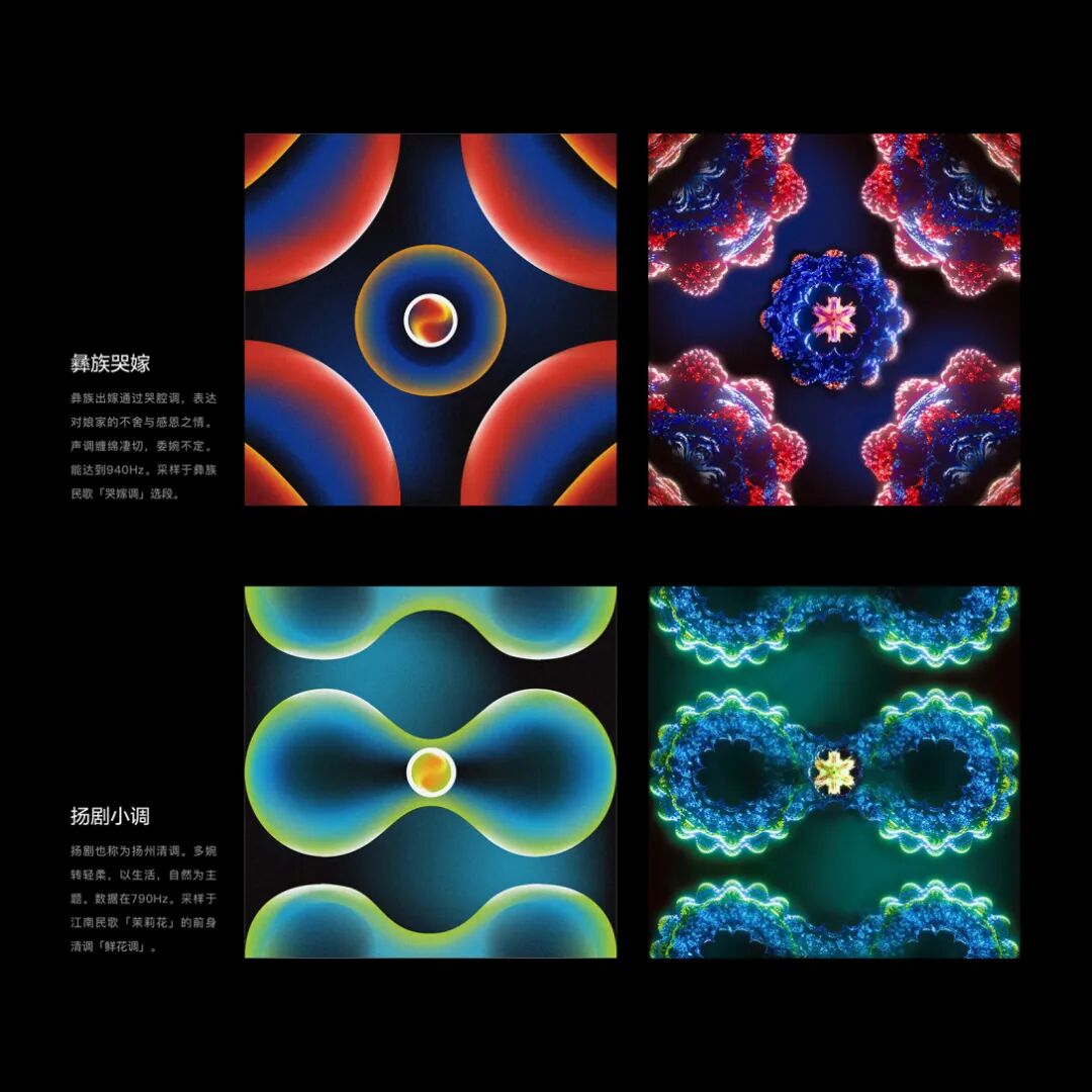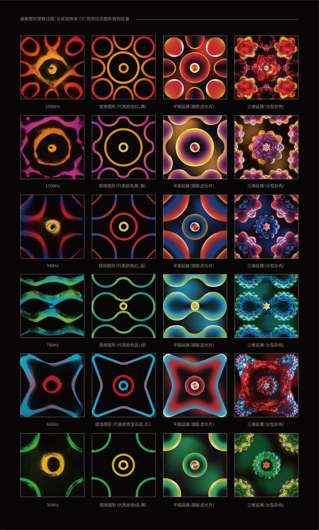 指导老师评语:林仪娟同学的这件作品,选题立意非常精准。对中国多地域语言的特色进行研究,通过克拉尼金属板实验的呈现作为突破口,进行多维度的视觉呈现。在不同方言音色表现出的原始图形的基础上,进行二次创作。反映了该同学在跨学科研究上有很广的宽度,同时视觉表达层面具有较高的设计水平与延展意识。