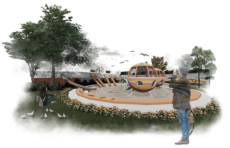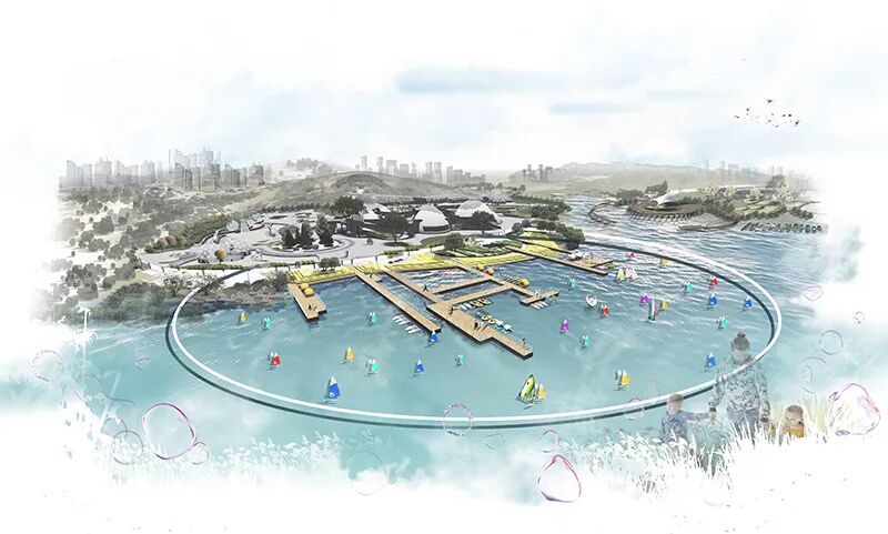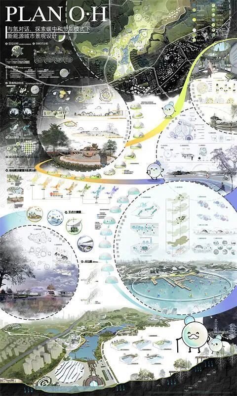 设计说明:在碳中和节能模式下,以青岛大涧山片区为基地,计划发展创新型氢能源主题公园。结合周边场地性质,因地制宜地塑造园区内的序列空间。提取氢原子的圆形形态,加以艺术化处理,将公园绿色基质溶解在城市之中。并通过寓教于乐的方式,科普氢能源相关知识,引导观者穿梭于美学与功能兼具变化的氢能源空间中,强调人的参与互动性,景观的延续多样性,人文与自然辉映,营造城市生活所共享的公共空间。