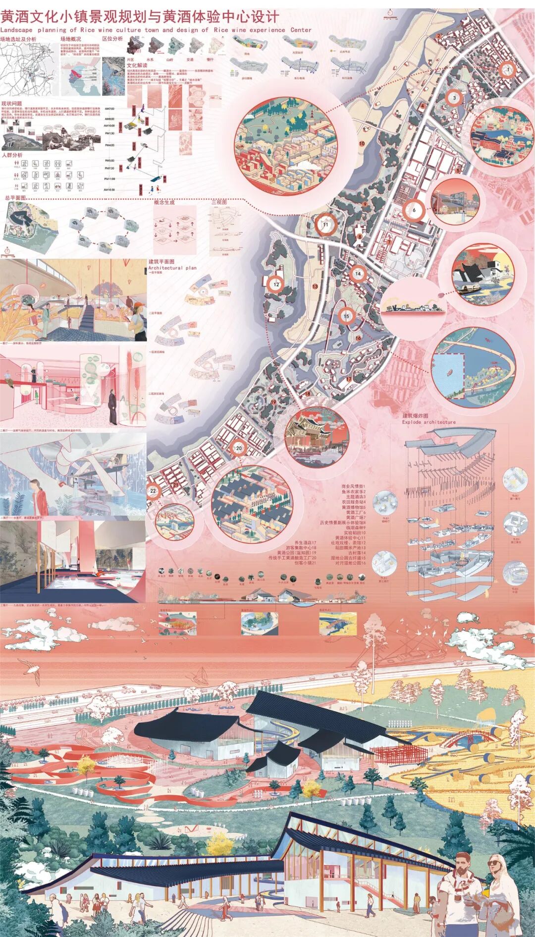 指导老师评语:本案为文旅产业特色设计方案,从实地勘察到方案推敲再到效果呈现都经过了若干轮的推敲和讨论,特别是把老城改造和新文创产业的结合作为了着力点;把在地性文化和老城黄酒博物馆、乡村特色公共文化活动中心、老厂房改造等核心位置的设计相结合;把教育、娱乐、购物、住宿等空间功能和使用者需求相结合。设计风格现代,设计元素国潮,设计功能合理适用,符合当今国家碳排放节能减排要求和人民群众的审美标准。