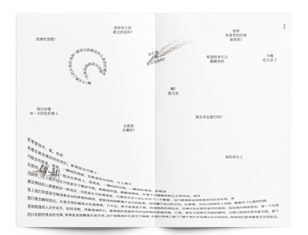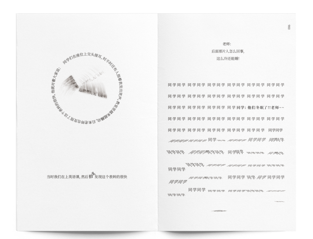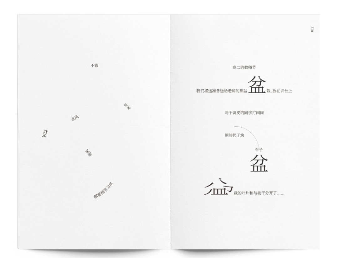 指导老师评语:《上课、起立》是书籍整体设计作品,作者在开本、材质、装订、字体、排版等多重设计角度进行思考,给观者呈现了一本有温度的、有情感的、有情趣的书。在设计过程中,作者用最朴素的文字设计作为情感、意趣的表达手段、通过不同的组合、排列、应用疏密、大小的对比、让简单的文字有了画面感、节奏感。