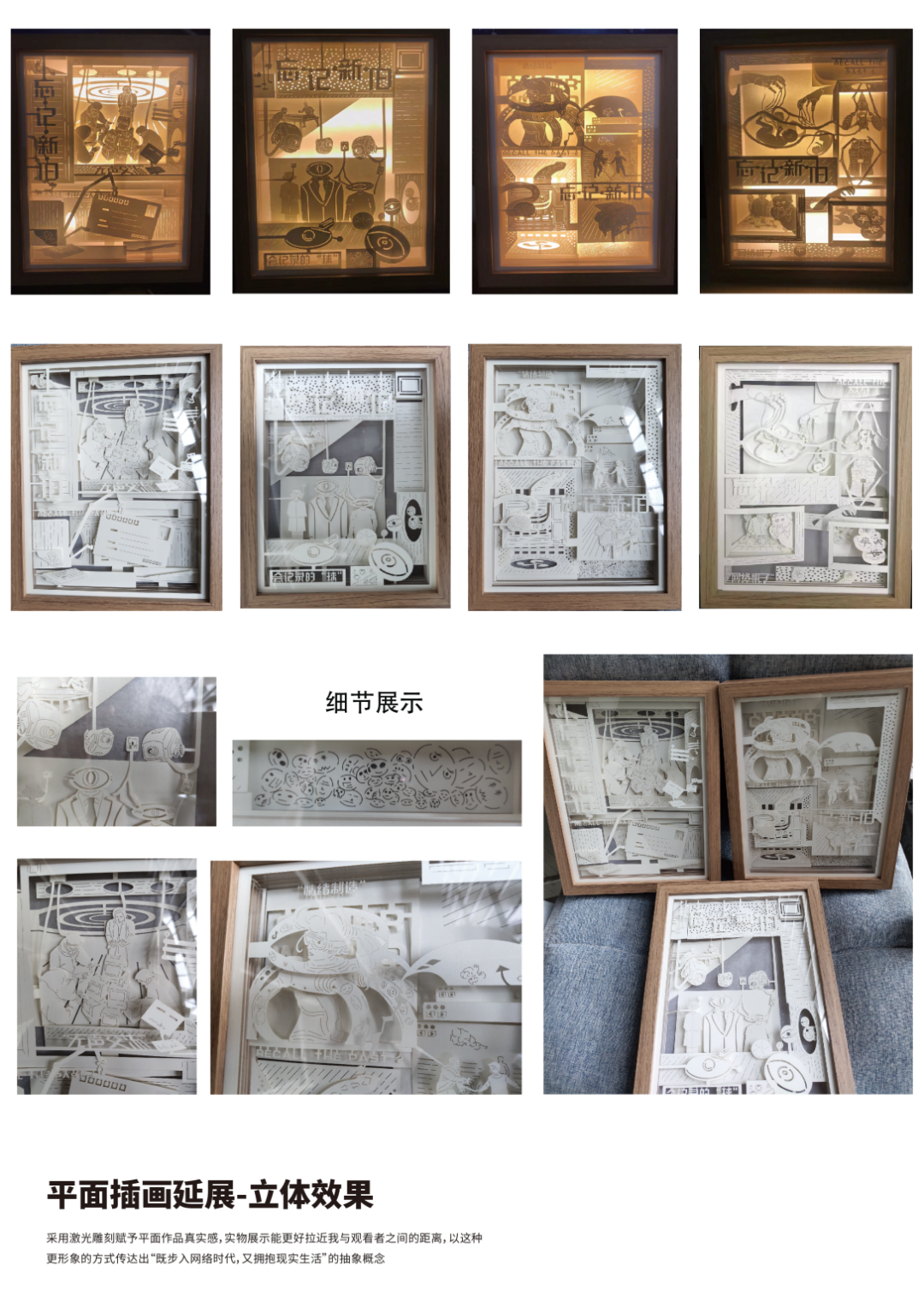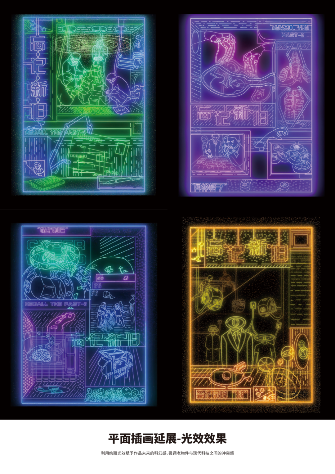 设计说明:主题为“忘·记·新·旧”视觉概念设计,用插画和动态结合的效果,寻找过去与现在某一现象的共通点表现画面。这一共通点可以是形象或抽象的,它改变的事物很多,但最大的改变是人情感交流的数据化,人们疏远现实世界,忽视现实情感交流,于是把这些东西展出来,赋予其社会意义。目的就是要让人能够共鸣到“既步入网络时代,也要拥抱现实”。