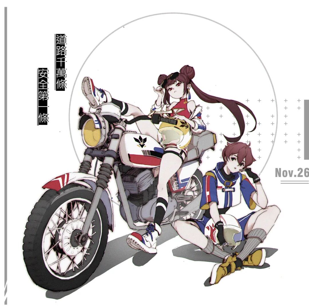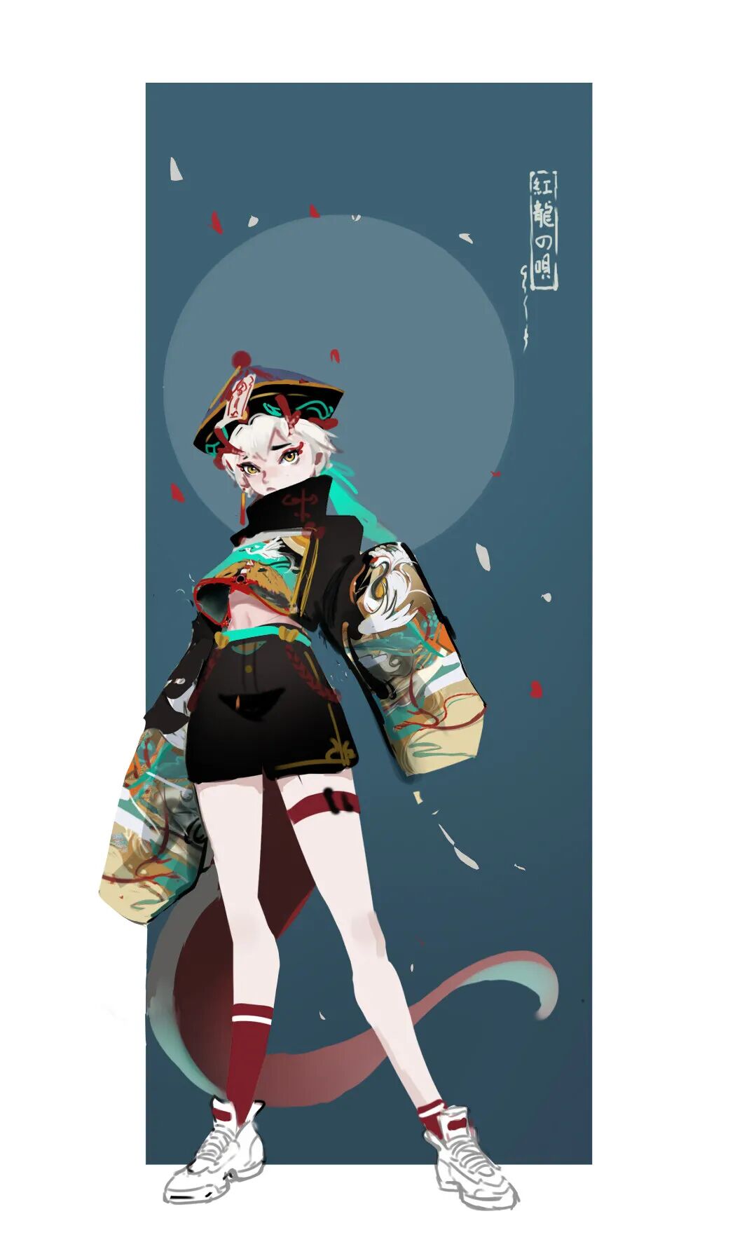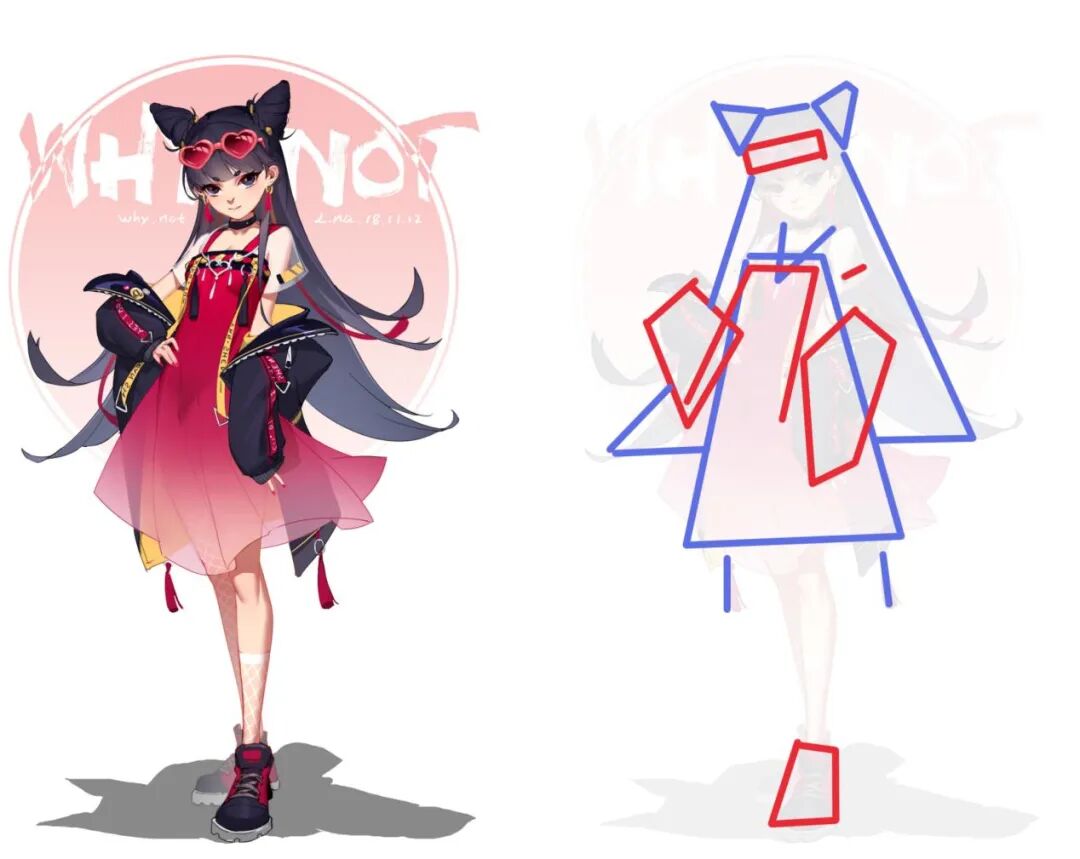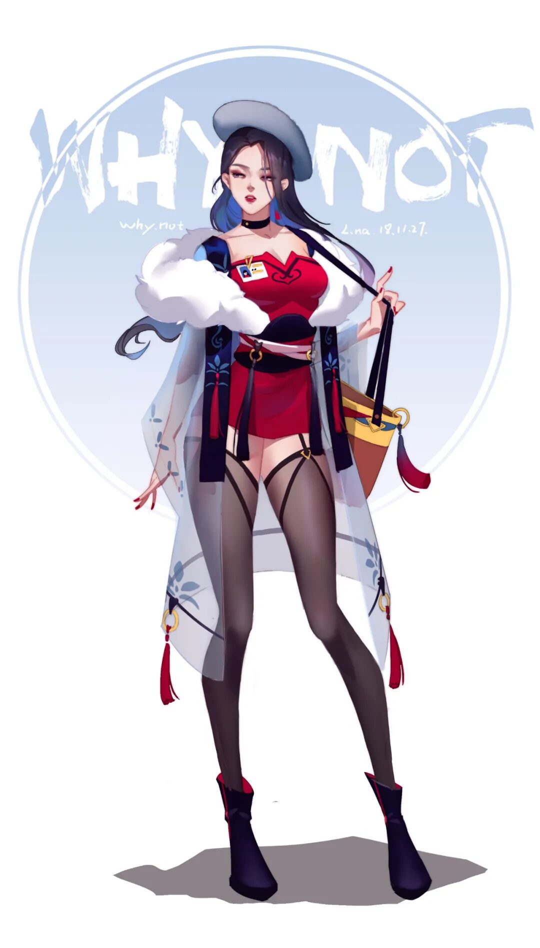 用很久之前的这张图做个例子,下面图里面蓝色的部分就是相对复古一些的剪裁或者是形状元素(比如变形的丸子头,以及汉服的剪裁,或者是胸前的璎珞)红色的部分就是被替换进来的相对现代的元素,比如印有字母的带子,外套,或者是其他一些现代装扮的元素。这种融合的方法相对会比较简单,而且看起来也会更加整和和谐一些~