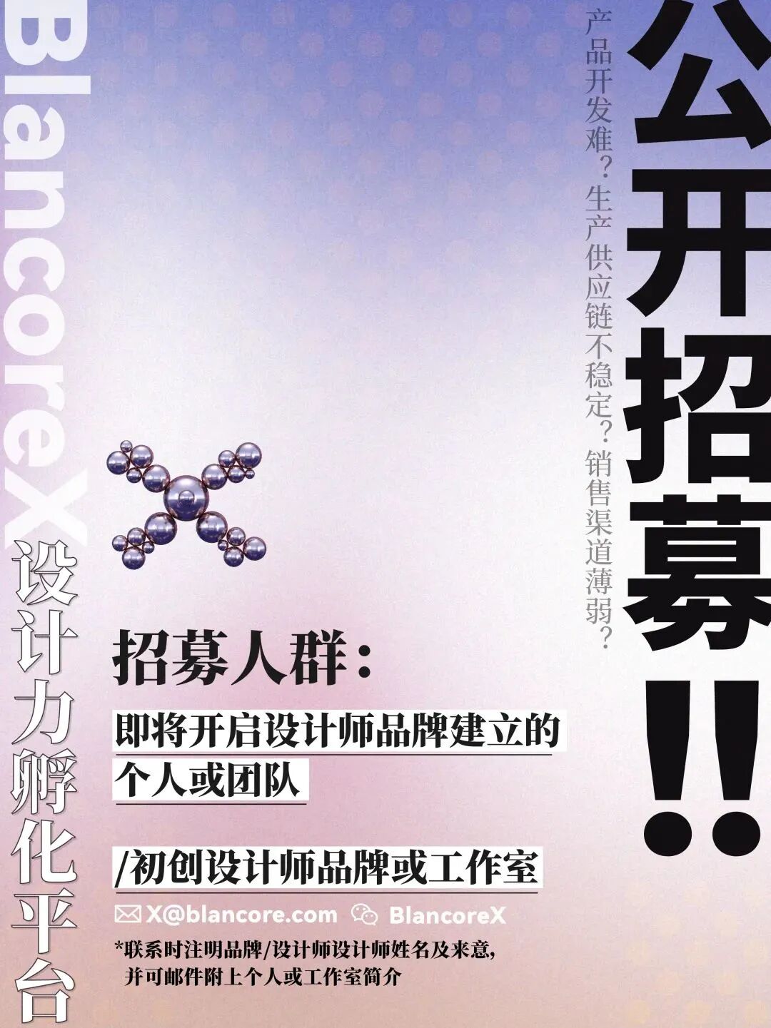 BlancoreX,作为一个多元化新生设计力量孵化平台,围绕独立设计力量,提供品牌建立、产品开发、生产供应链、线上线下销售、商业扩圈的横向扶持。加入平台,携手BLANCORE,为优秀设计师的创业减少弯路,从启点直接引向大众的视野。