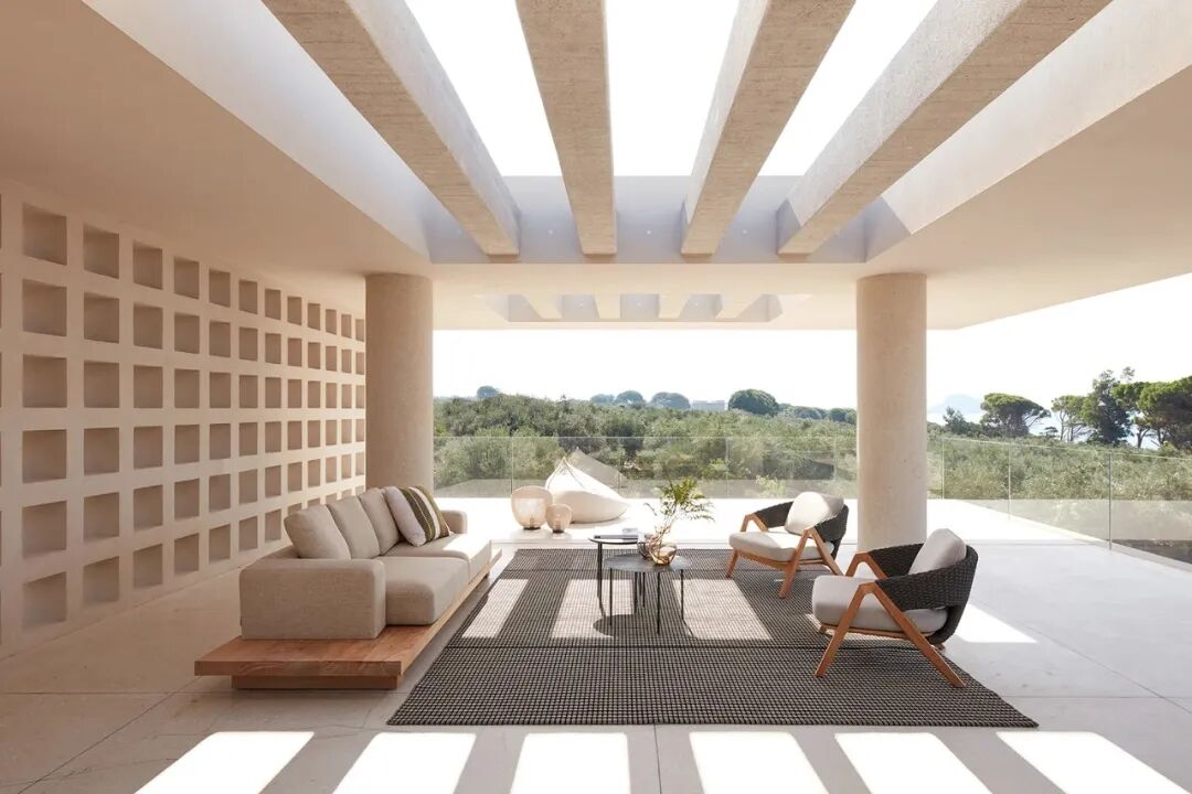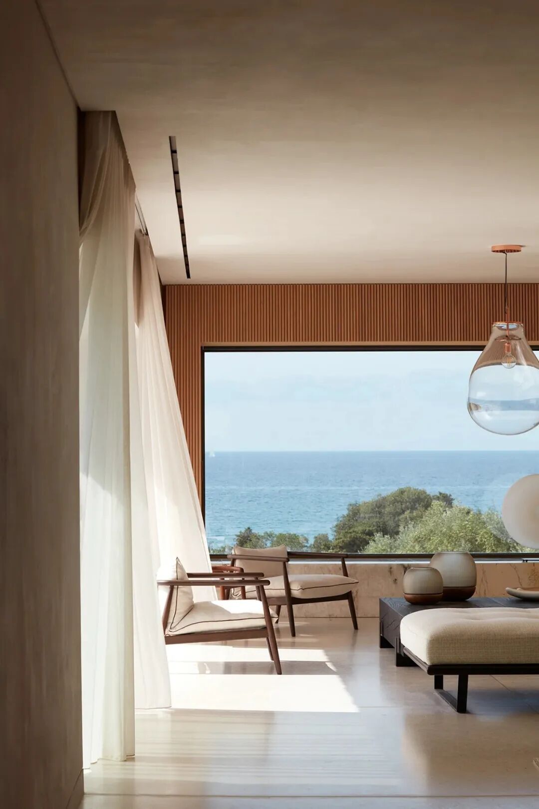 该地产位于一块宽阔、倾斜的海滨地块上。这座建筑位于现场的顶部,但仍然舒适地远离庄园的边界,保持低调,几乎看不到街道。周围被当地的地中海植被所吞没,包括橄榄树林,这既丰富了景观,又增强了居民与自然的联系。它还巧妙地隐藏了房子,不让别人窥探。