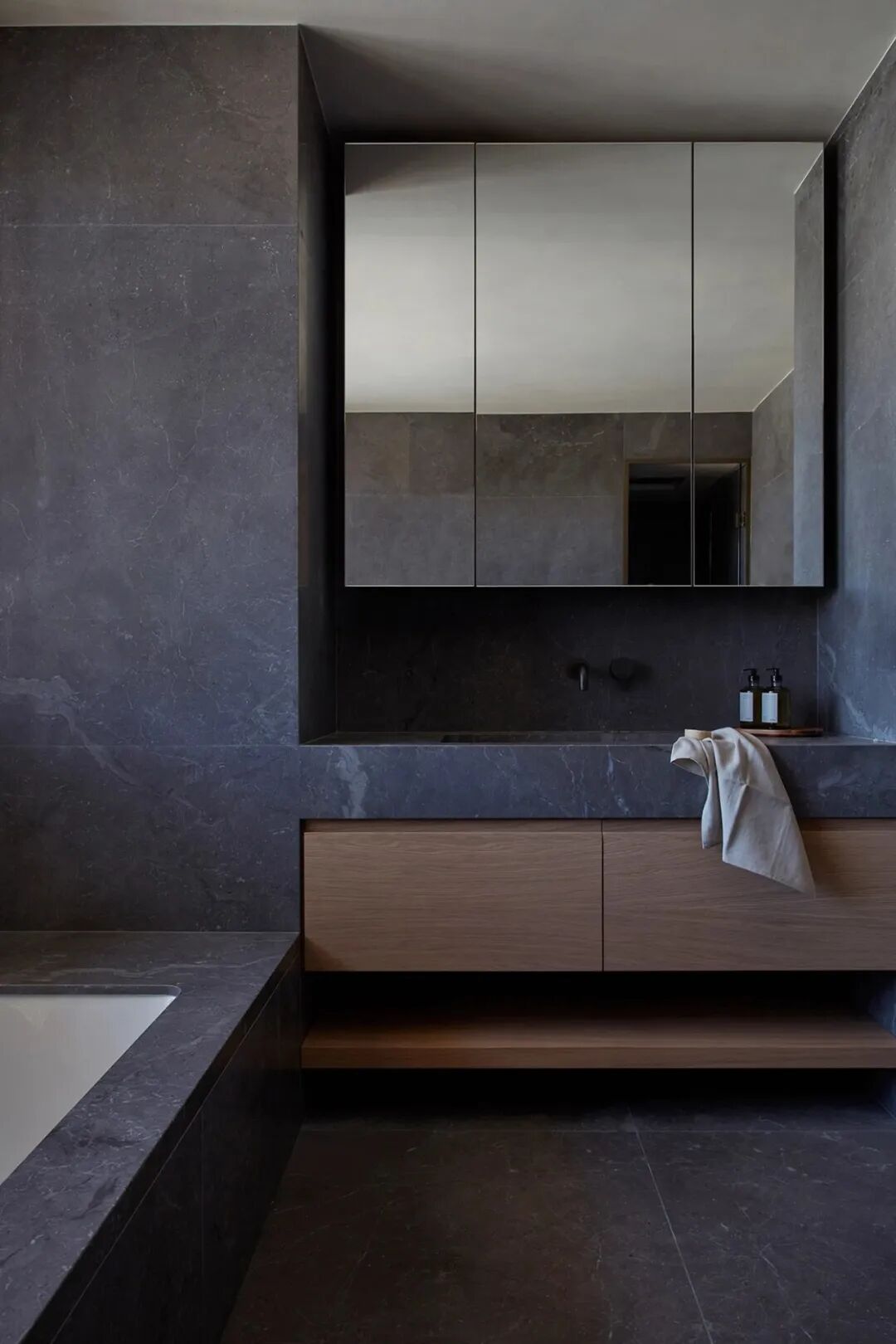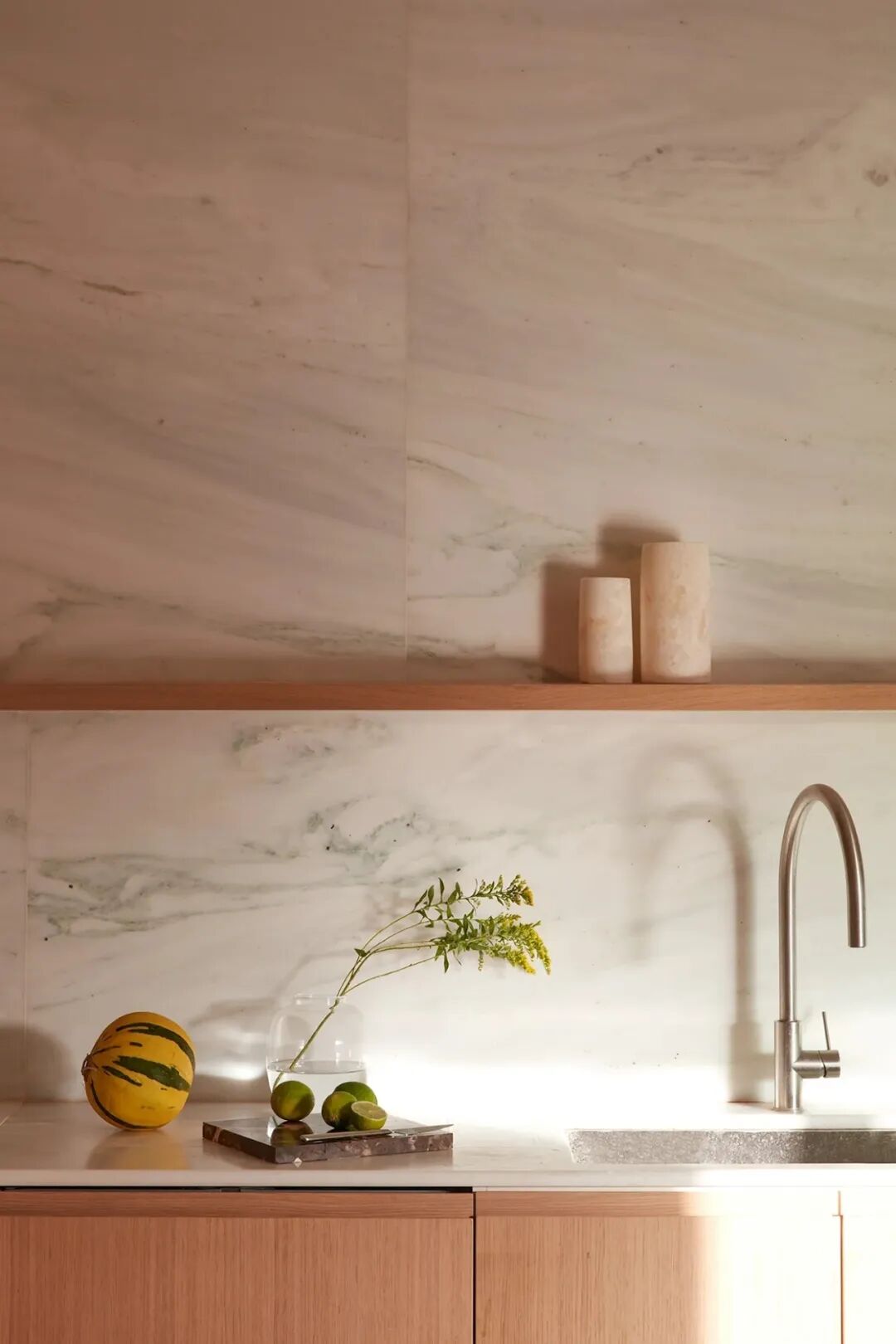 The interior composition is built around the clean yet warm and textured organic minimalism that defines Block722’s work. The material palette includes dark and light timber (predominantly oak) for floors and joinery, light coloured marble, metal, and soft white walls.