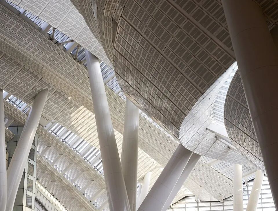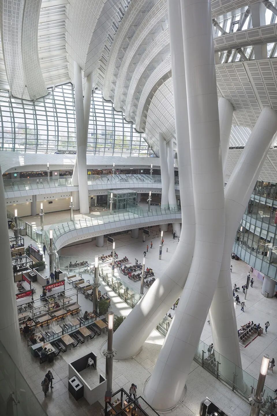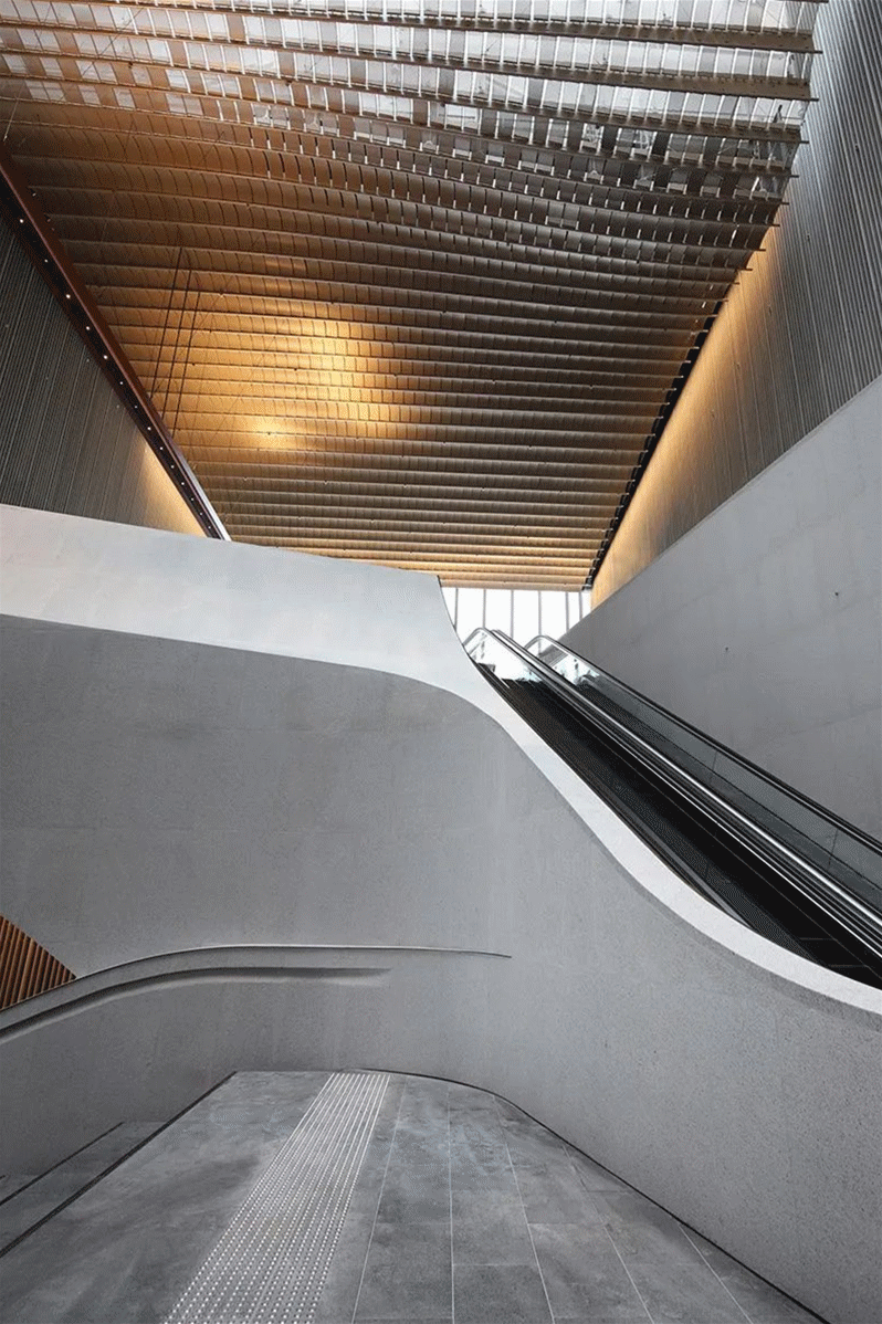 外侧的地面层朝入口向下弯曲,而上方的屋顶结构指向天空。由此打造出一个45米挑高的空间,将聚焦点集中于南立面,望向香港中环的天际线和太平山顶及远处。设计鼓励并引导人们登上车站的屋顶,置身于郁郁葱葱的树木和灌木从,享受全新的景观,并与城市建立新的联系。
