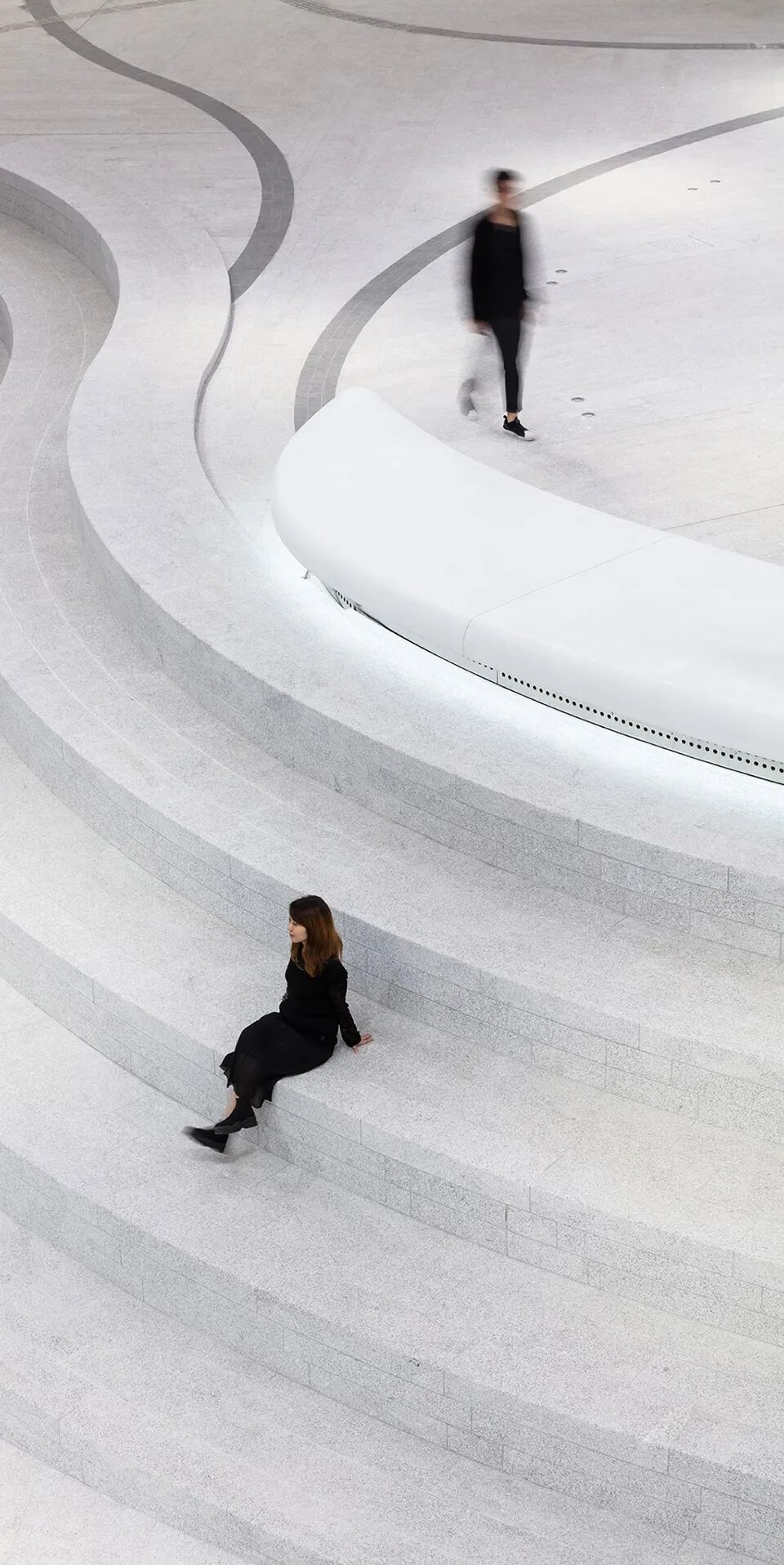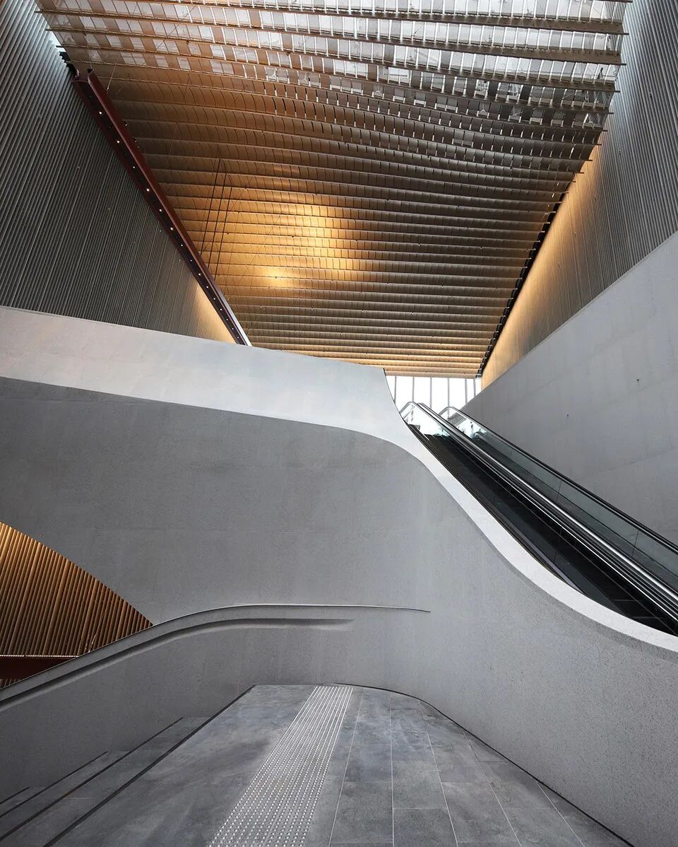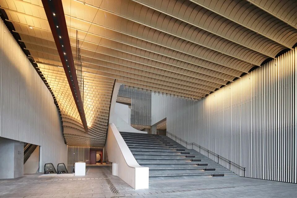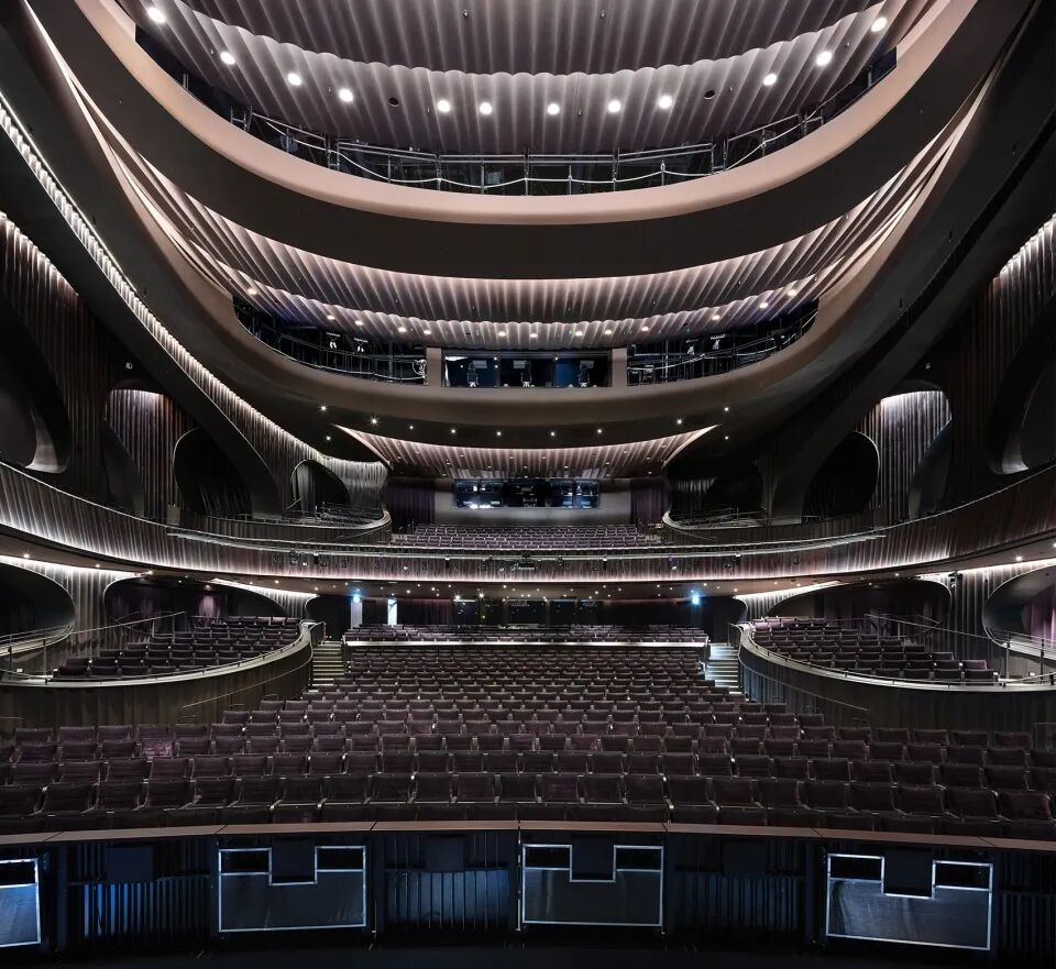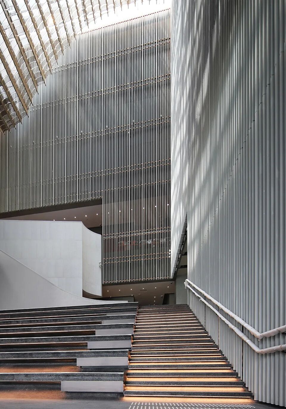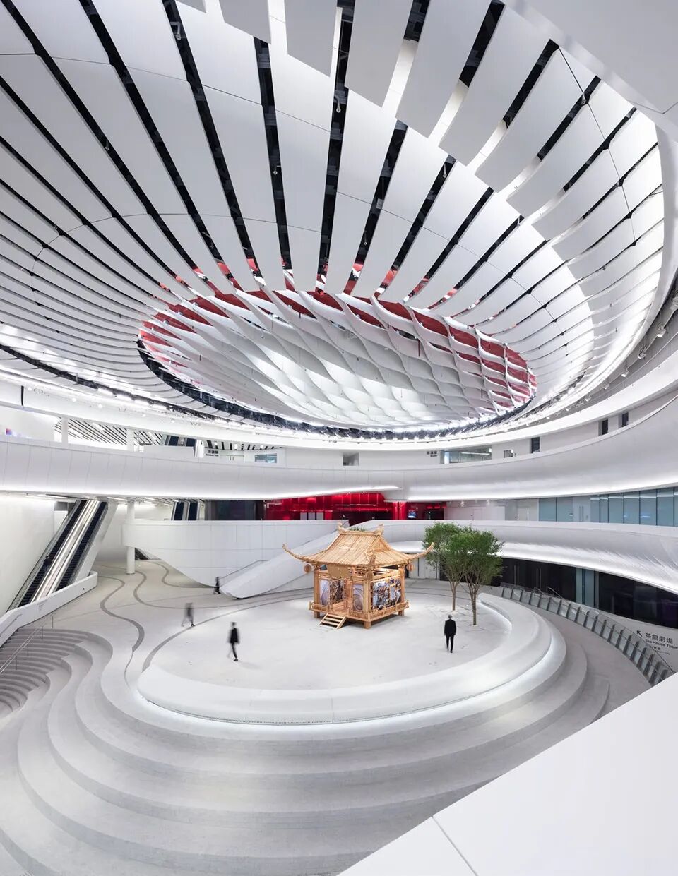 曲线型的路径环绕着宽阔的圆形中庭,展现出一种以“气”为主题的设计概念。闪闪发亮的外立面上,流线型的图案重新诠释了剧院的幕布与华丽戏服的裙摆,由CNC切割的航海级铝管构成的模块化系统为建筑赋予了优质的性能和引人注目的外观。这些交错排布的、如鳞片般的表面散发出一种迷人的光彩,使建筑看上犹如旧时在珠帘背后闪烁的灯笼。