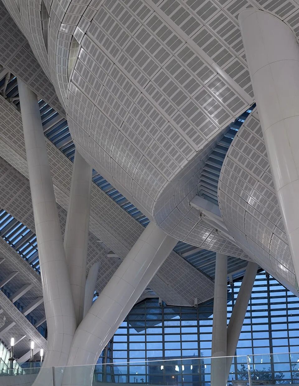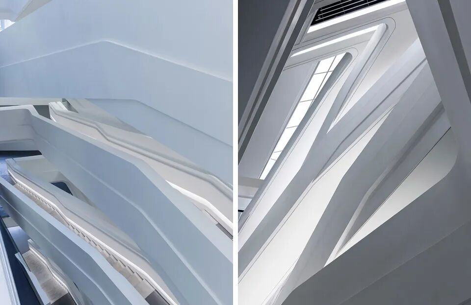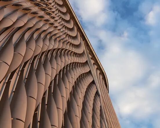 “Qi” or flow is expressed throughout the complex with curvilinear paths and forms designed around a vast circular atrium. Xiqu’s dramatic glowing curvilinear façade, which reimagines theatre drapes and the swaying folds of the performers’ magnificent costumes, comprises a modular system of scaled fins CNC-cut from untreated marine-grade aluminum pipe, selected for both its alluring aesthetic and enhanced performance. Arrayed in alternating patterns along the building, these curved fins radiate a captivating glow reminiscent of a lantern shimmering behind a beaded stage curtain, just as it might have looked in days gone by.