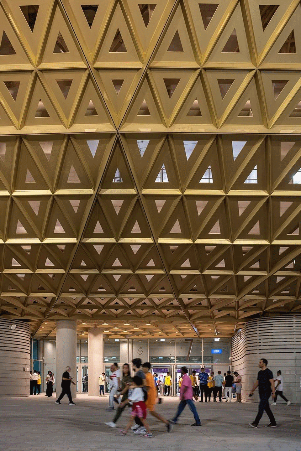 体育场的外观为一个抛光的金色容器,在阳光下闪闪发光。立面具有三角形开口,在视觉上通过斜交网格强调了碗的结构,形成了一个穿孔的屏障,为内部大厅提供了阴凉和过滤后的斑驳光线。