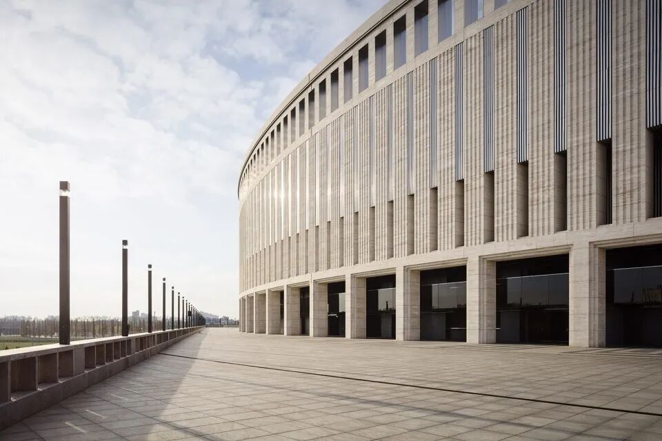 The use of concrete helps to achieve a consistency and uniformity, because it is not only a load-bearing structure, but also a part of the final shape of the stadium. The new stands use the same organizational form as the old stands: narrow horizontal gaps. The concrete main body and roof of the stadium together create a new and complete building volume, which shows the architectural and sports spirit inherited to this day with a new architectural image.