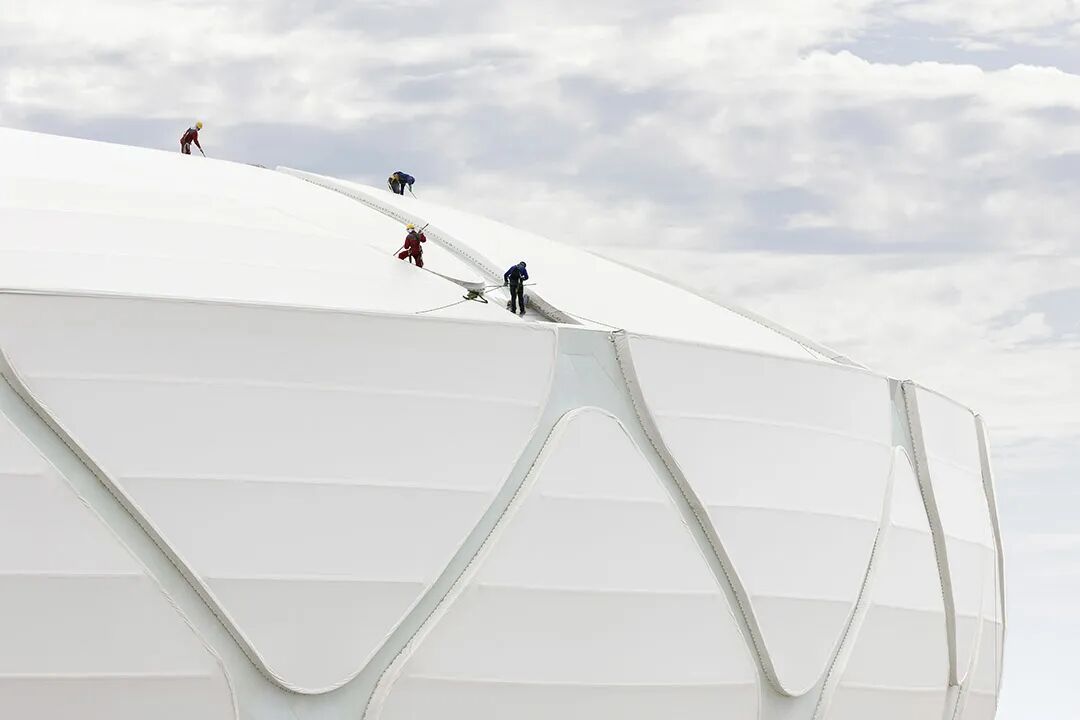 The stadium includes an adjustable roof designed by Schlaich Bergermann Partner. The bowl shaped seats are equipped with a refrigeration system to ensure that the stadium can operate well in the hot summer of Qatar. The adjustable roof adopts pleated PTFE fiber cladding and cable, which is like a sail covering the court when it is unfolded, and can provide a shady competition environment in summer.