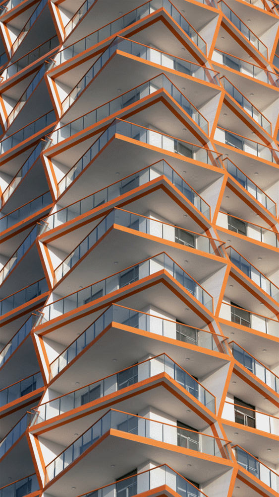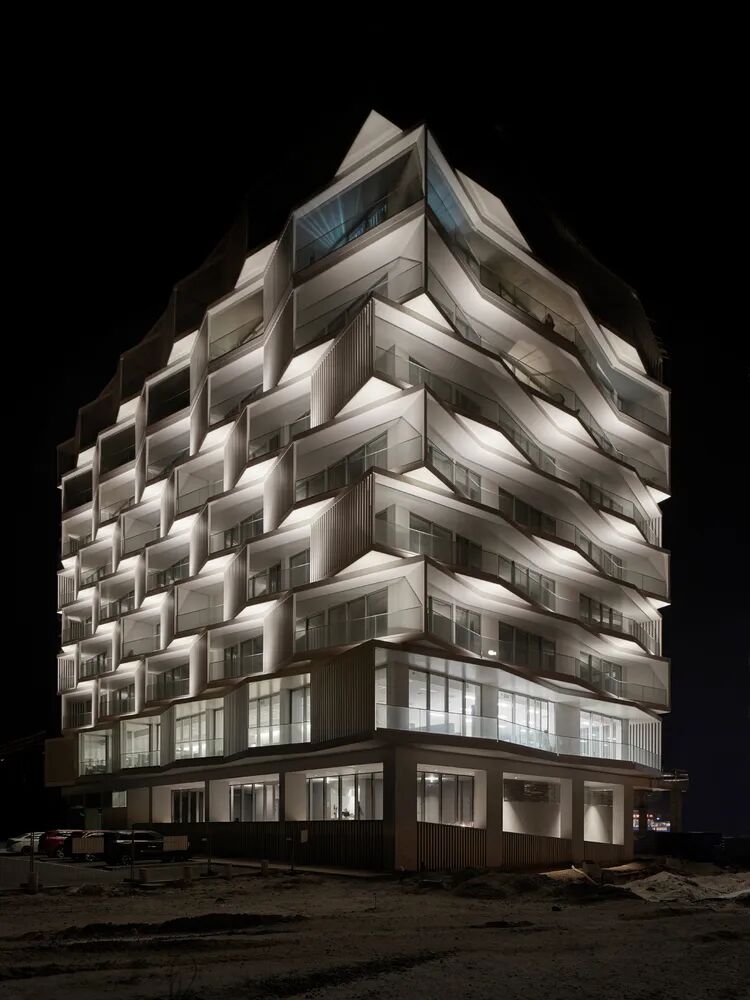 项目立面的处理从汽车和航空设计美学中汲取了灵感,构成了建筑术高超技艺的胜利。立面的轮廓创造出了体量的无穷的纹理多样性,其中空气动力学和被动式气候冷却决定了其形式。立面的体量多样性形成了该项目中住宅单元的阳台;每个单元都提供了避免阳光直接照射的庇护。