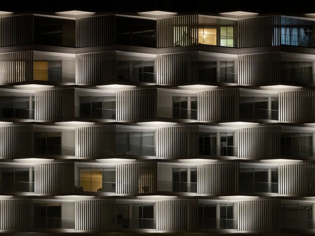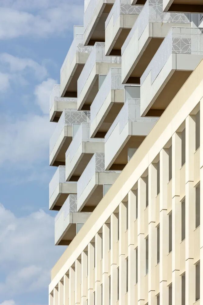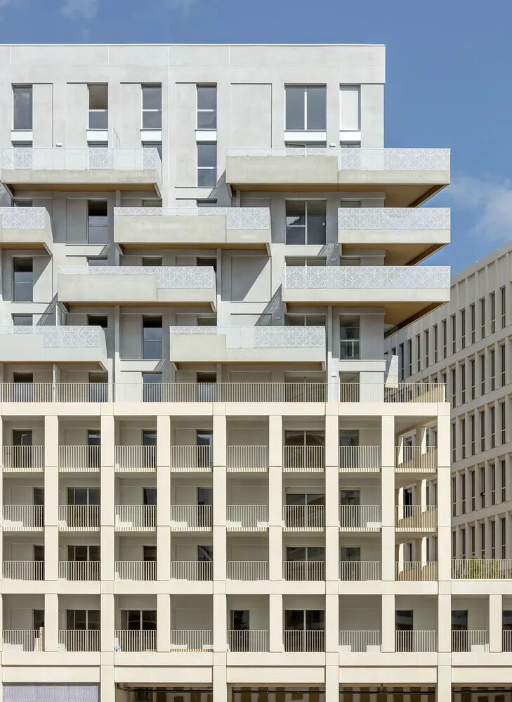 在保持相同厚度的混凝土板的同时,由于一组交错的阳台,这两座 10 层的住宅楼 L1 和 L2 在视觉上从它们的邻居中脱颖而出,打乱了它们的线性和水平外观。实体和空隙的效果使立面充满活力,打破了基地明显的水平性和梁柱框架结构的强烈表达,并将阳台分为有顶和无顶的空间。