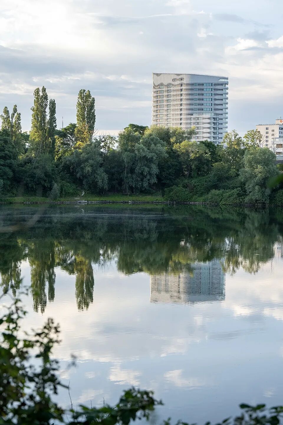 The vast panorama of the Rhine River and Dusseldorf gives this building a unique advantage. The design of perforated metal curtain wall facade provides conditions for flexible layout of open and closed areas inside the building, while creating a soft and natural space atmosphere. In the east, south and west, the wave shaped building shell opens to the surrounding environment, and also plays a necessary role in shading and wind resistance.