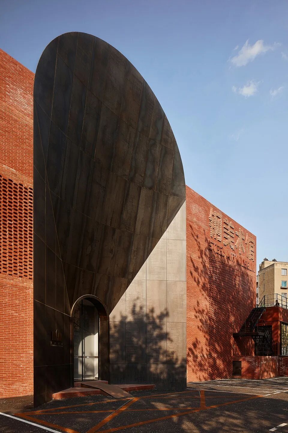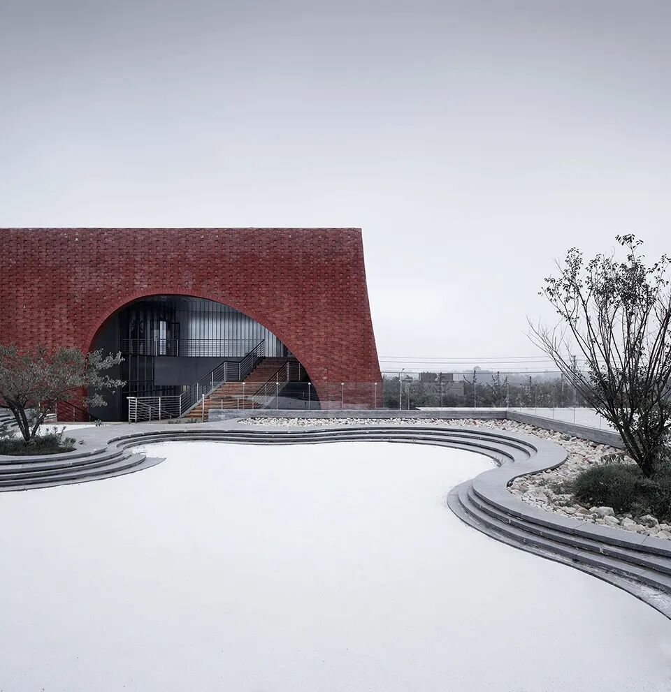 The largest exhibition hall along the street has the red-bricked exterior wall, like a condensed seal printed on the elegant scroll of ink and wash. The way of cutting the corner through the arc surface strengthens the iconic character of the building along the street, forming a unique lasting appeal. Red brick is Yixing clay brick, adopting three kinds of lining according to the different locations. The lower brick head outstand the wall, and the upper part intrudes the wall, and cut part is flatly lined, forming different textures.
