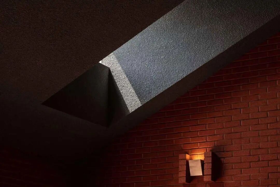After opening the door, there is an external courtyard. The courtyard is surrounded by multi curved geometric walls, which create an impression of the sky. The uniqueness of this curved space is the constantly changing light and shadow. These changed lights and shadows usually appear on the ground around 11 o'clock in the morning, and they appear in different spaces at different times.