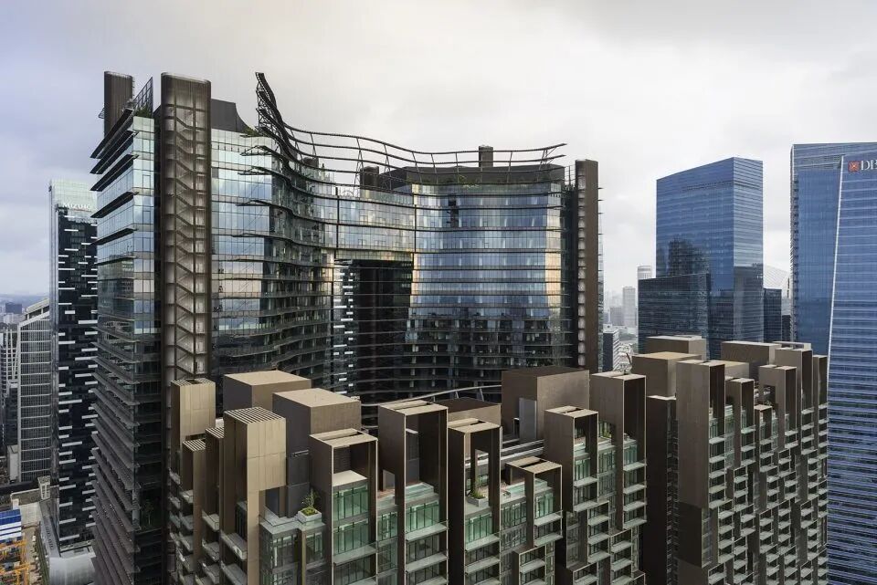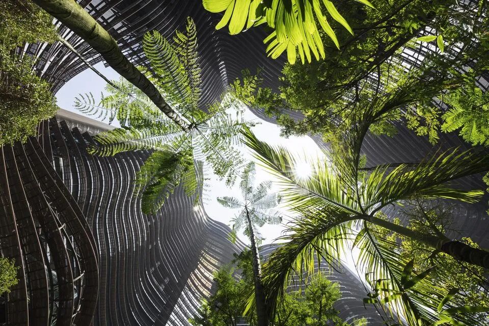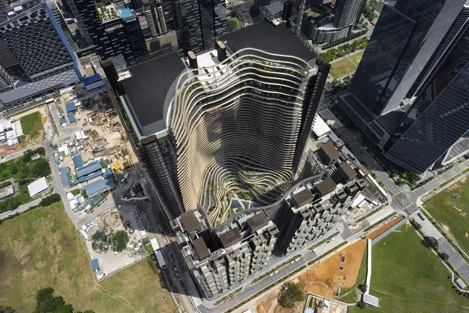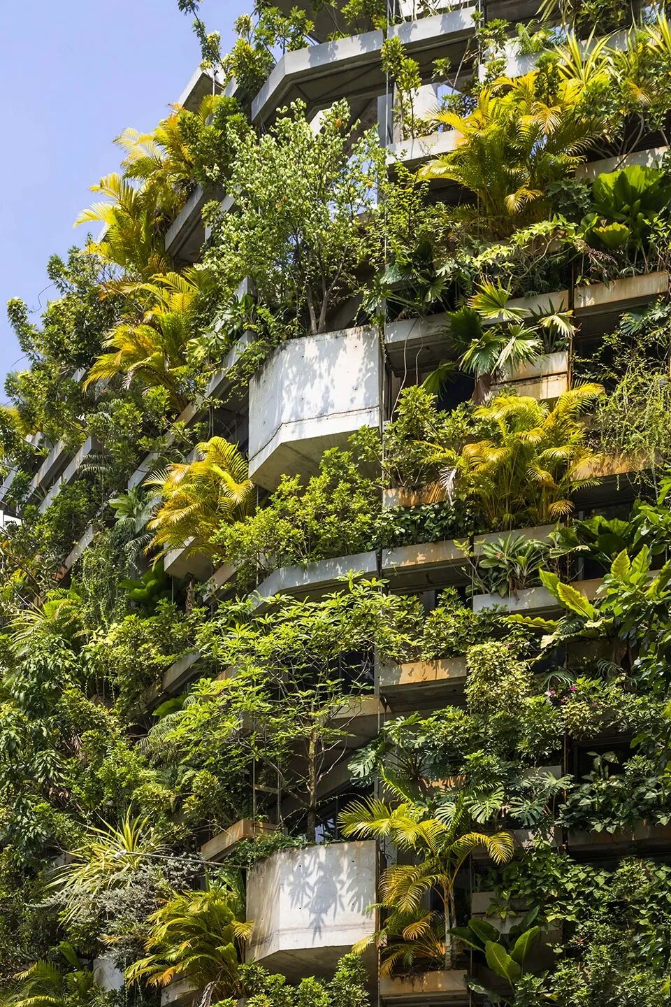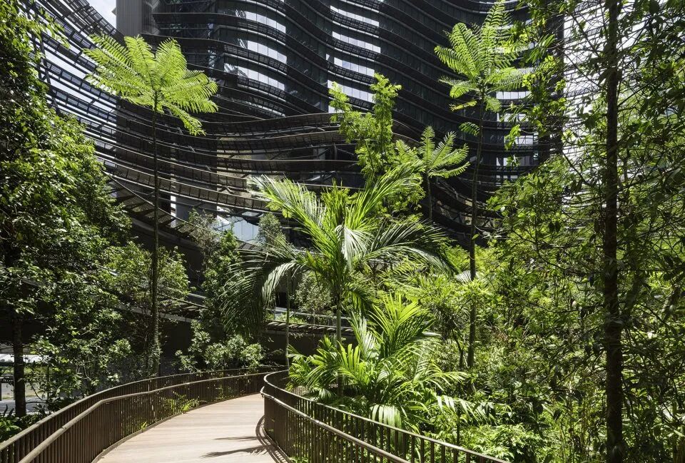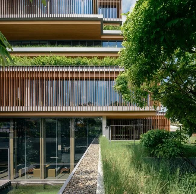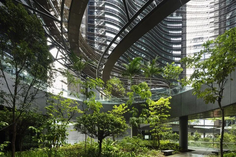 标志性的百叶窗为综合体带来了动态的外观,大面积的绿化区在改善微气候的同时还增加了生物多样性。以亚洲常见的水稻梯田为灵感,由四栋建筑围合起来的中央地带呈现出多层次的立体效果,展现出热带风情的多样性,营造出一个全新的生态。“绿色之心”种植着超过350种不同的树木和植物,包括700棵树,以及3万7千平方米的景观区域。另外还有多种类型的动物在此栖居。参照热带雨林中自然气候的垂直分层,景观设计师模拟出了一个绿色的山谷,使其气候根据层级发生变化。建筑中的餐厅、咖啡厅、健身俱乐部、游泳池、超市、美食街以及位于户外平台的各种活动区域不仅仅服务于居民和办公人员,更提供了社交与互动的场所。