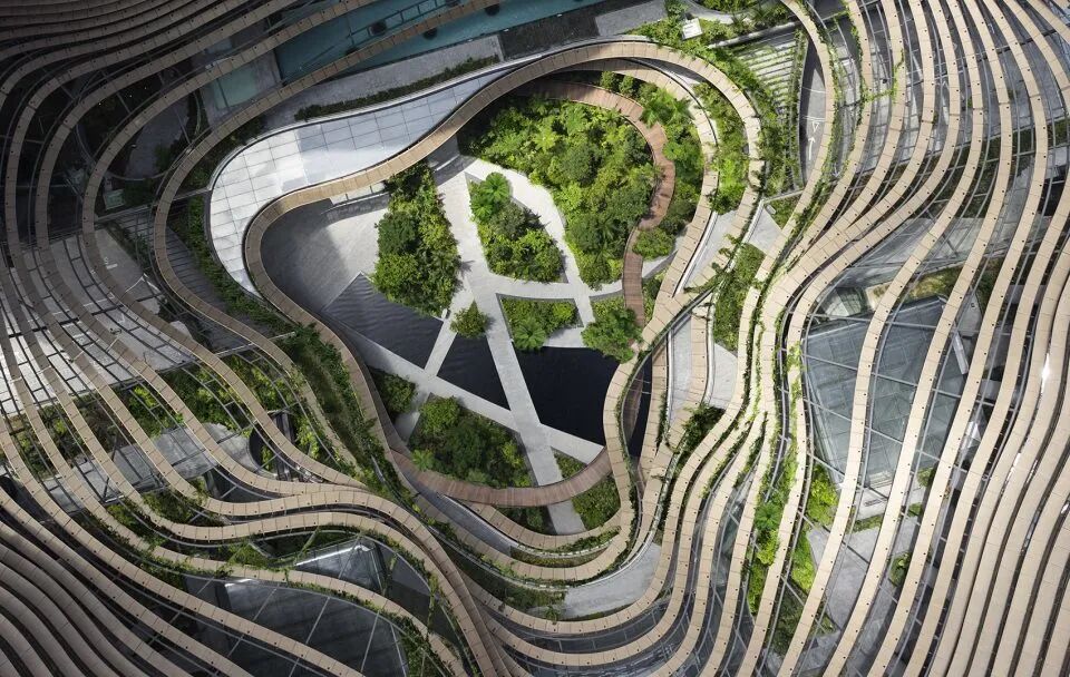 The organic shape of the building complex with its iconic louvres, and the generous planting, contribute to an improvement of the microclimate and increase biodiversity. Inspired by Asian paddy field terraces, the green center formed by the four towers—with its multi-story three-dimensional gardens—reflects the diversity of tropical flora and creates a new habitat. This Green Heart comprises over 350 different types of trees and plants, including 700 trees, on a landscaped area of 37,000 square meters. Various types of animal become part of this biological diversity. Inspired by the natural climate changes at the different vertical levels of a rainforest, the landscape architecture mimics a green valley with its variations in climate according to level. Restaurants and cafés, retail areas, a fitness club, pool, supermarket, food court, and event areas on the different open terraces not only provide products and services to the residents, office workers, and visitors—they also create a place for social interaction.
