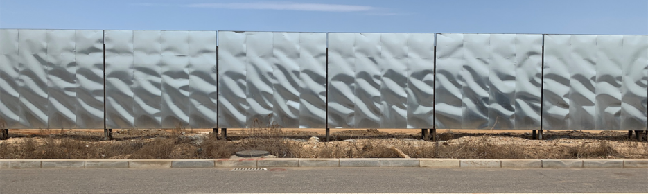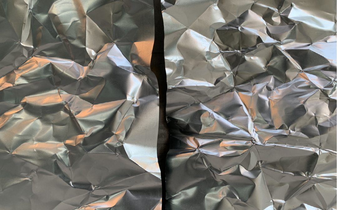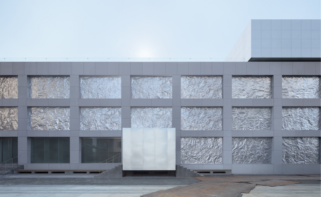 我们用的材料是常见的材料,但是特殊的是在于用在外立面上。这是镀锌钢板,常见用在马路的围墙,类似于工业的钢板,是比较便宜的工业材料,平常一般不太会用于建筑装饰。我们希望用这个材料做成这样的效果,有点像是A4打印纸用手折了之后再打开这样,出现不规则的、随机的凹凸感。于是我们开始思考怎么做金属板,什么样的方式可以做成这个东西。